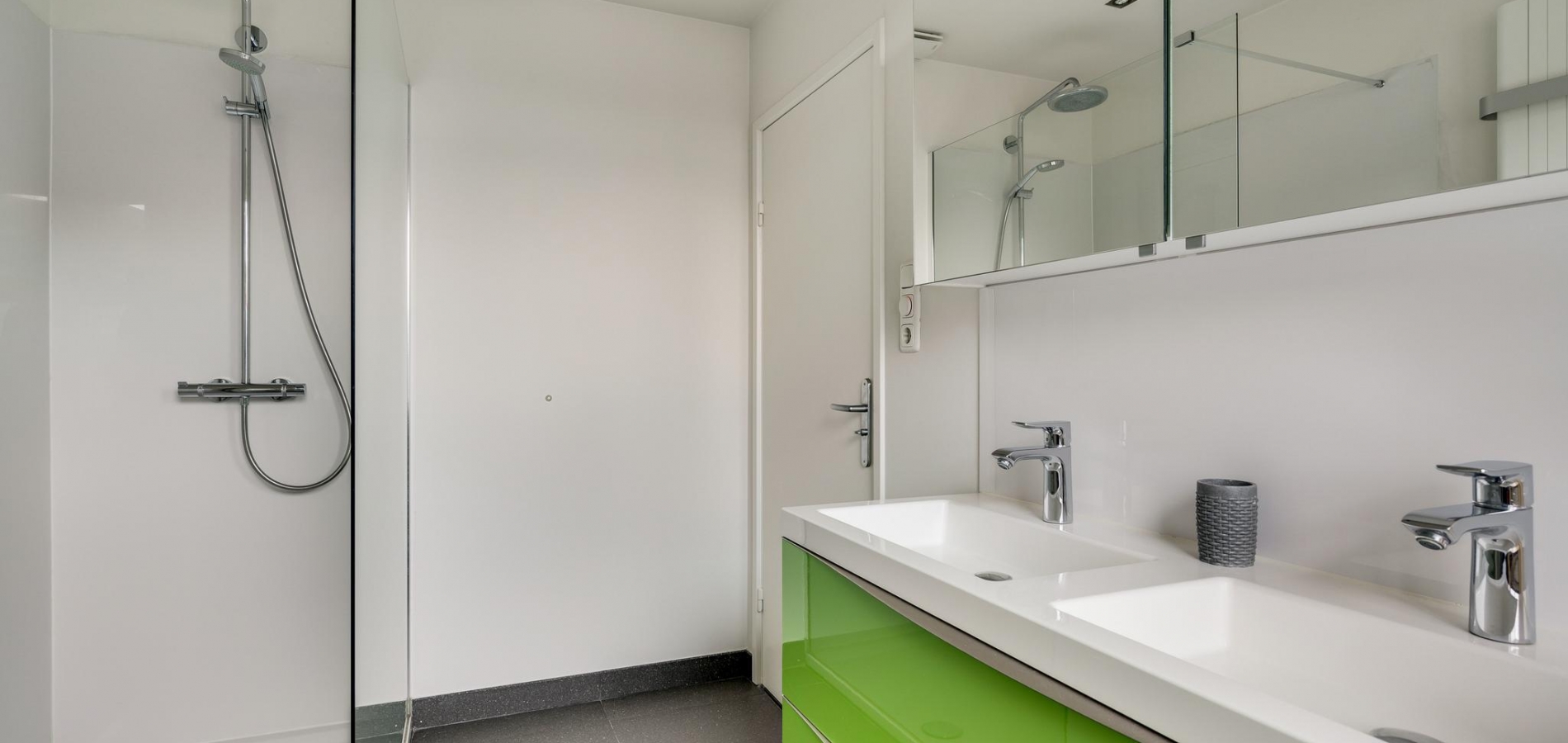 In de ruime, in 2015 gerealiseerde badkamer (circa 3,39 x 2,03) is stucwerk gecombineerd met mooi tegelwerk en modern sanitair. U heeft de beschikking over een ruime douche, designradiator, wandcloset en een dubbel wastafelmeubel met spiegelkast.
