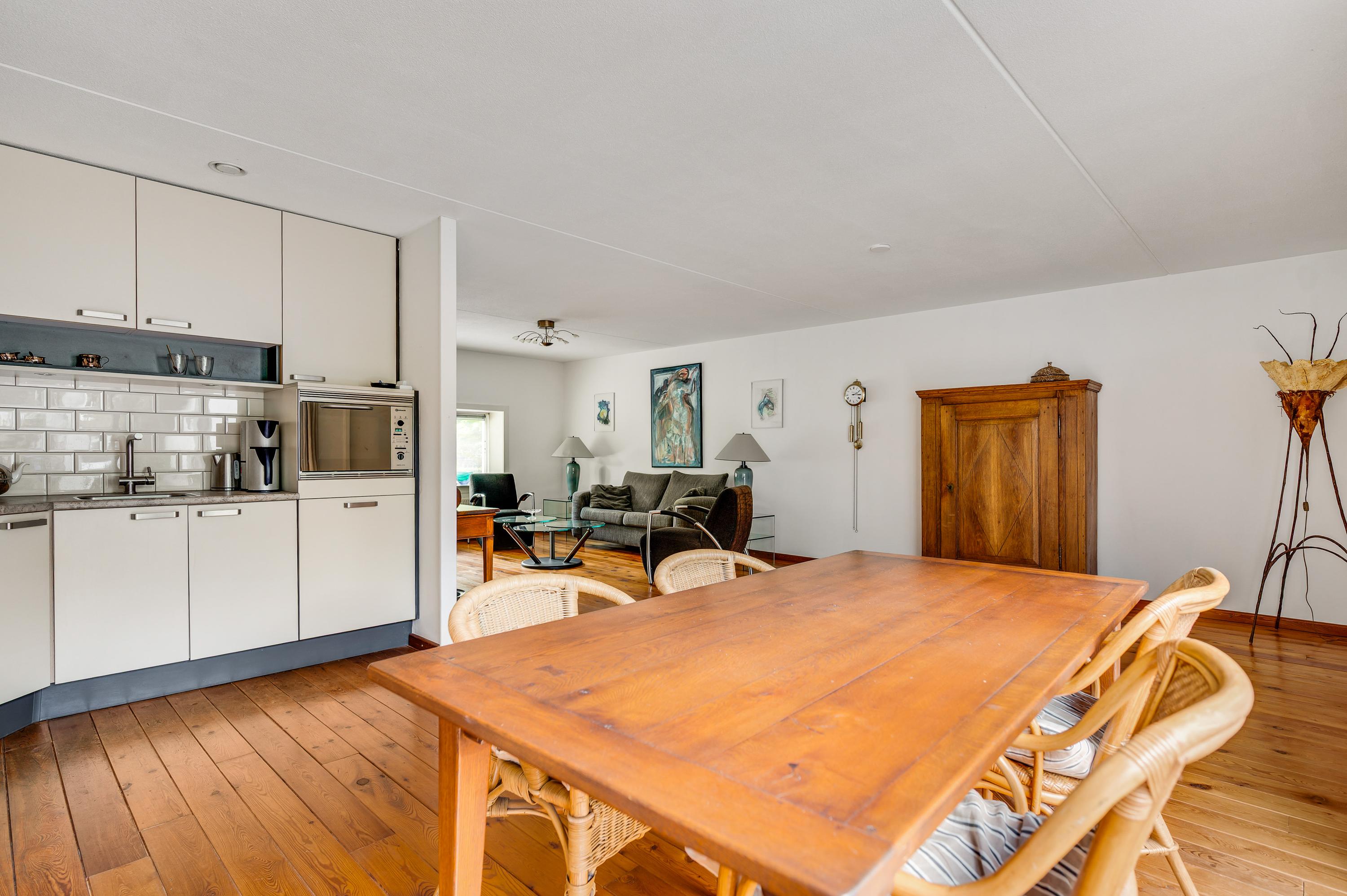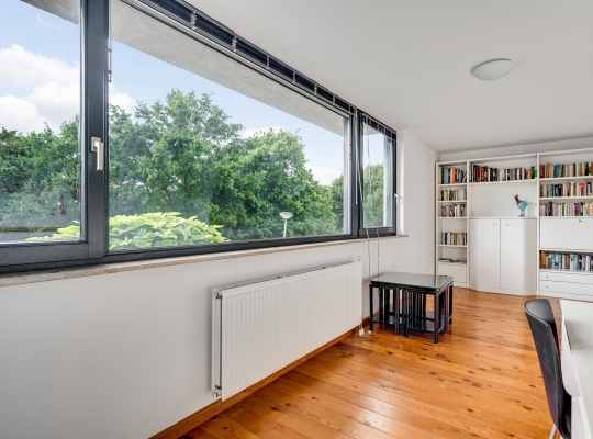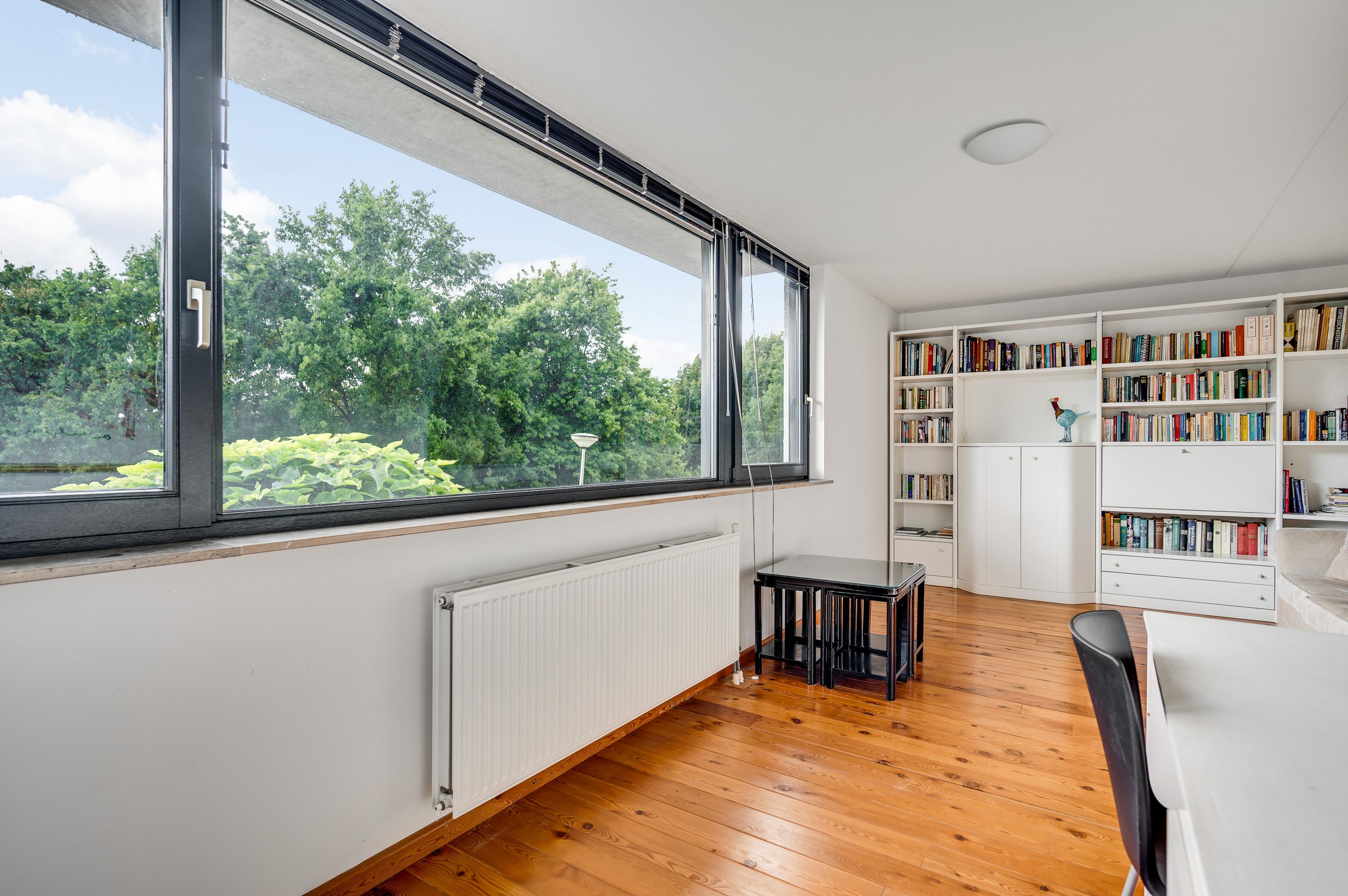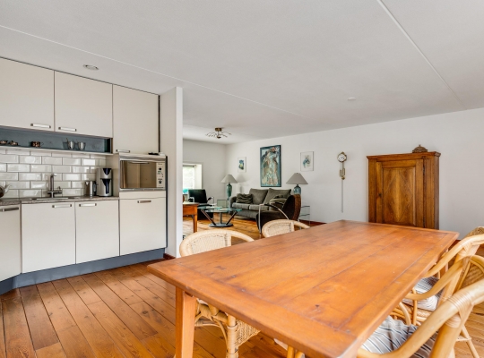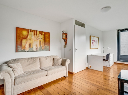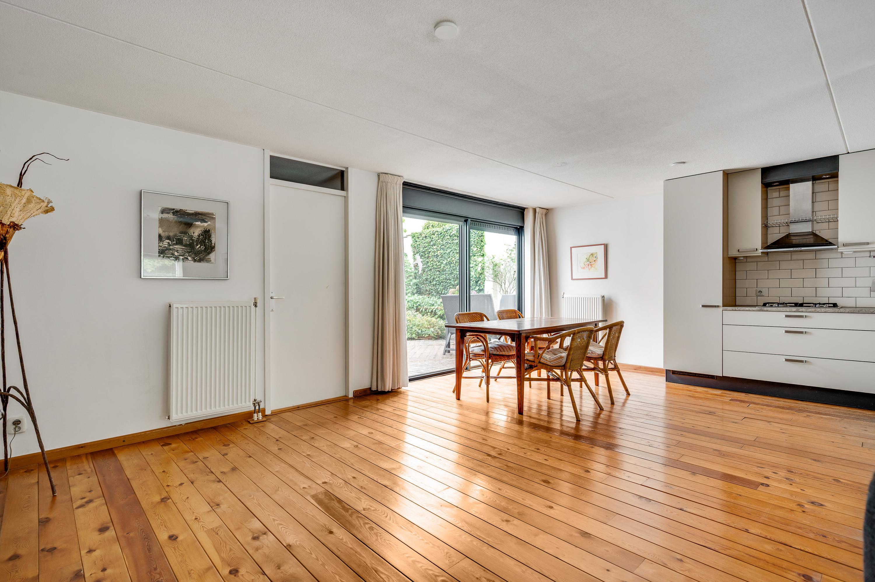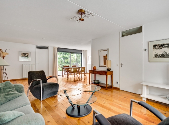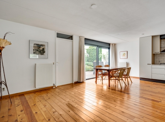 De woonkamer heeft, inclusief keuken, een oppervlakte van circa 45 m2 waardoor er genoeg plek is voor al uw meubels. Het zitgedeelte is aan de voorzijde, met prachtig uitzicht naar het groen, en in de keuken staat de eettafel. Een grote schuifpui zorgt voor een mooie verbinding met het terras in de achtertuin.