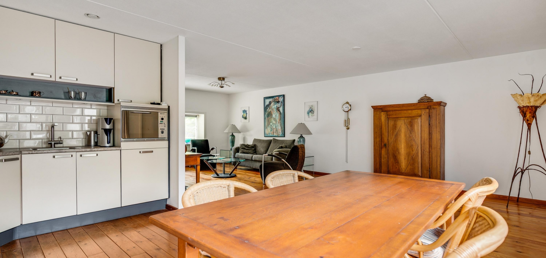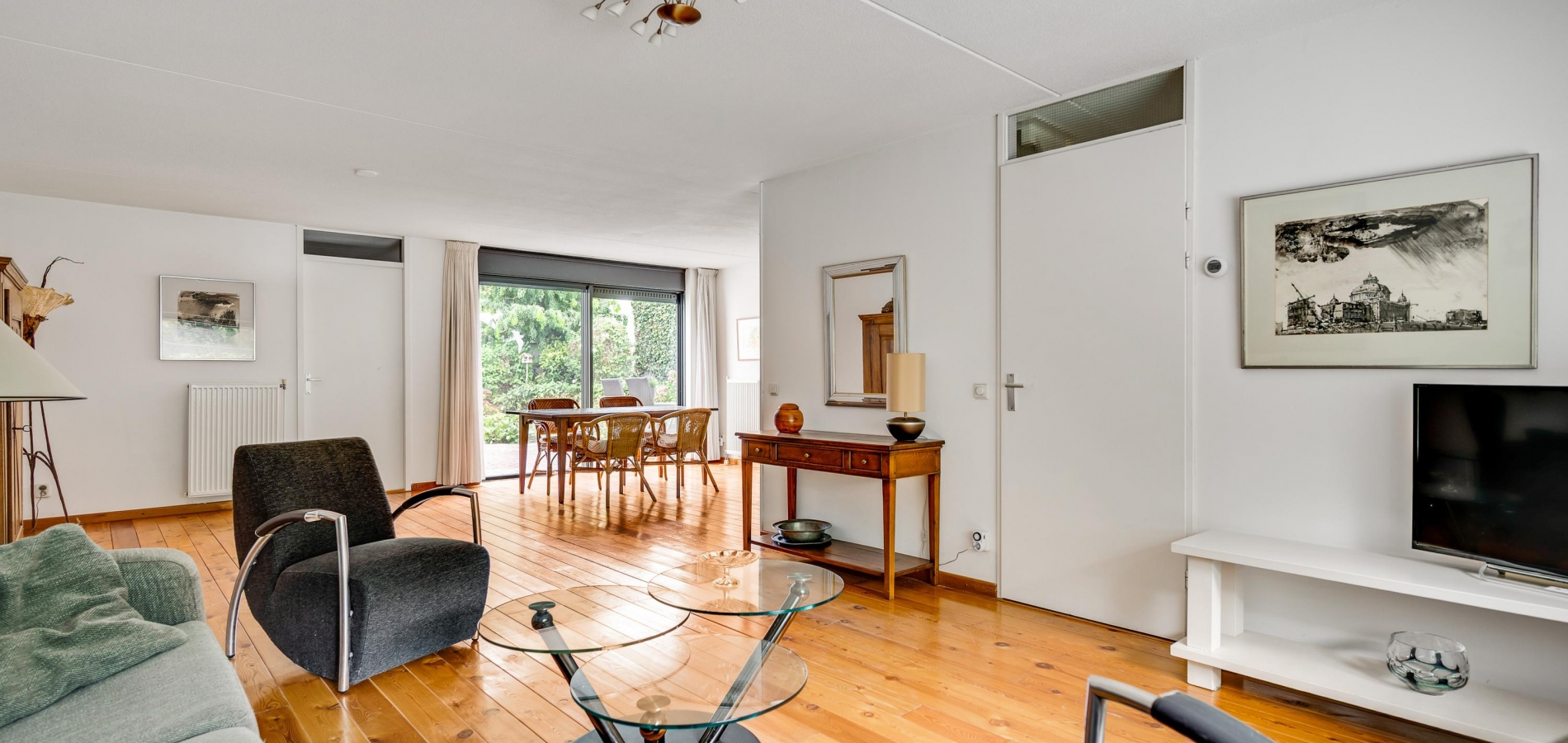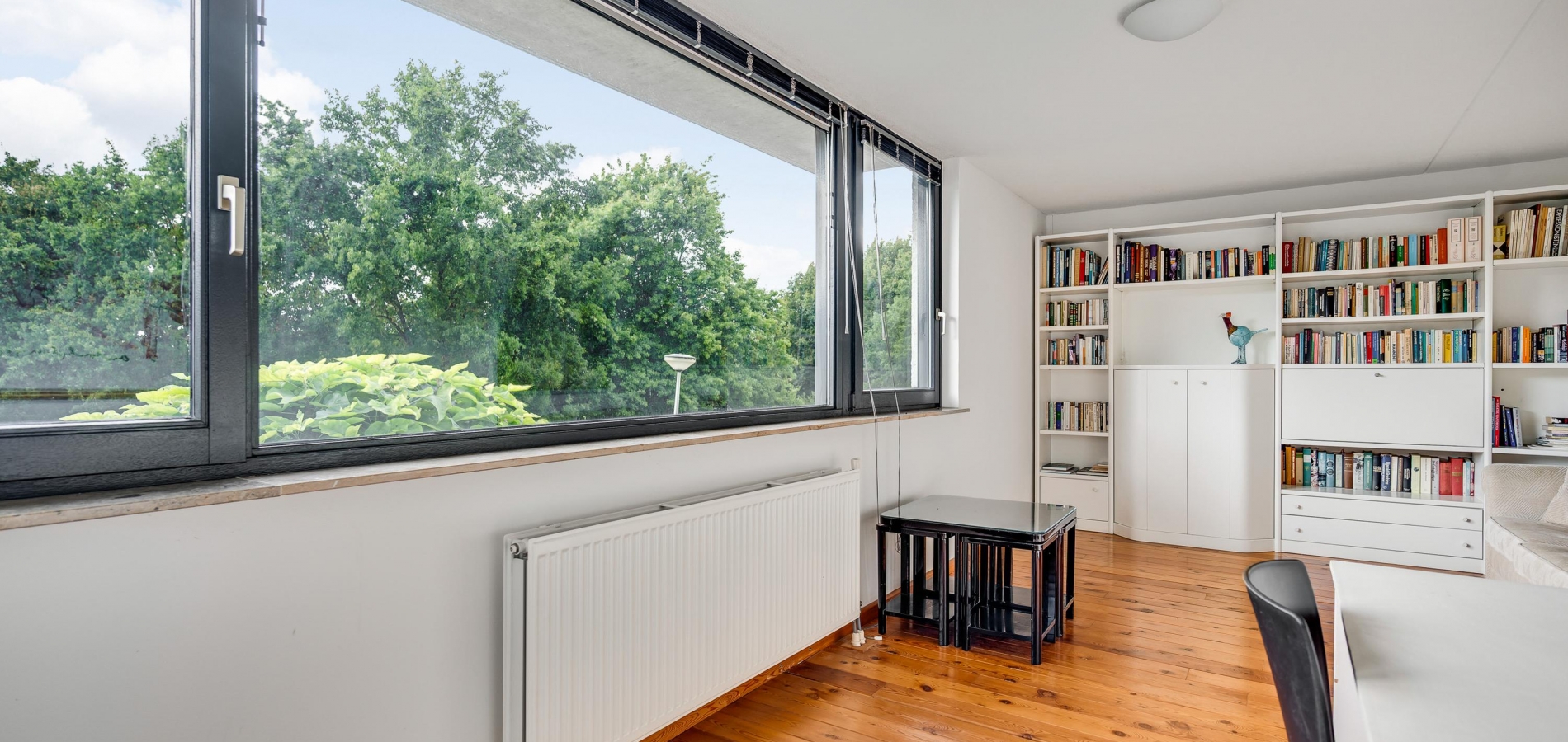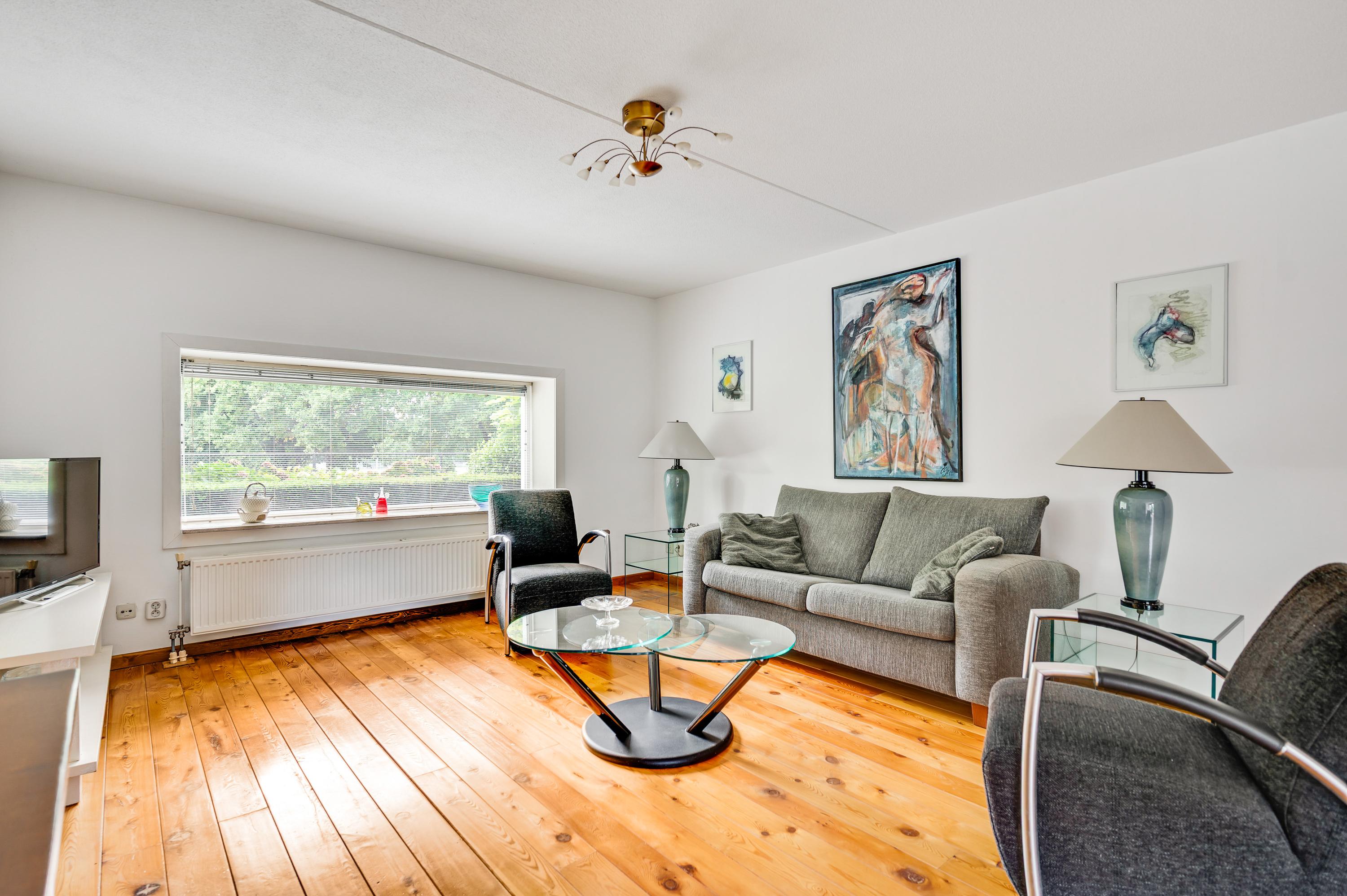 De woonkamer heeft, inclusief keuken, een oppervlakte van circa 45 m2 waardoor er genoeg plek is voor al uw meubels. Het zitgedeelte is aan de voorzijde, met prachtig uitzicht naar het groen, en in de keuken staat de eettafel. Een grote schuifpui zorgt voor een mooie verbinding met het terras in de achtertuin.