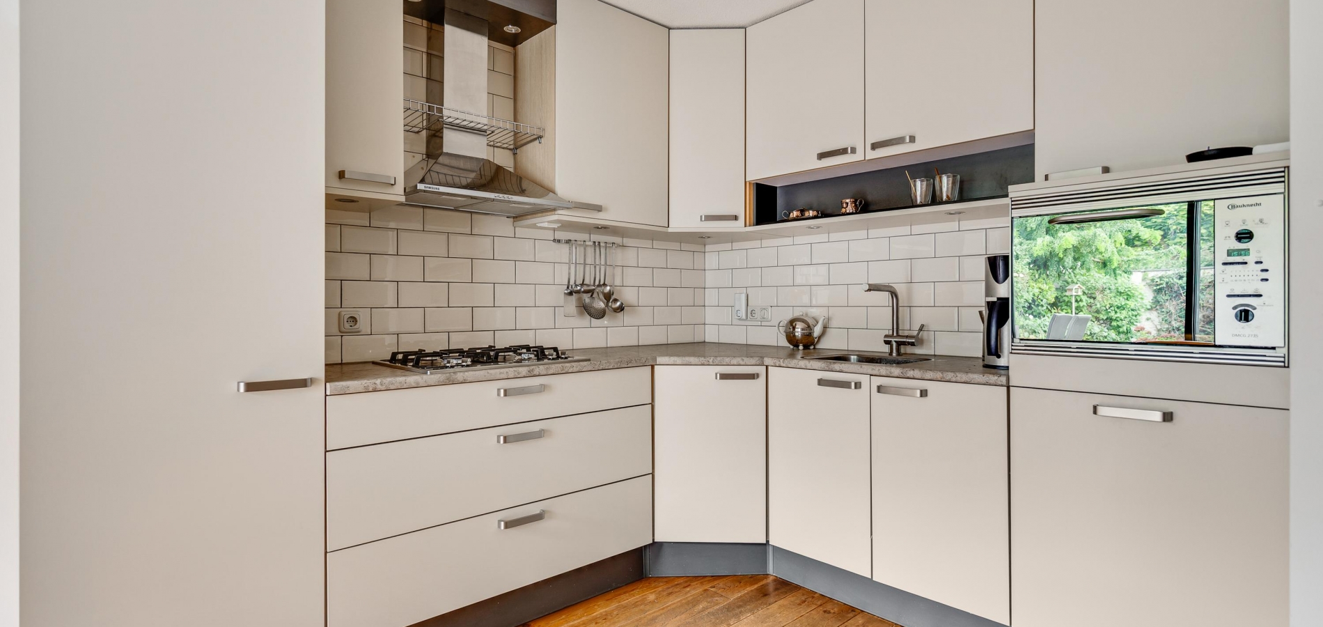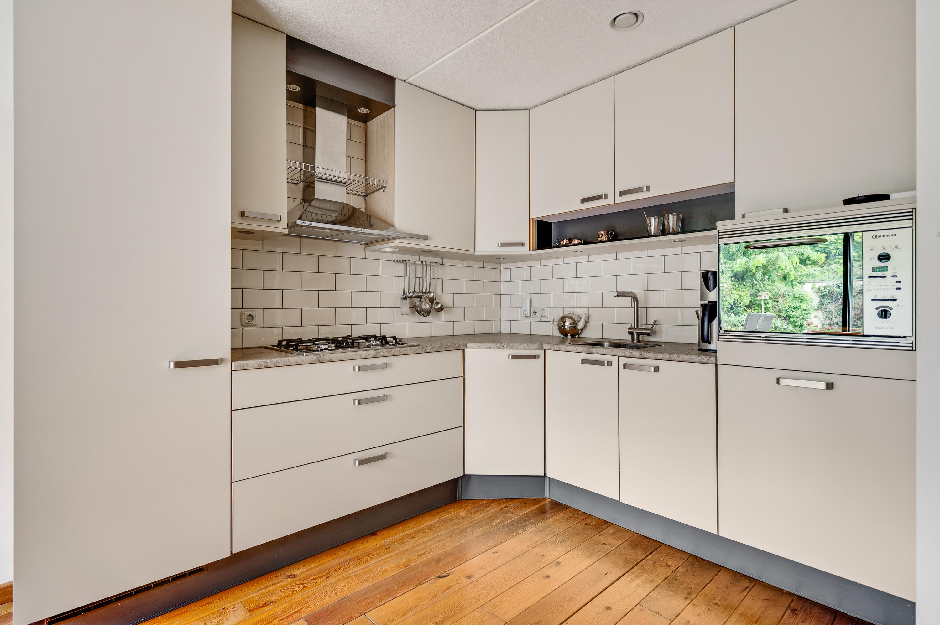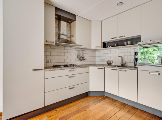 Uw oog valt op de lichte keuken in een nette hoekopstelling, met hoge bovenkasten en een kunststof aanrechtblad in een natuursteen-look.