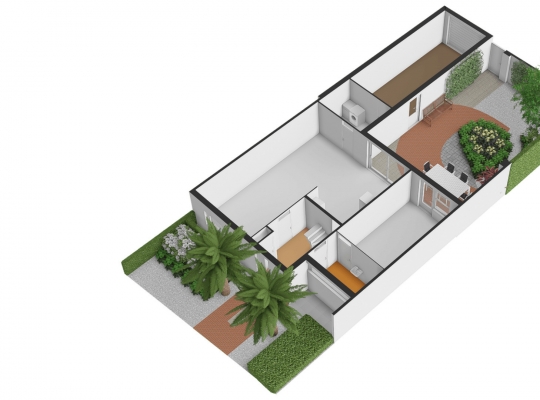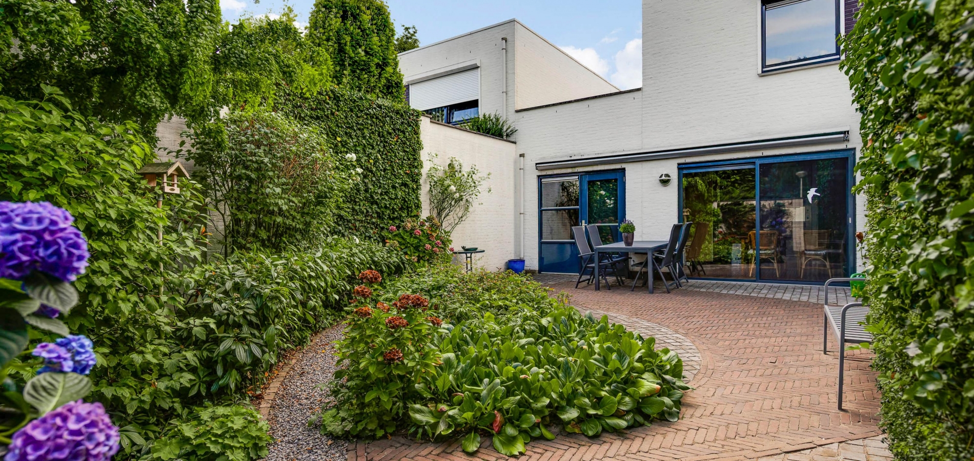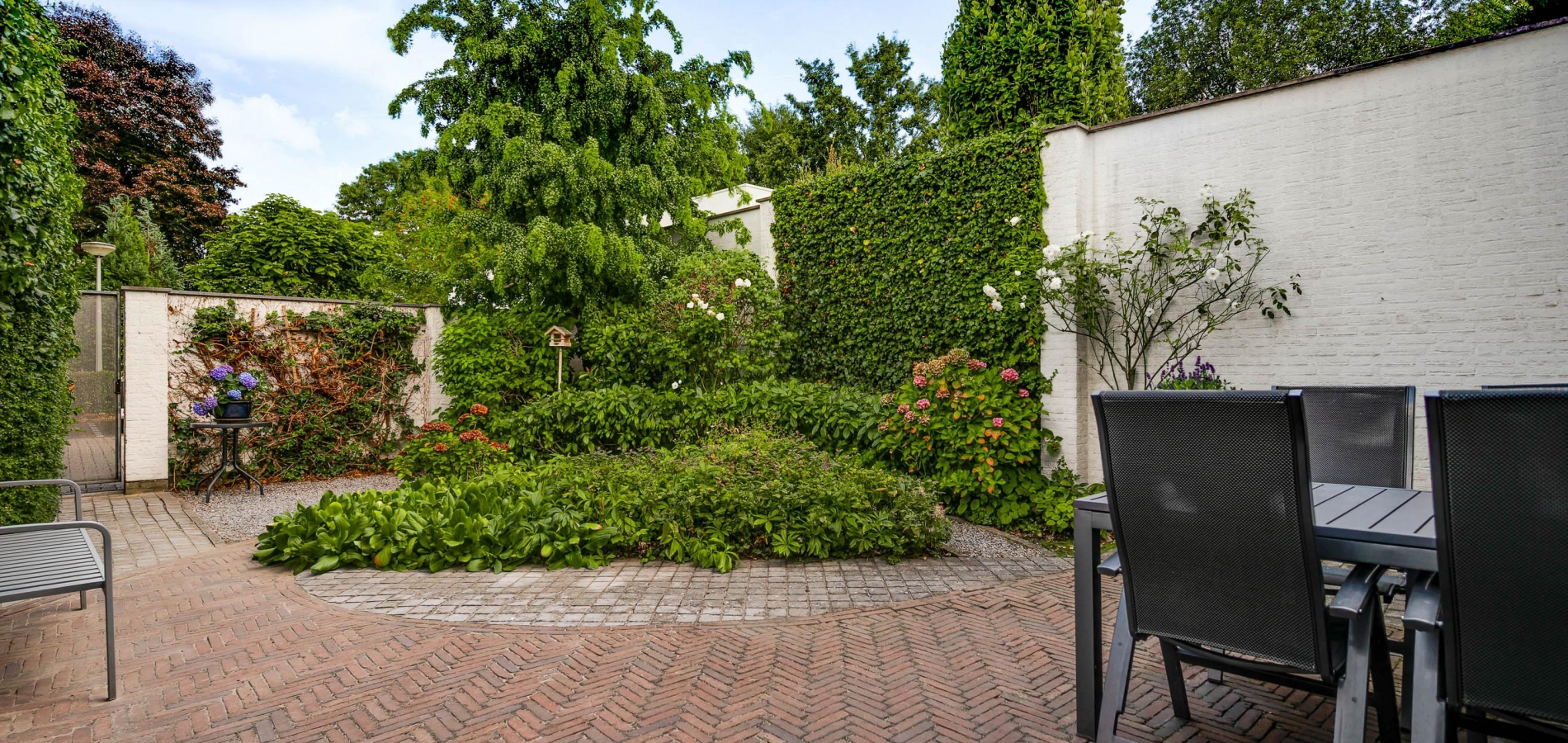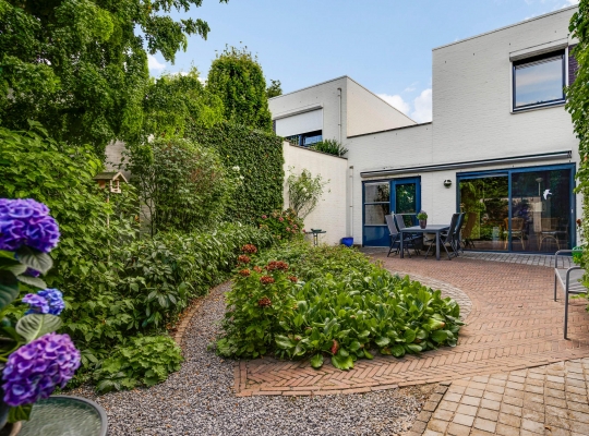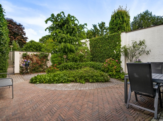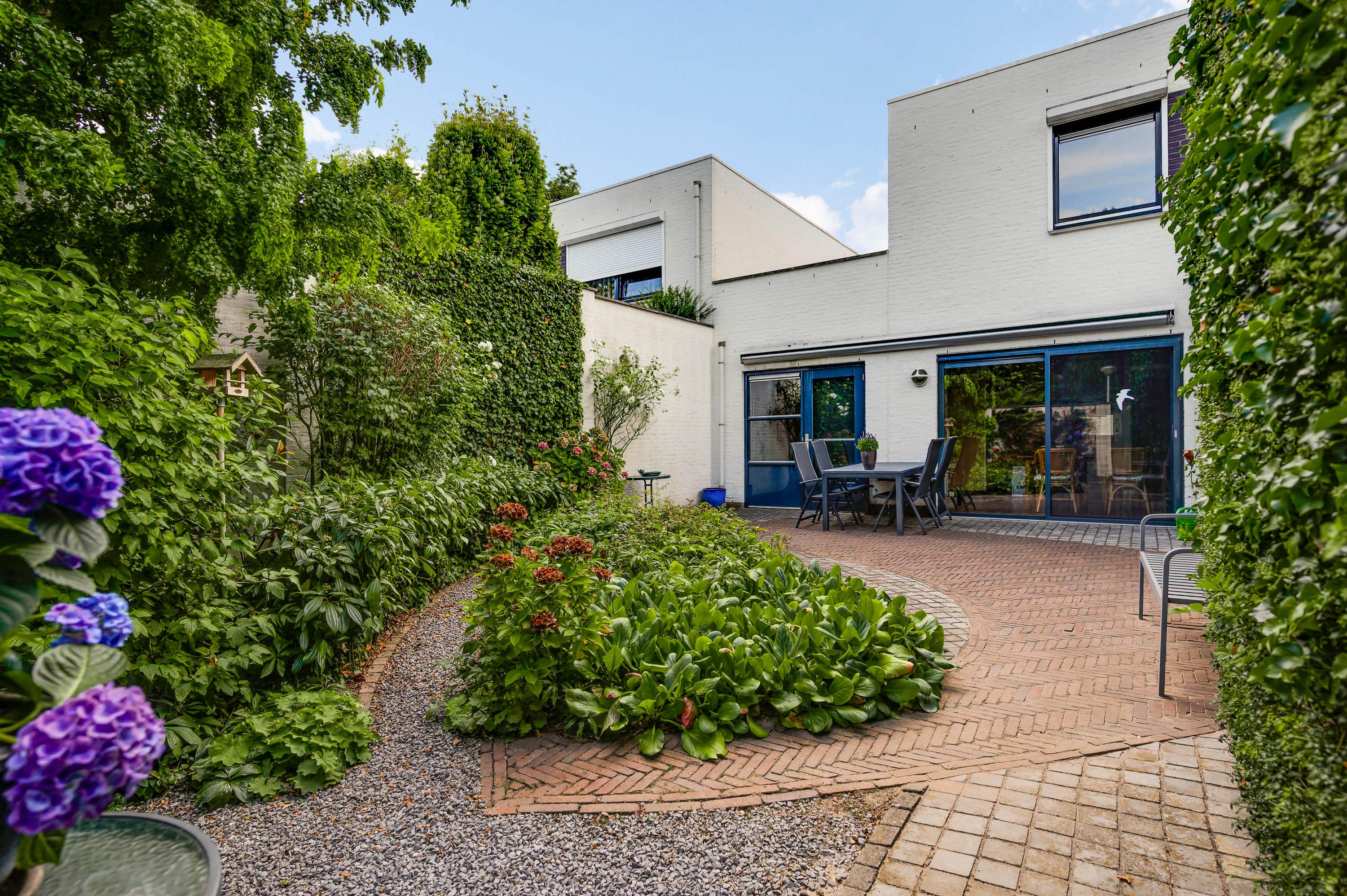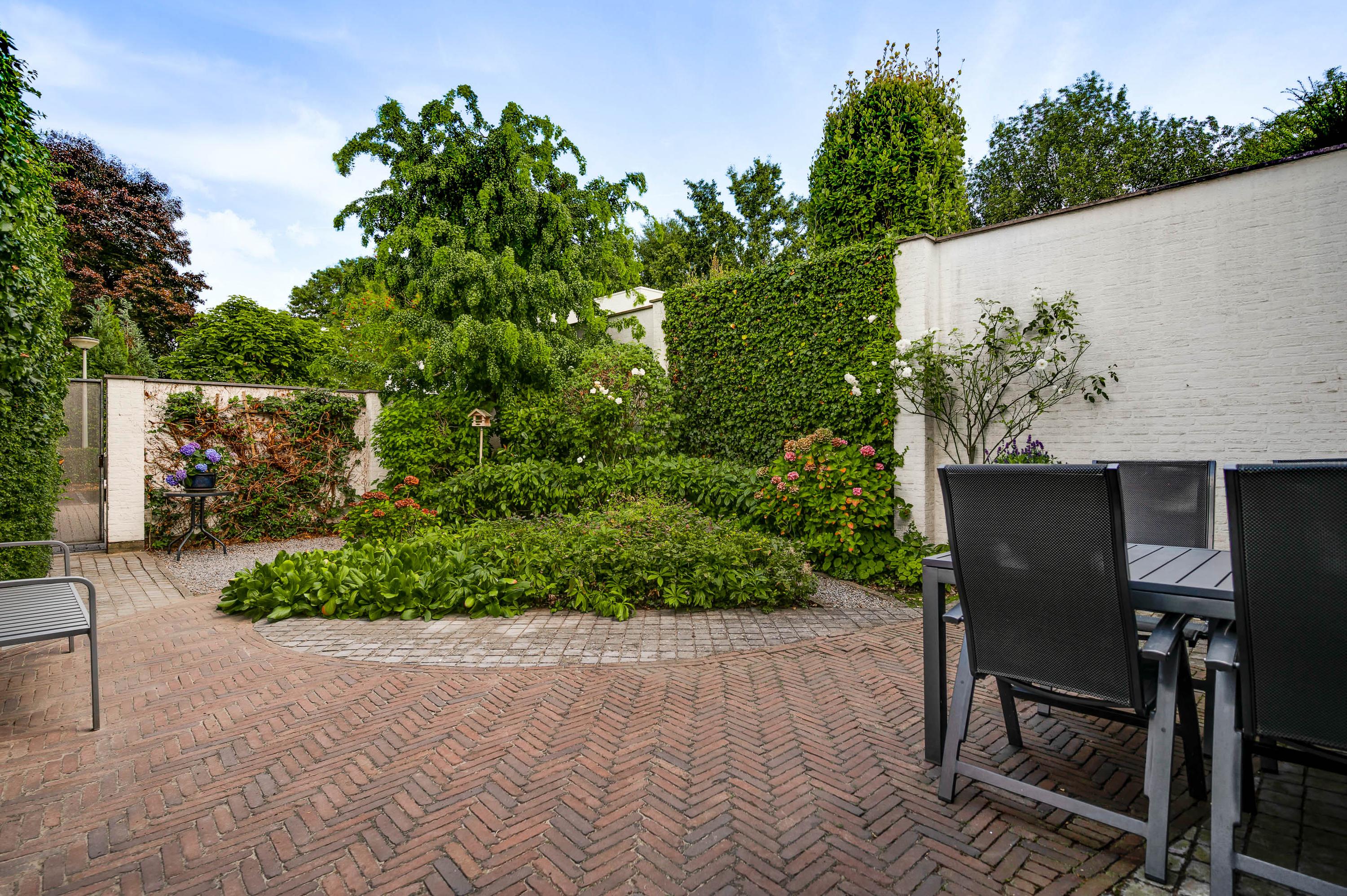 De achtertuin is, net als de voortuin, aangelegd met een grote variatie aan beplanting. De kans is groot dat u via de schuifpui de achtertuin inloopt, gesitueerd op het oosten. Er is genoeg ruimte om in de zon te zitten, en een poort geeft toegang tot de achtergelegen rustige straat. Wat opvalt is de vrije ligging, met vele hoge bomen in het zicht.