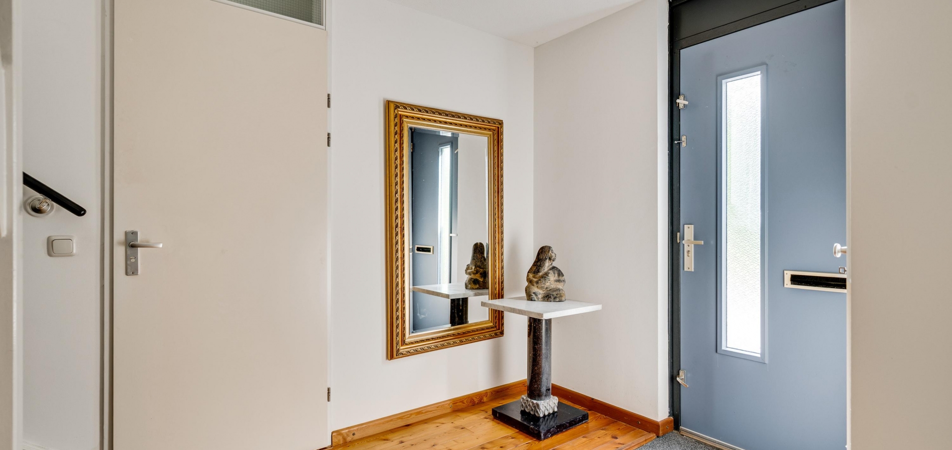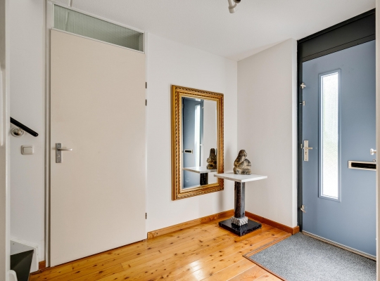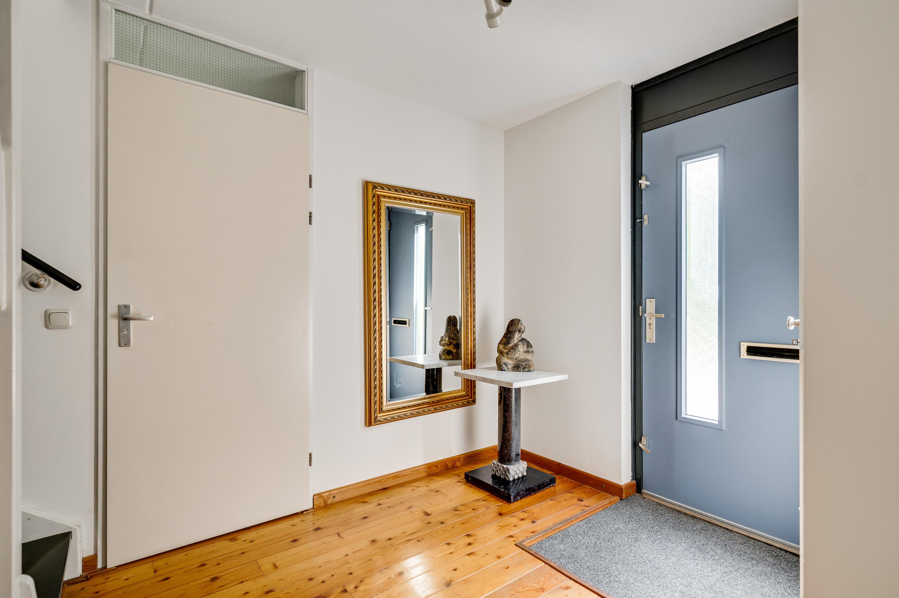 Aan de voorzijde, bij de autovrije straat en de voortuin, is de entree van deze verrassend ruime semibungalow. Achter de donkere voordeur is de hal (circa 3,40 x 2,43), met de meterkast en de trap naar de eerste verdieping. De grenen vloer ligt niet alleen in de hal, maar ook in de woonkamer en keuken.