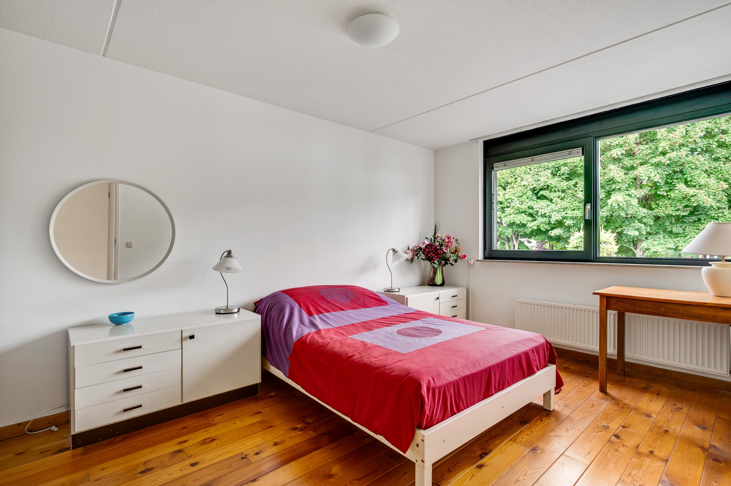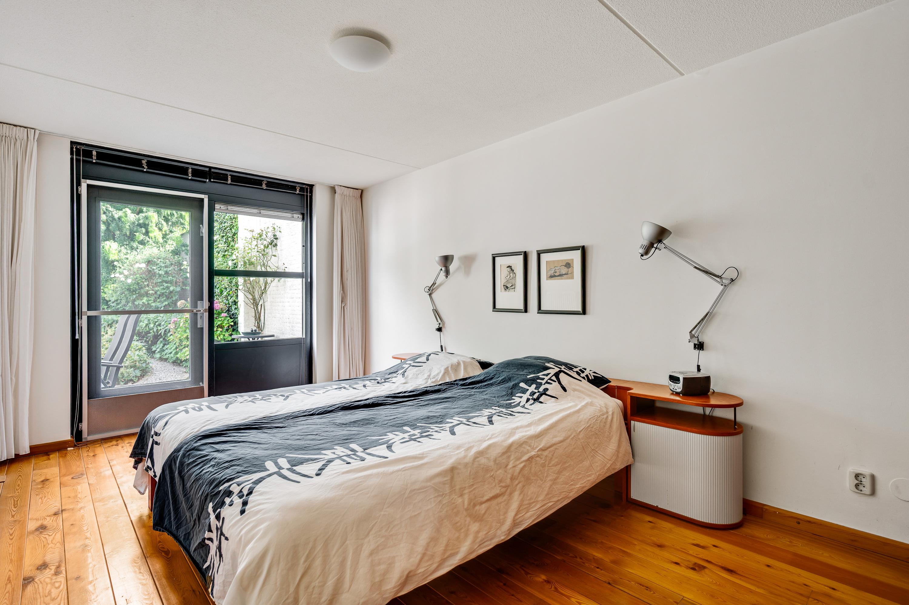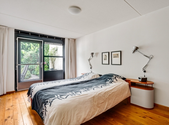 Gelijkvloers wonen is mogelijk dankzij de slaapkamer en badkamer op de begane grond. Slaapkamer I (circa 5,19 x 3,05) is een ruime tweepersoonskamer, met een raam en een deur aan de tuinzijde. De in lichte kleuren uitgevoerde badkamer (circa 3,06 x 1,84) is ingedeeld met een ligbad, toilet en een wastafel. Het brede raam aan de voorzijde, op plafondhoogte, zorgt voor veel lichtinval en privacy.