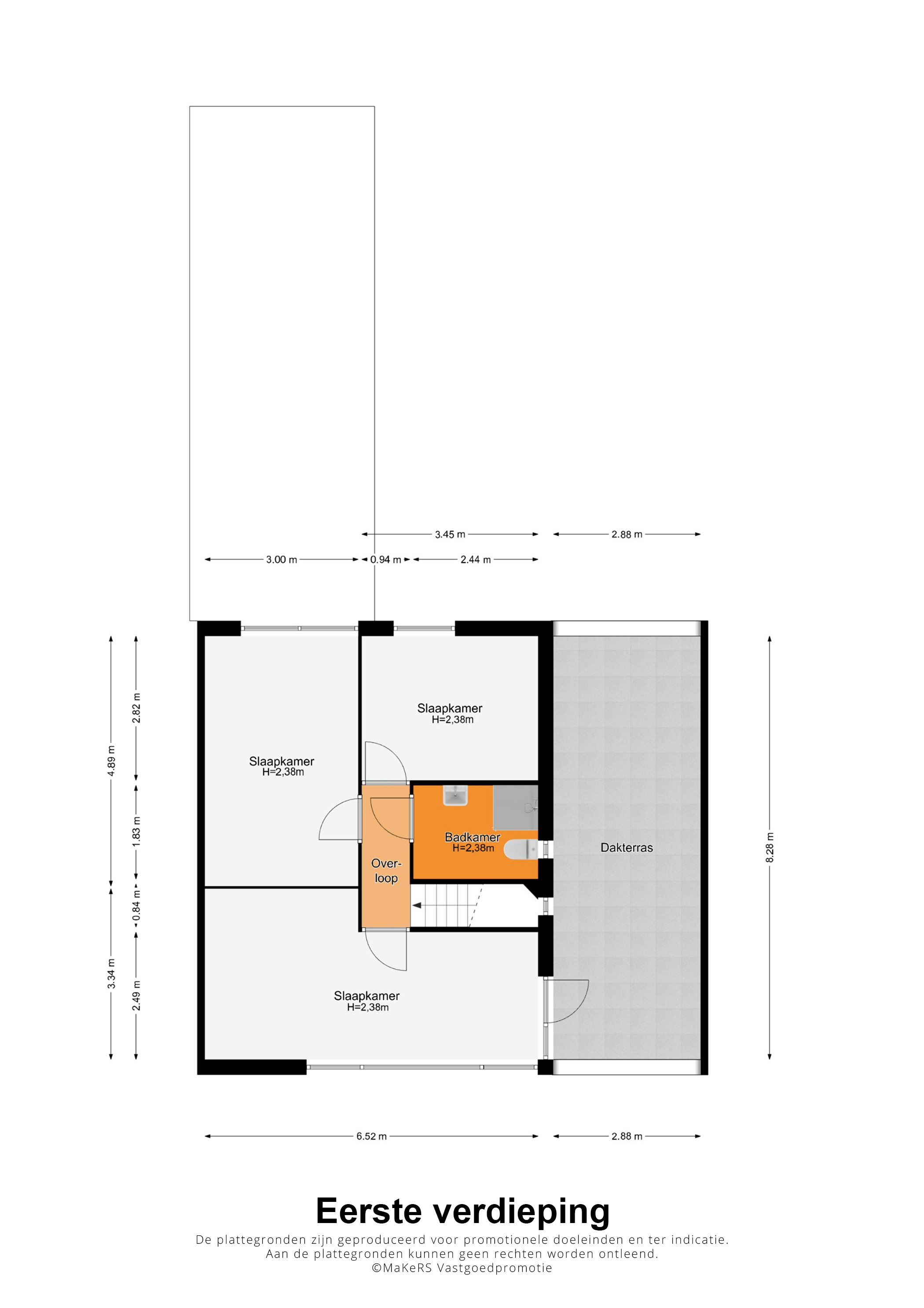 Vanaf de overloop zijn twee ruime slaapkamers, een berging en de tweede badkamer te bereiken. Slaapkamer II (circa 6,52 x 3,34/2,49) is op een eenvoudige wijze te splitsen in twee kamers, die beiden vanaf de overloop bereikbaar zijn. Deze kamer biedt toegang tot het royale en zonnige dakterras
