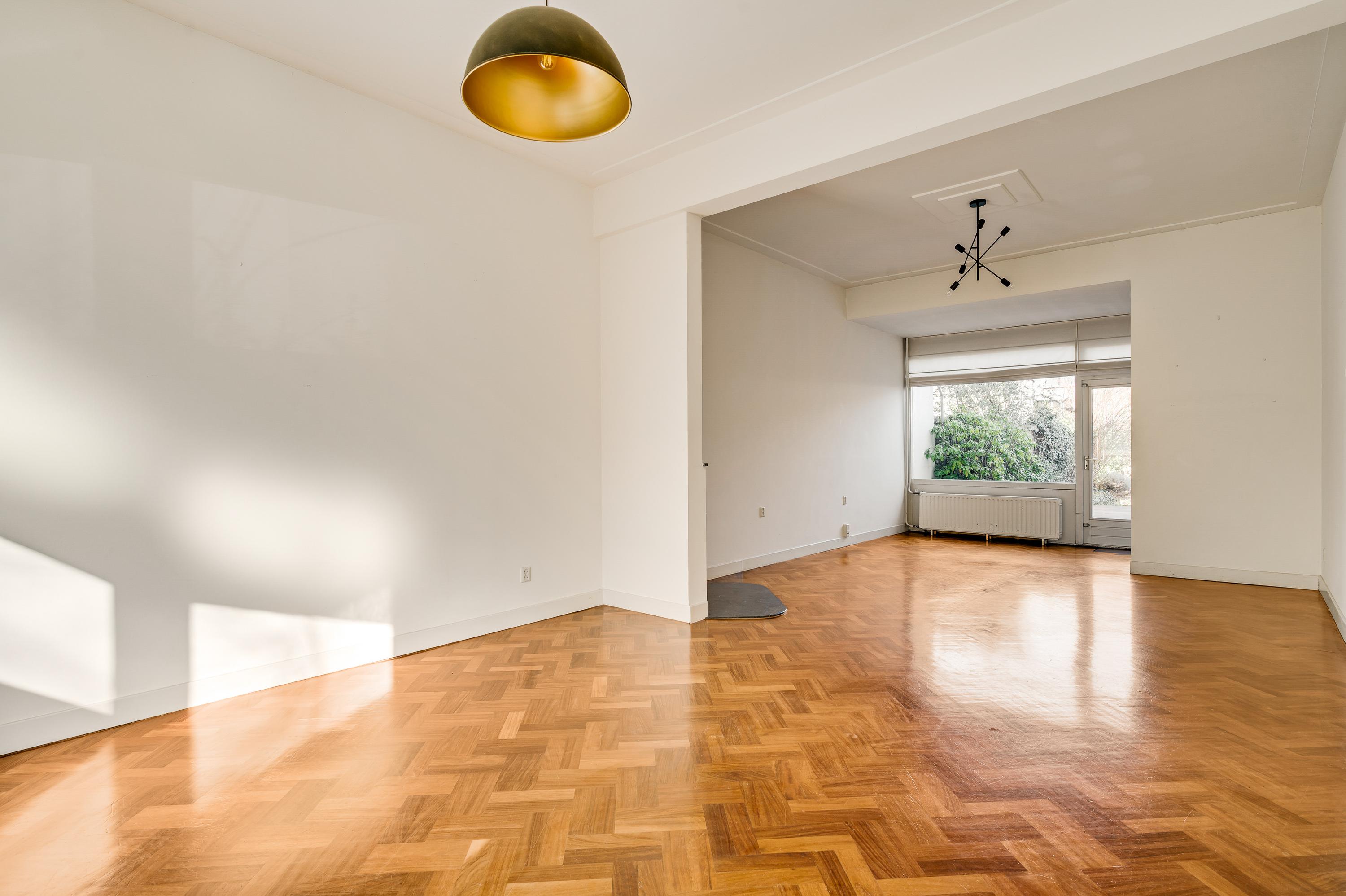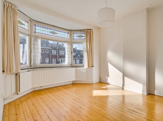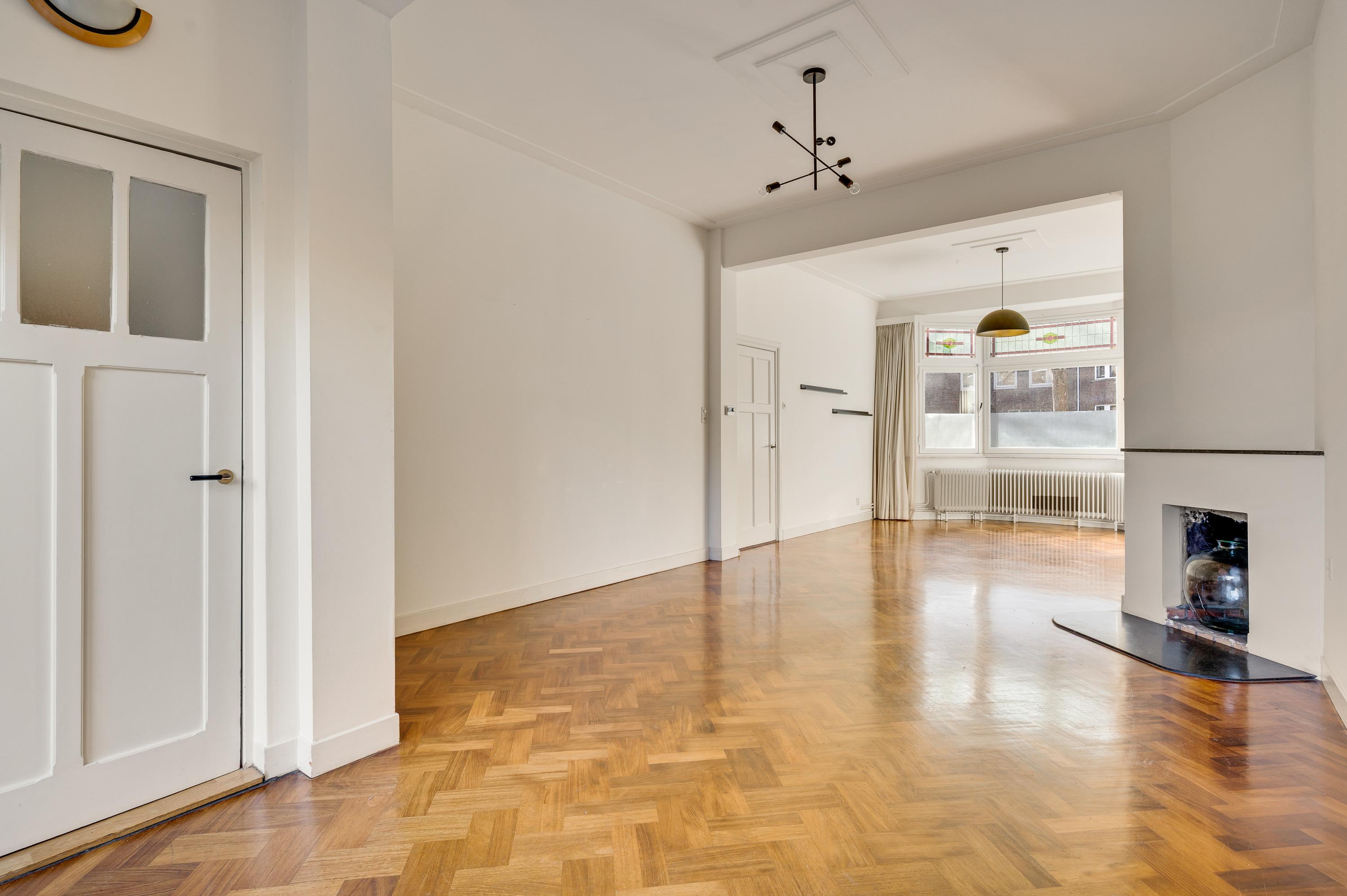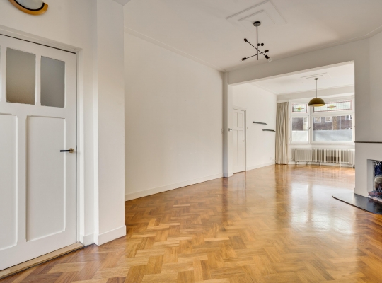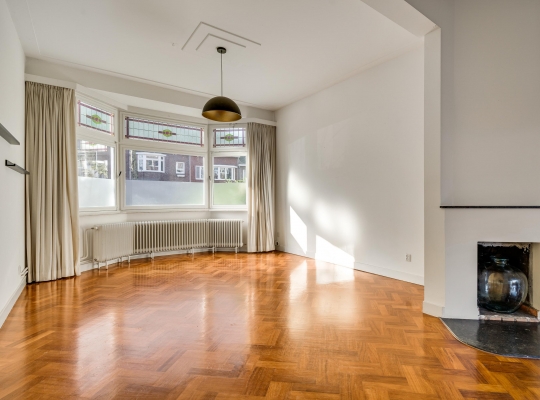 De woonkamer, met een erker aan de voorzijde en een aanbouw aan de achterzijde, heeft een totale oppervlakte van circa 40 m2. Fraaie elementen zijn de glas-in lood ramen, het strakke stucwerk met plafondlijsten, de visgraat parketvloer en de open haard (niet functioneel). Door de grote ramen valt veel licht naar binnen en het uitzicht op de tuin is fraai.