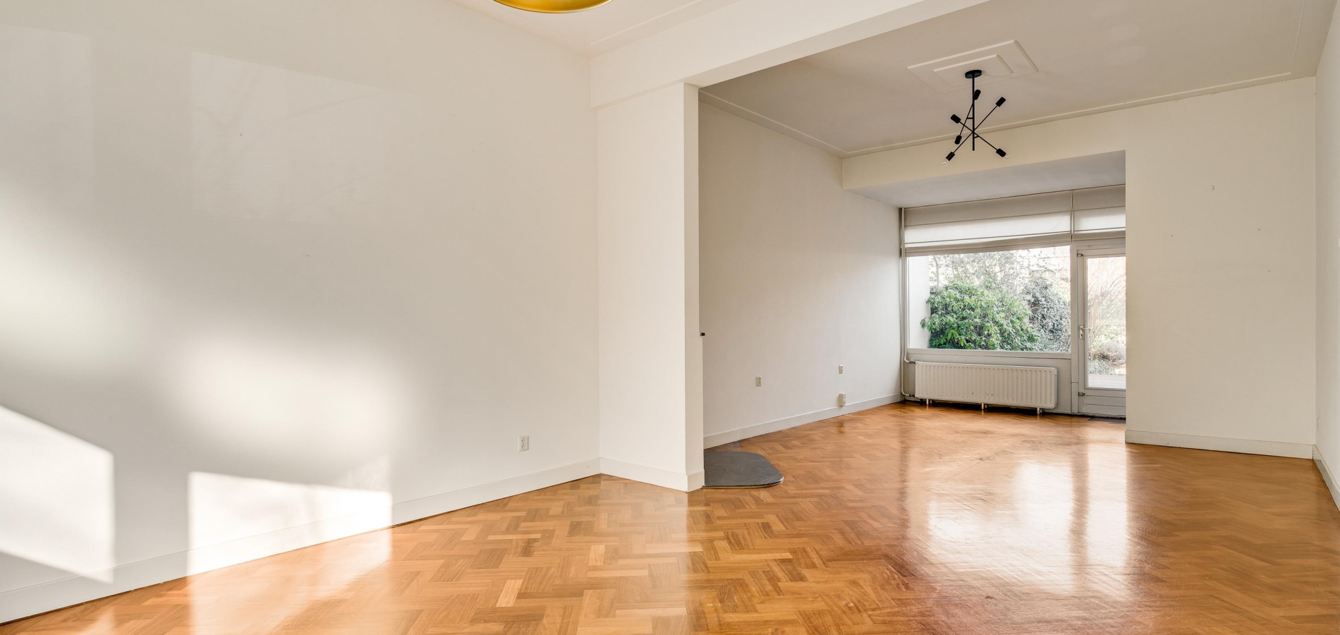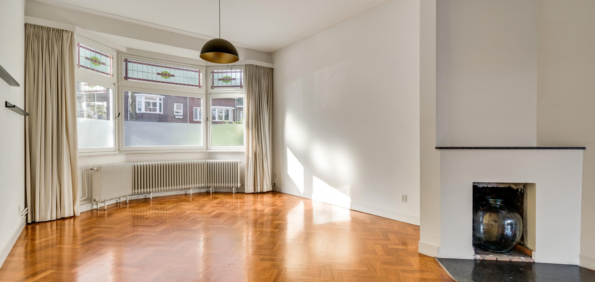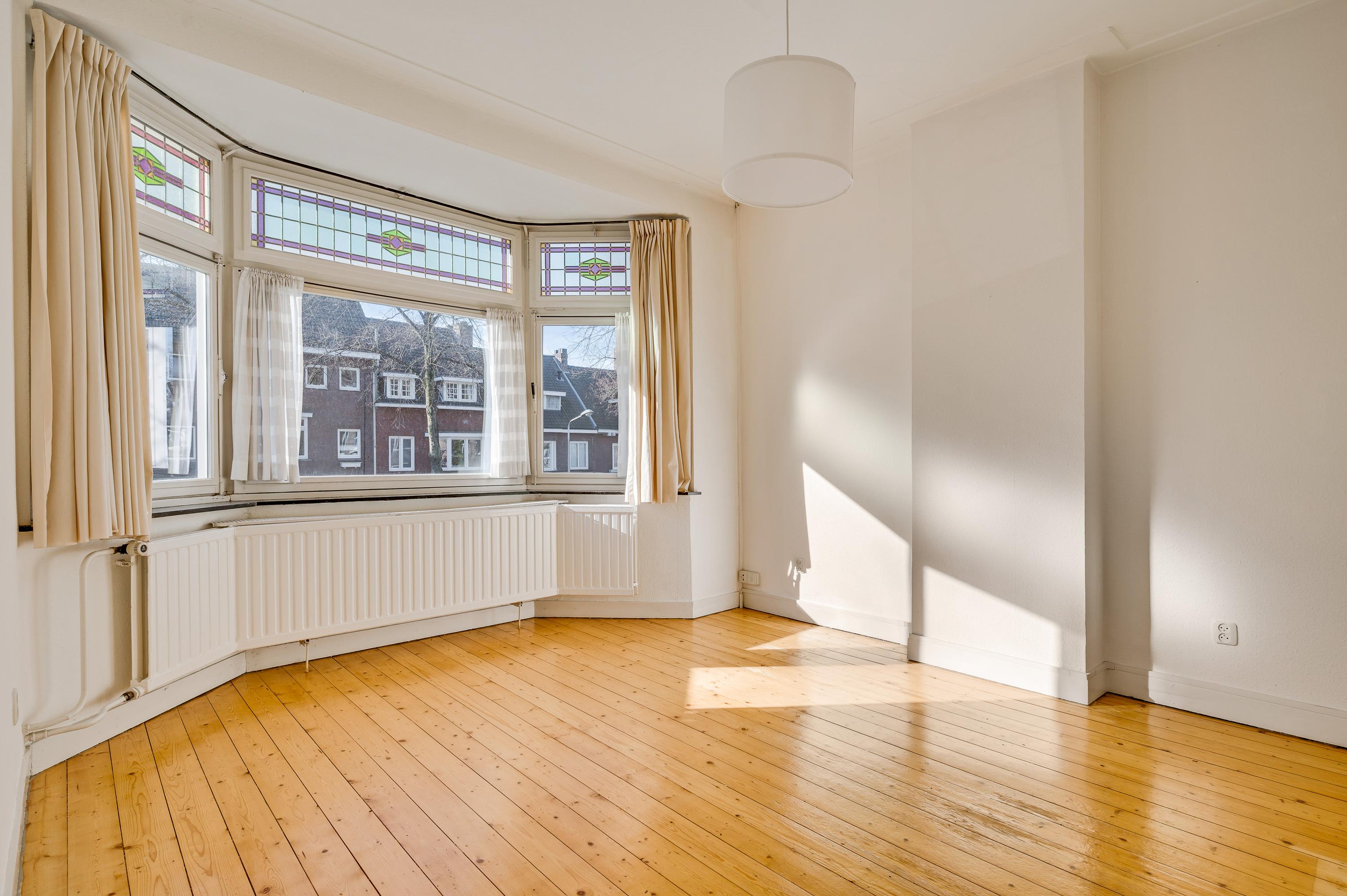 De woonkamer, met een erker aan de voorzijde en een aanbouw aan de achterzijde, heeft een totale oppervlakte van circa 40 m2. Fraaie elementen zijn de glas-in lood ramen, het strakke stucwerk met plafondlijsten, de visgraat parketvloer en de open haard (niet functioneel). Door de grote ramen valt veel licht naar binnen en het uitzicht op de tuin is fraai.