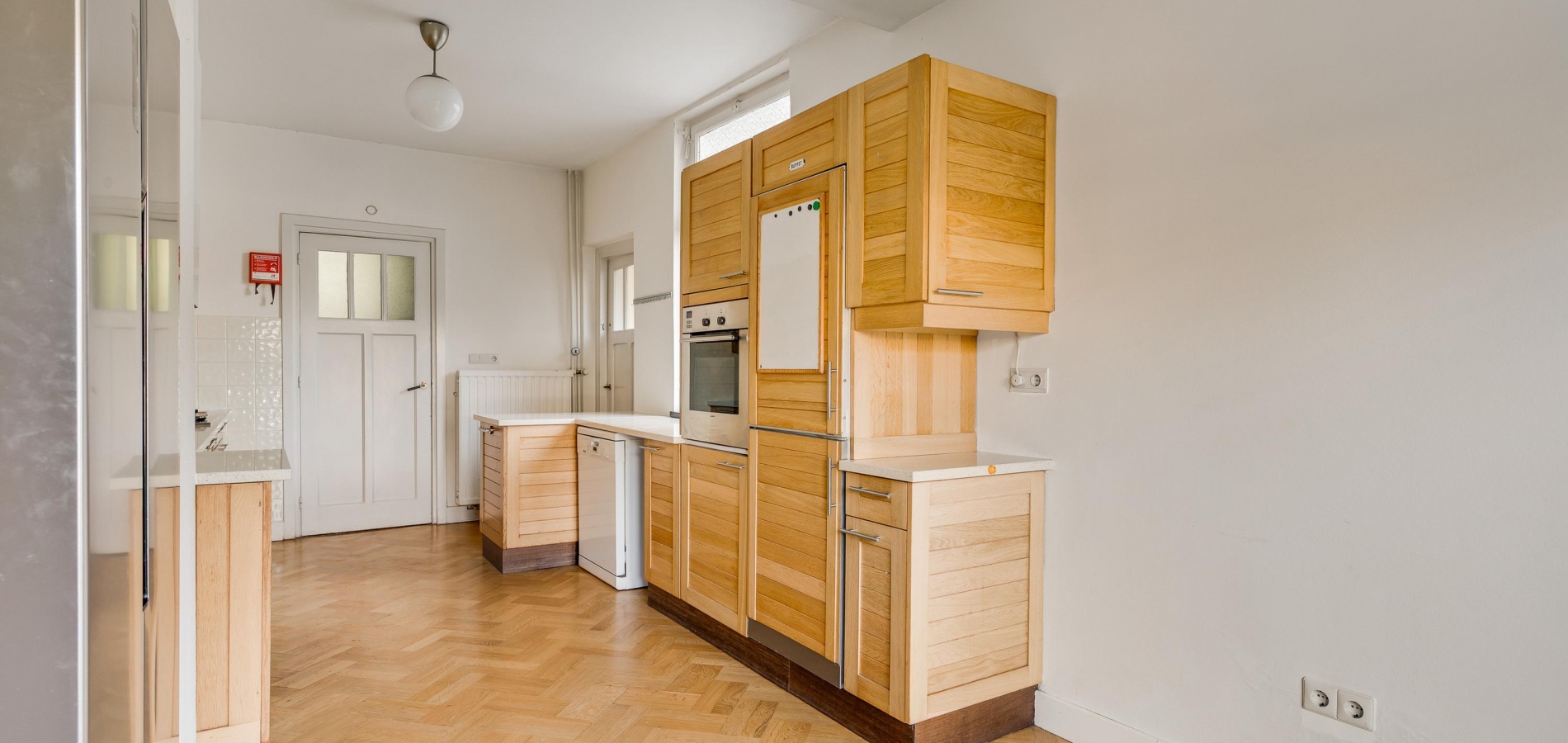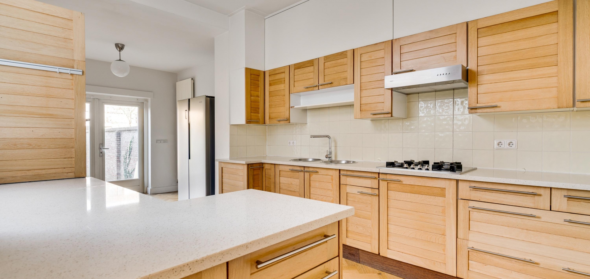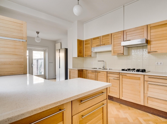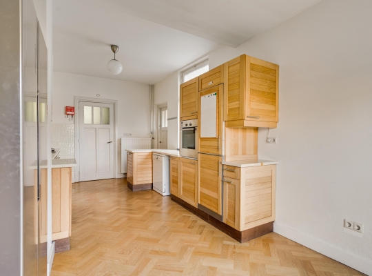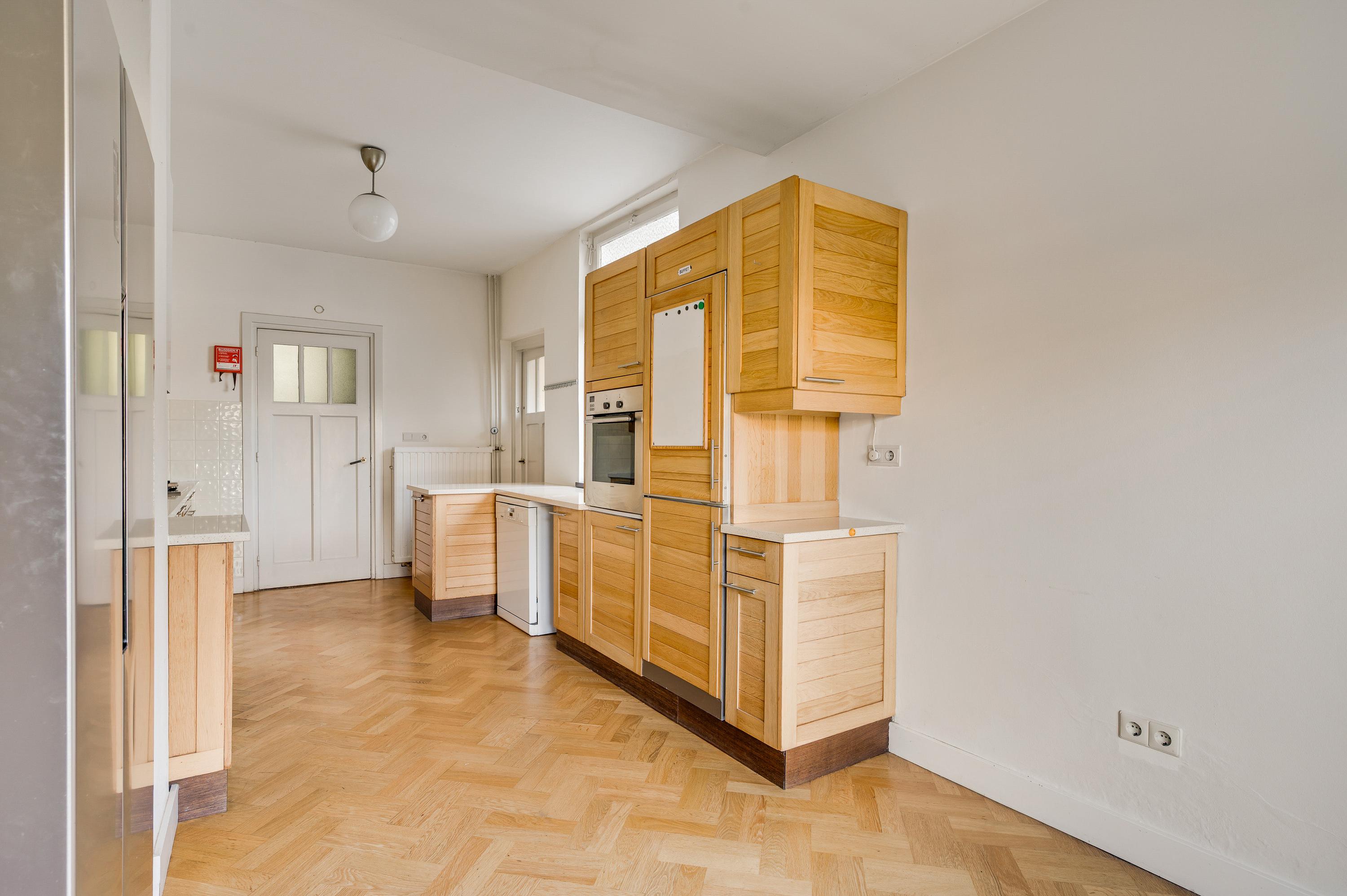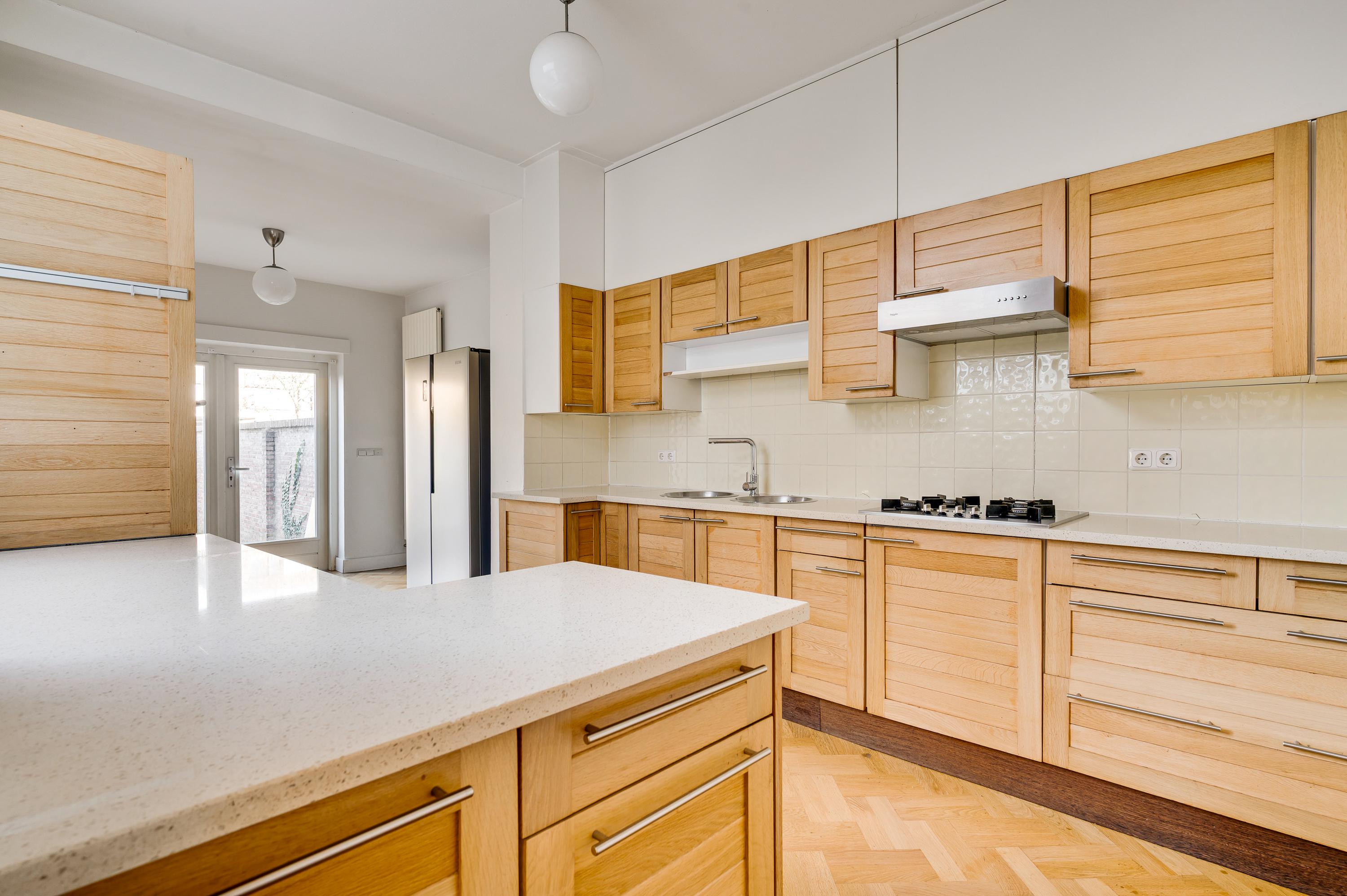 Vanuit de hal en woonkamer is de royale keuken (circa 6,83 x 2,96) te bereiken, met openslaande deuren, voorzien van rolluiken en een zonnescherm, naar de tuin. De keukenopstelling, die uit verschillende elementen bestaat, is uitgevoerd met een gaskookplaat, afzuigkap, een dubbeldeurs koelkast/vriezer, een oven en een vaatwasmachine.