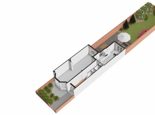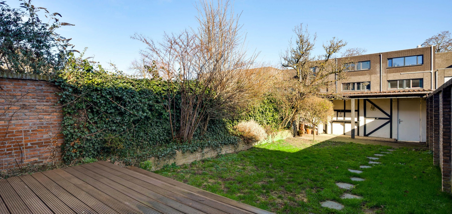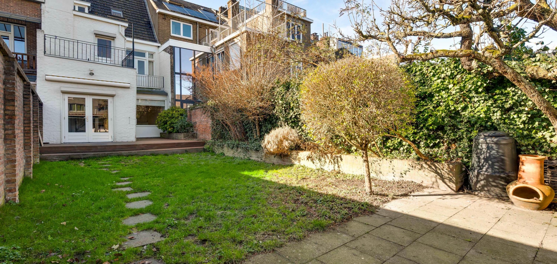 Niet alleen de voortuin, maar ook de achtertuin is heel ruim. Een pluspunt is dat de voortuin, met een groenblijvende haag en bodembedekkers, heel onderhoudsvriendelijk is aangelegd. Dit geldt ook voor de achtertuin, gesitueerd op het oosten. Het ruime, hardhouten terras, over de hele breedte van het huis, is een heerlijke plek om buiten te zitten.