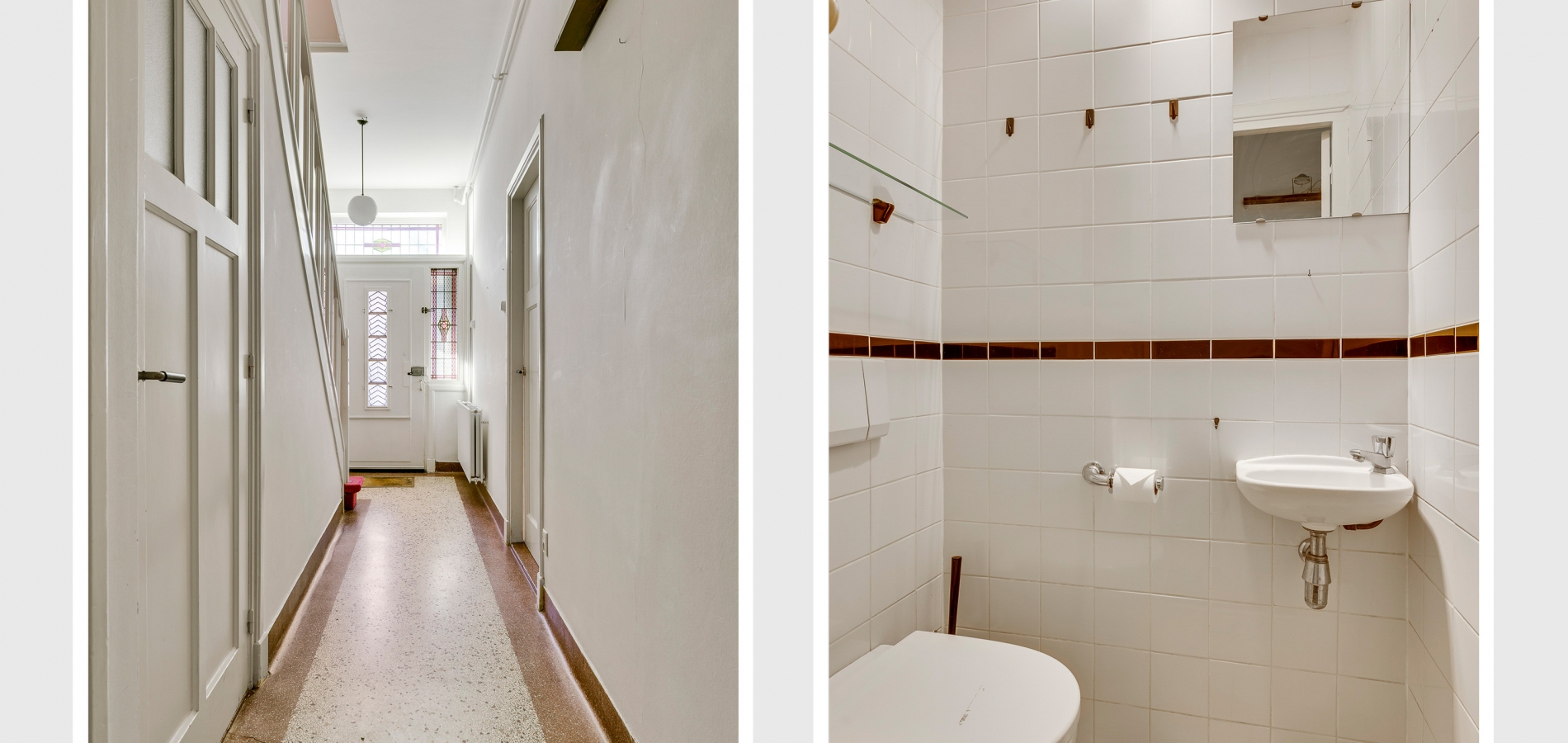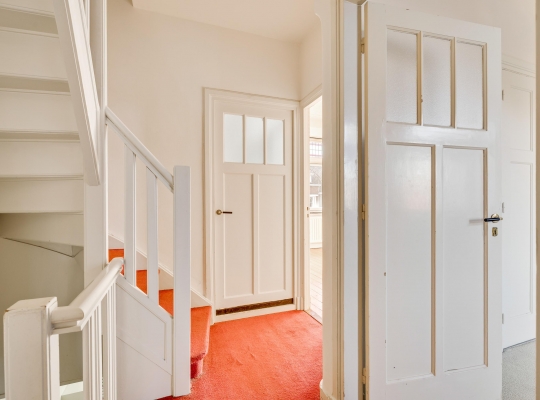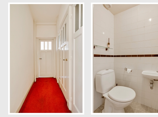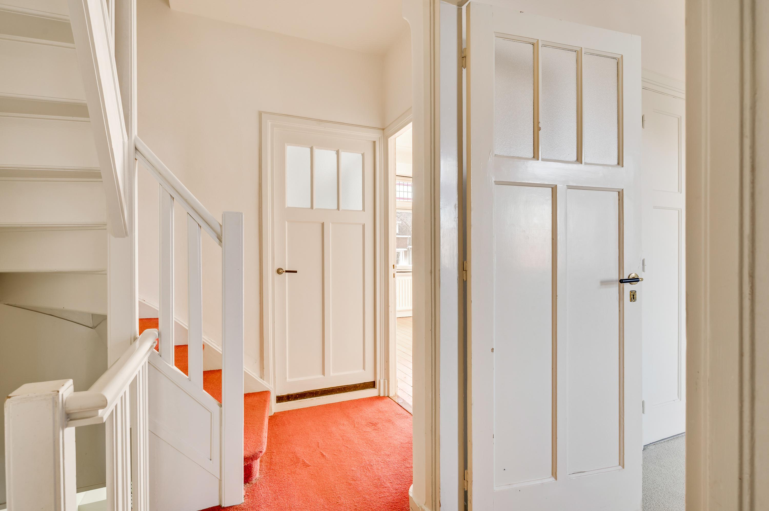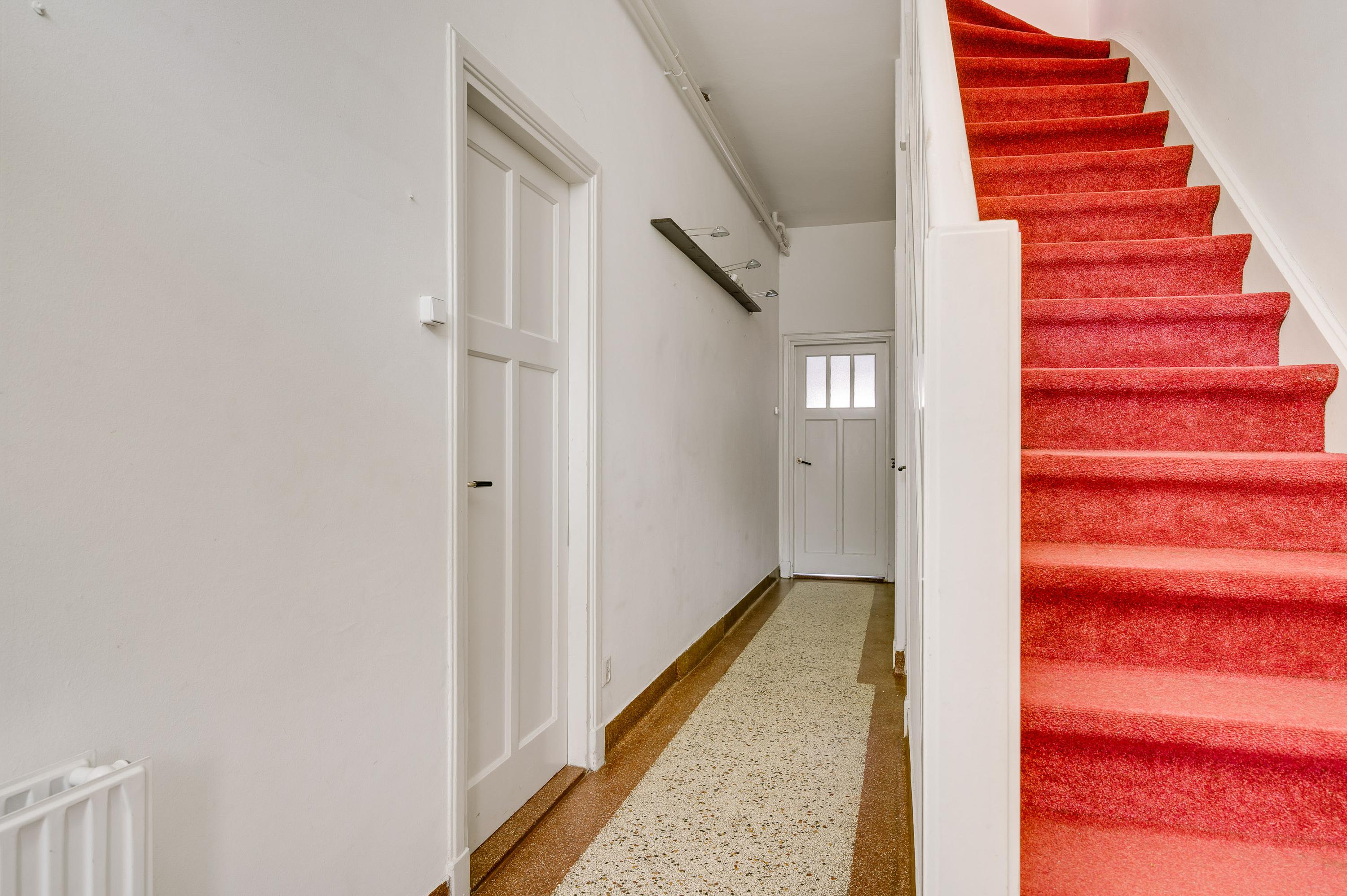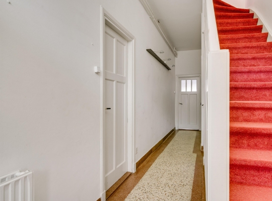 Niet alleen de overdekte entree, maar ook de royale hal (circa 7,63 x 1,94) is fraai. Het plafond is meer dan 3 meter hoog en u ziet vele originele elementen, van paneeldeuren tot glas-in loodramen. Ook de terrazzovloer is behouden, waardoor de hal het toonbeeld van karakter en sfeer is. In het achterste deel van de hal zijn twee bergkasten en de toiletruimte.