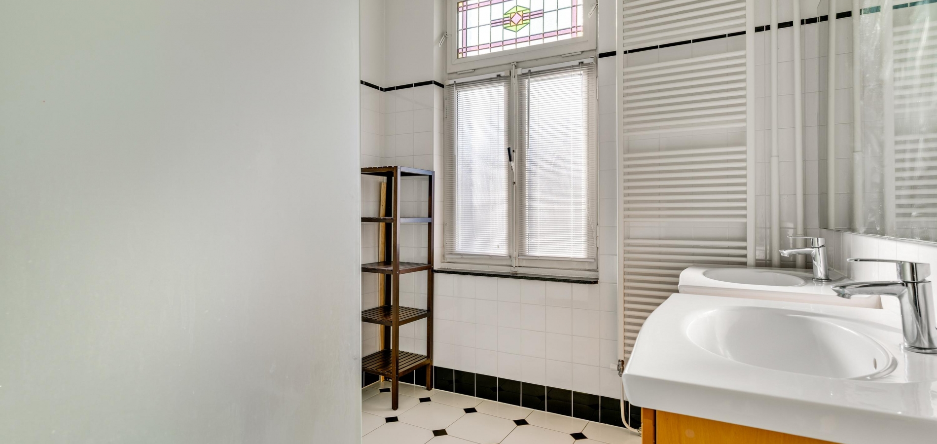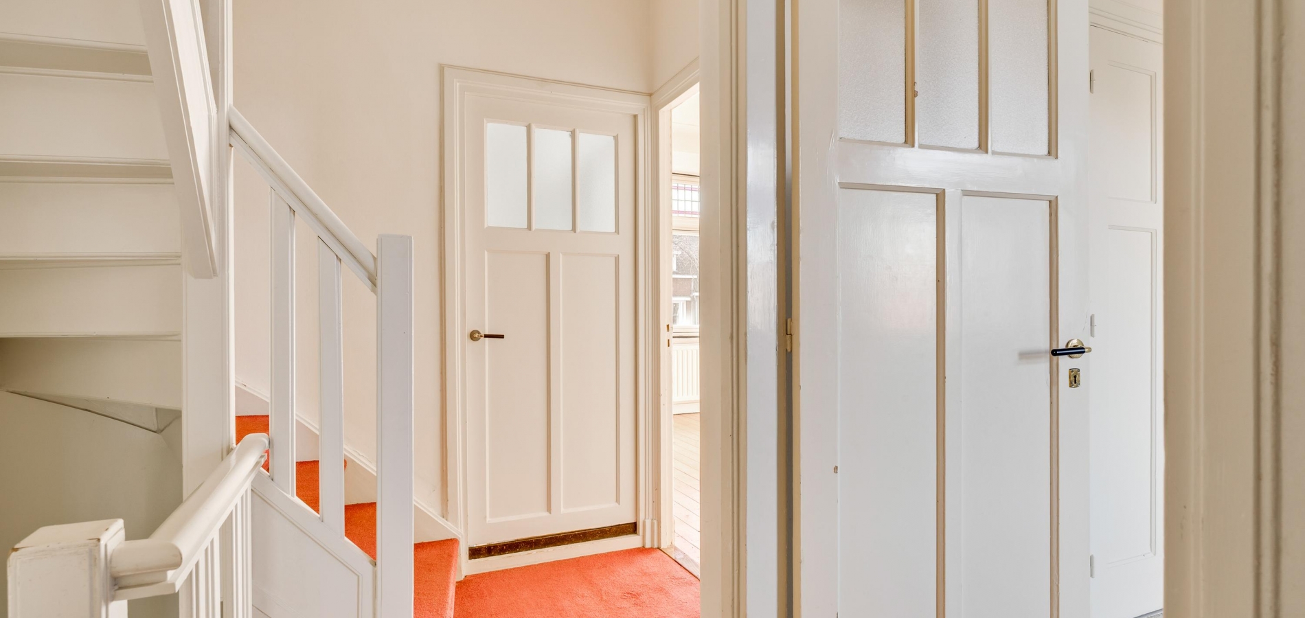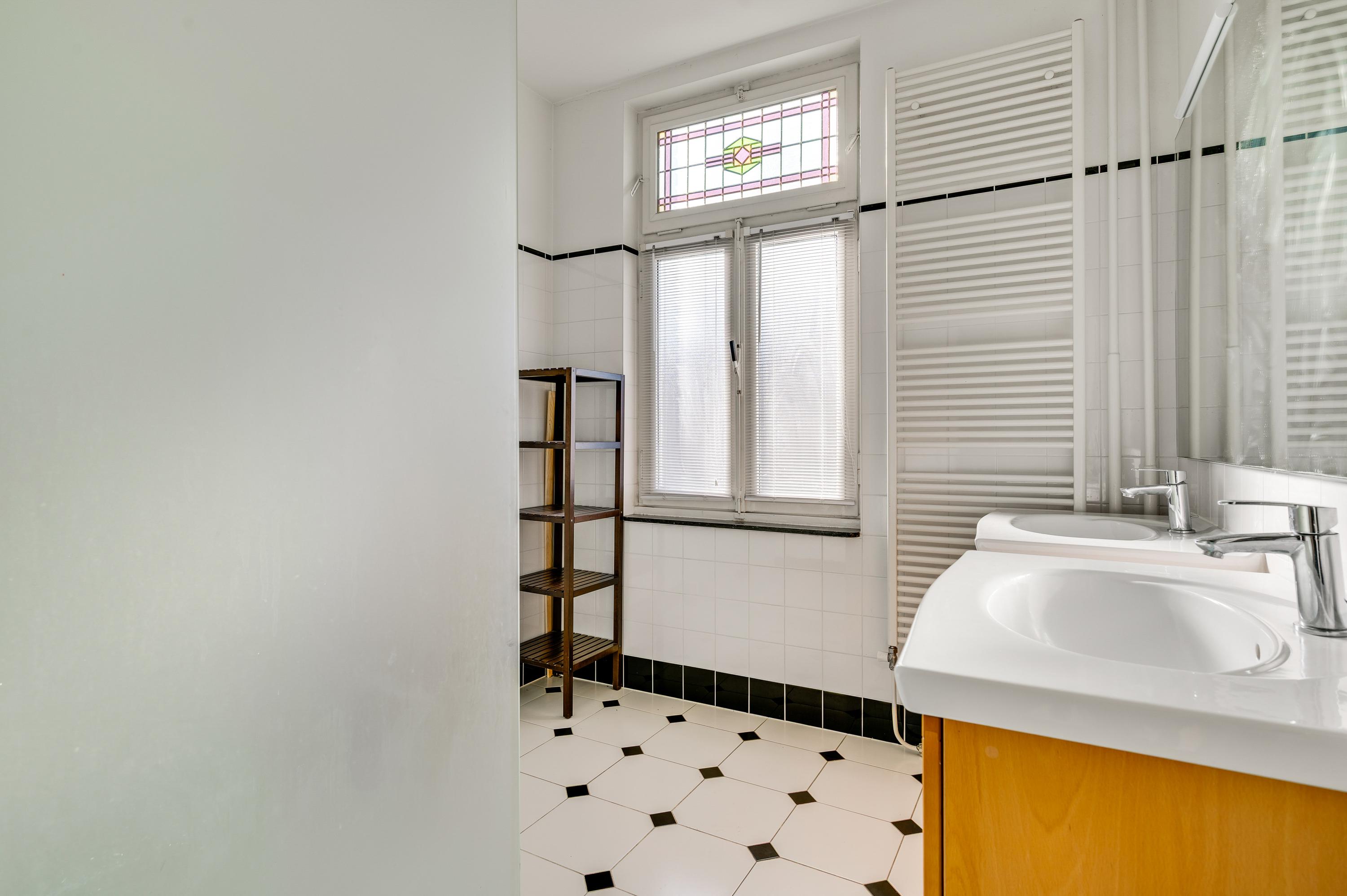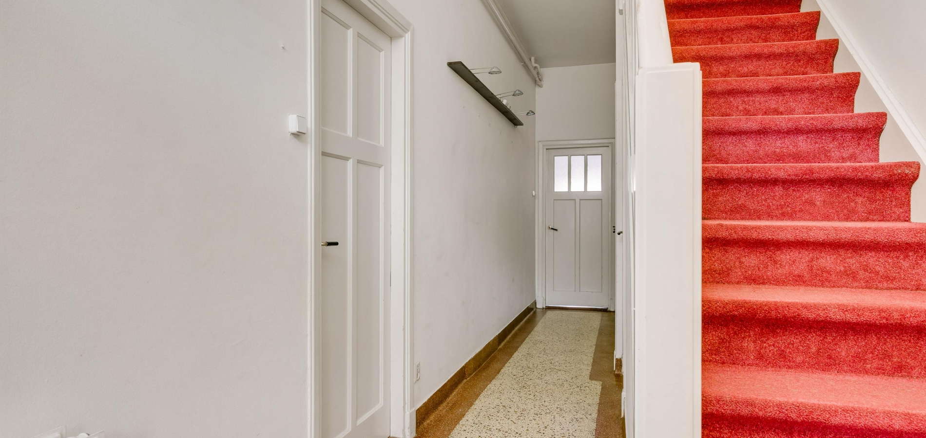 Niet alleen de overdekte entree, maar ook de royale hal (circa 7,63 x 1,94) is fraai. Het plafond is meer dan 3 meter hoog en u ziet vele originele elementen, van paneeldeuren tot glas-in loodramen. Ook de terrazzovloer is behouden, waardoor de hal het toonbeeld van karakter en sfeer is. In het achterste deel van de hal zijn twee bergkasten en de toiletruimte.