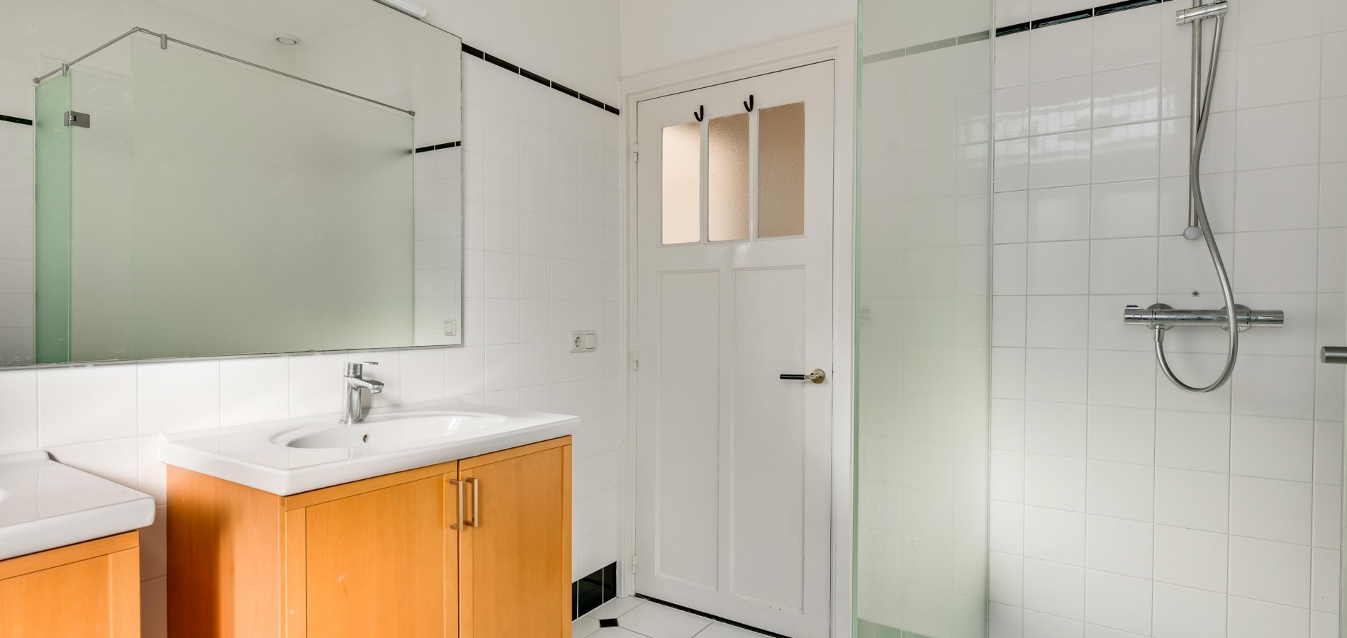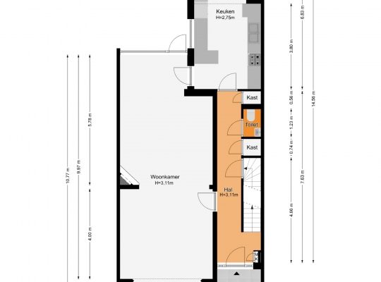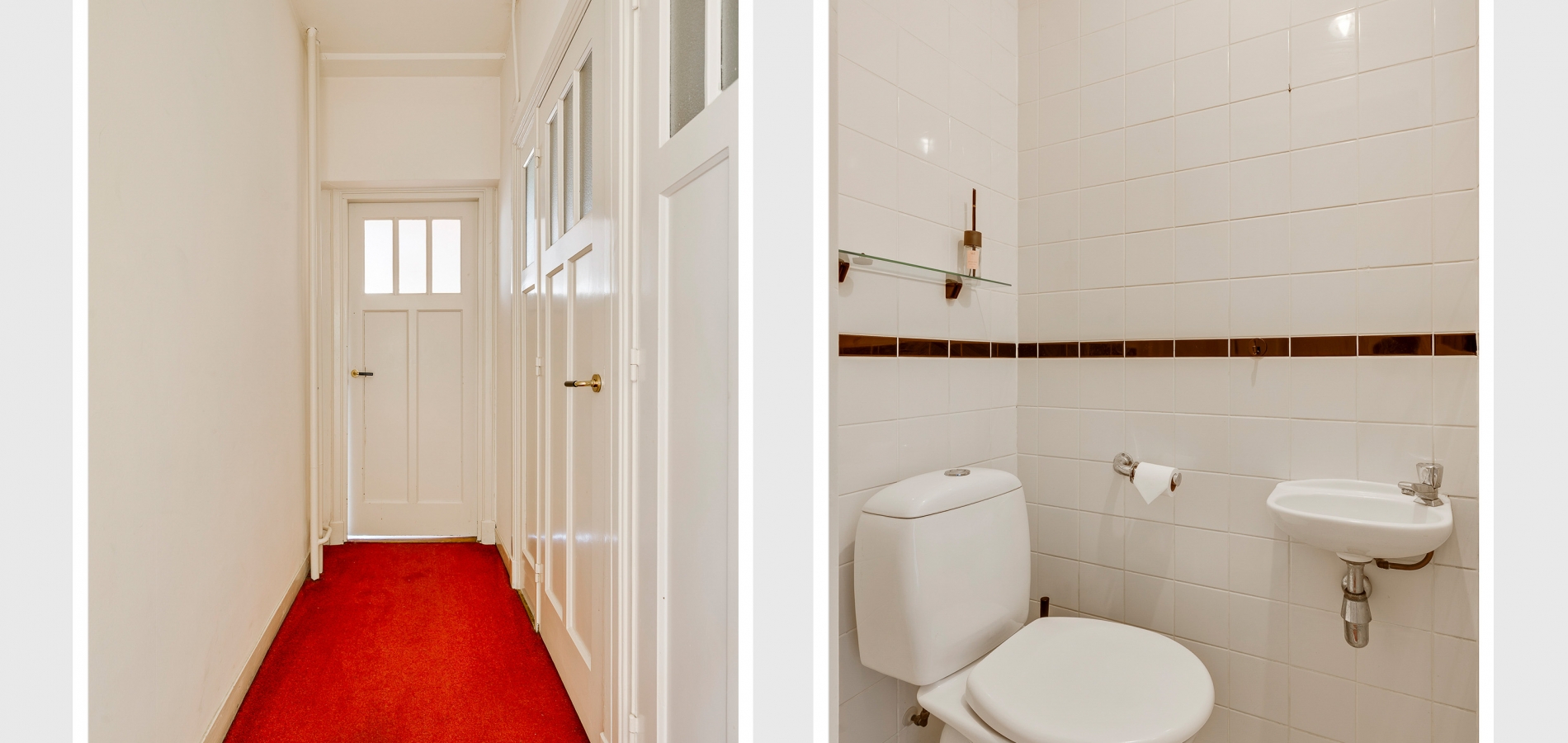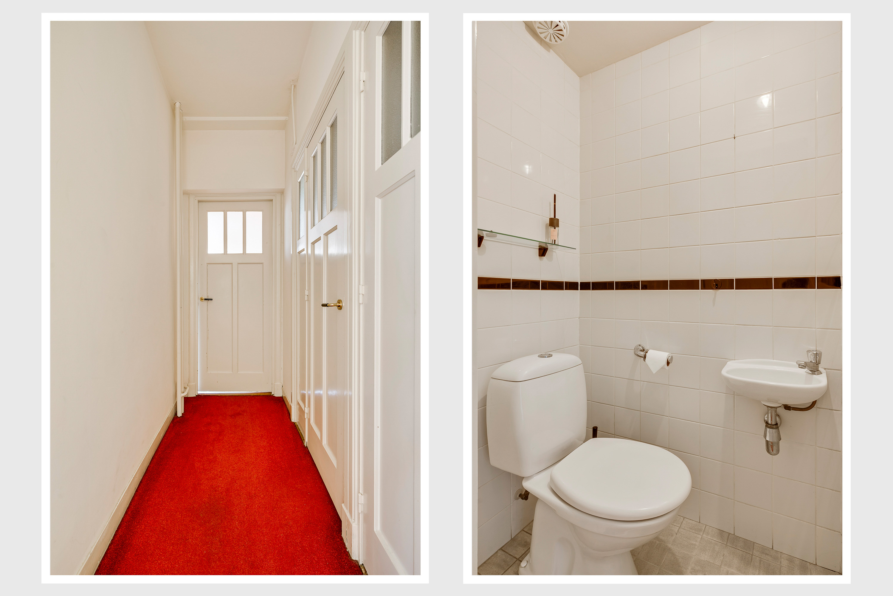 Niet alleen de overdekte entree, maar ook de royale hal (circa 7,63 x 1,94) is fraai. Het plafond is meer dan 3 meter hoog en u ziet vele originele elementen, van paneeldeuren tot glas-in loodramen. Ook de terrazzovloer is behouden, waardoor de hal het toonbeeld van karakter en sfeer is. In het achterste deel van de hal zijn twee bergkasten en de toiletruimte.