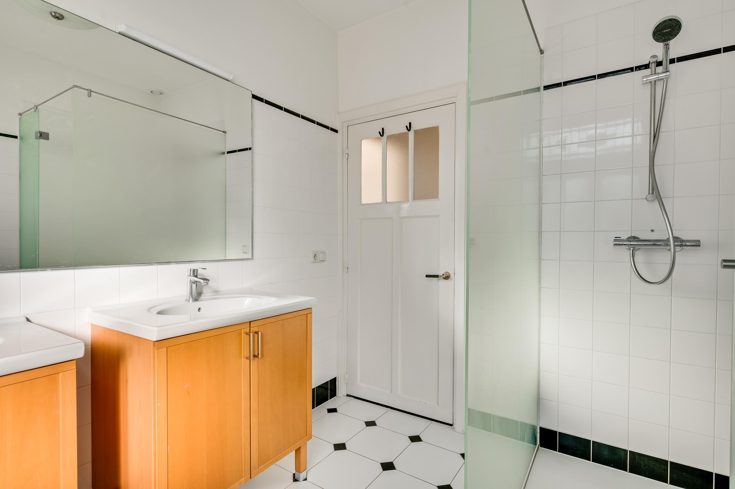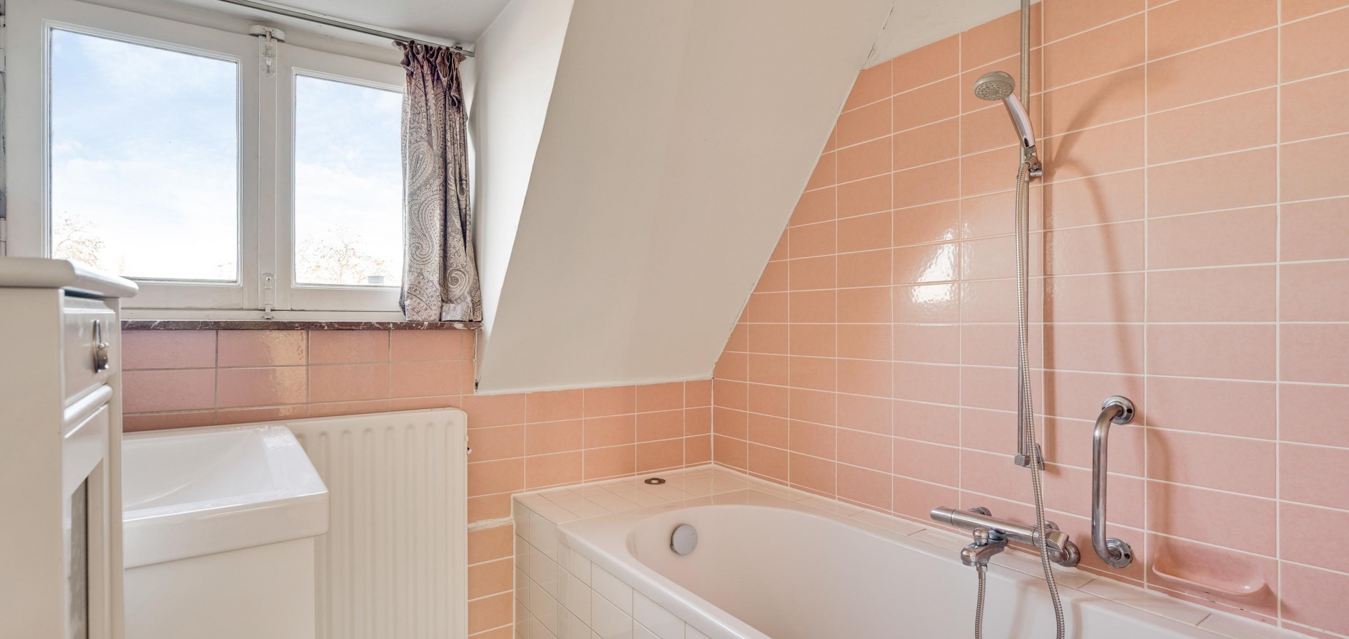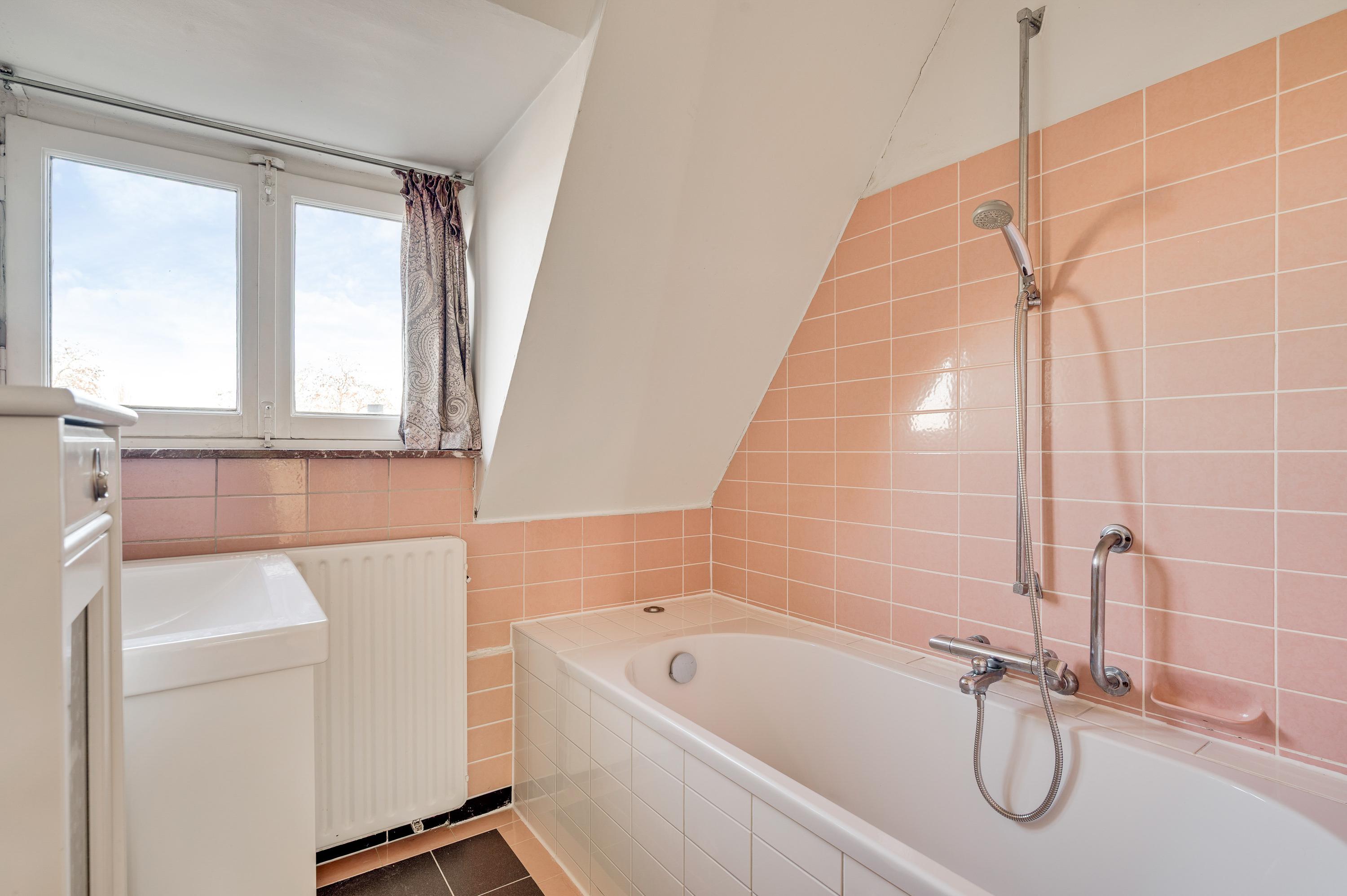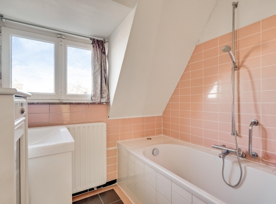 Badkamer II (circa 1,94 x 1,96), met een dakkapel en roze wandtegels, is ingedeeld met een ligbad en een wastafel met badmeubel. Op de zolderkamer (circa 4,12 x 2,60) is de opstelling van de HR-ketel (Nefit Topline, 2014, eigendom) met boiler.