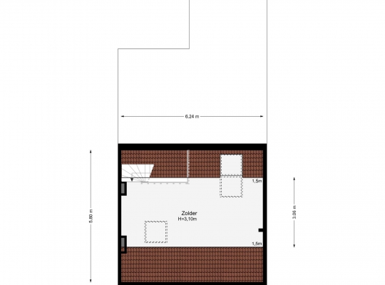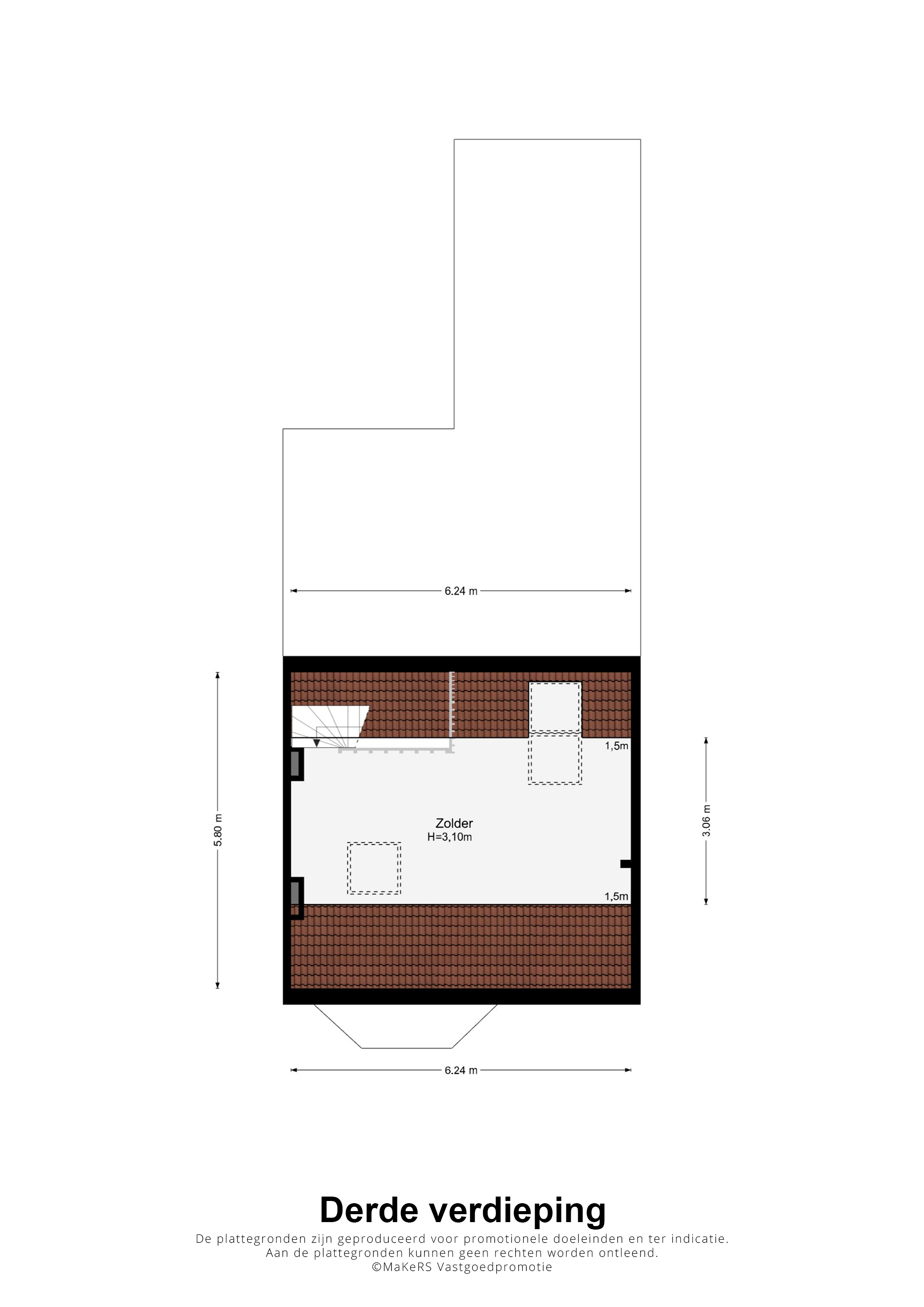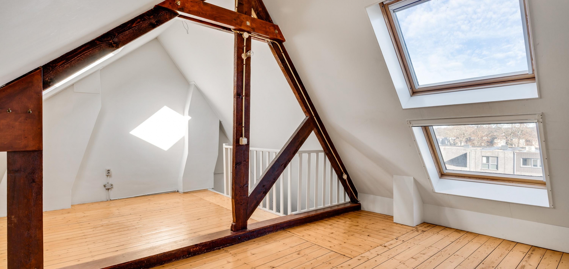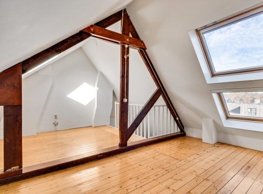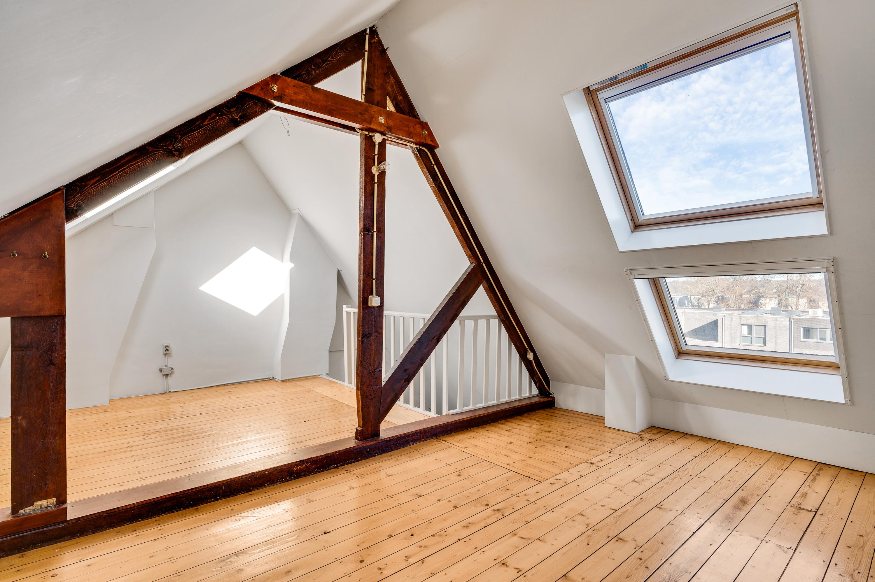 Er is een vaste trap naar de derde verdieping, waar een lichte en riante kamer (circa 6,24 x 3,60) klaar is voor een nieuwe invulling, Deze kamer heeft een meer dan drie meter hoge nok, een prachtige houten vloer en lichtinval via meerdere dakramen.