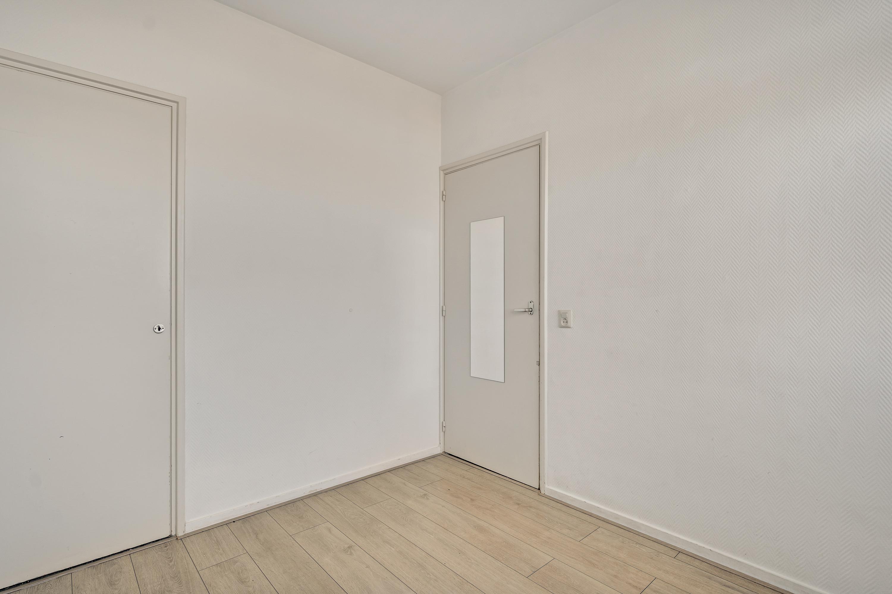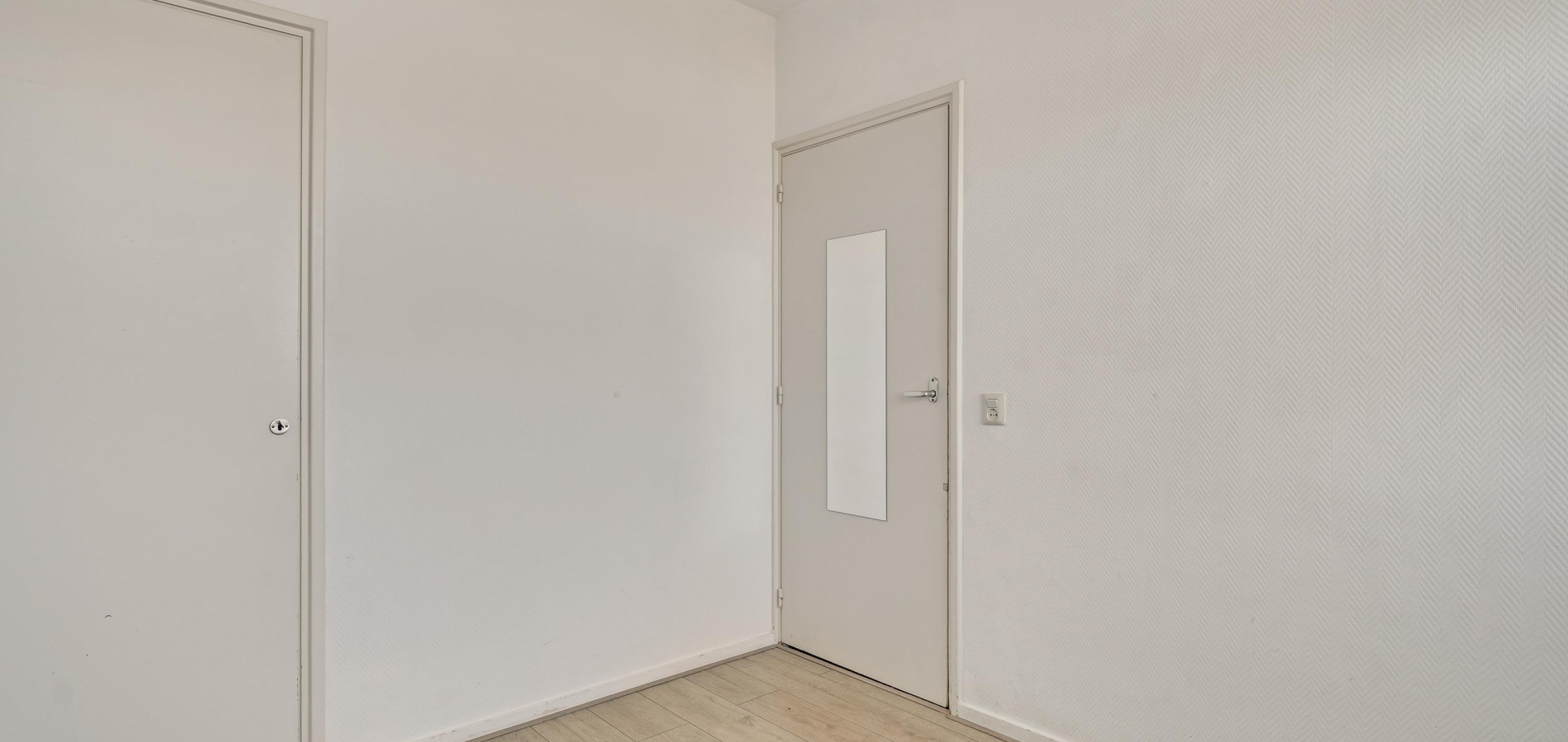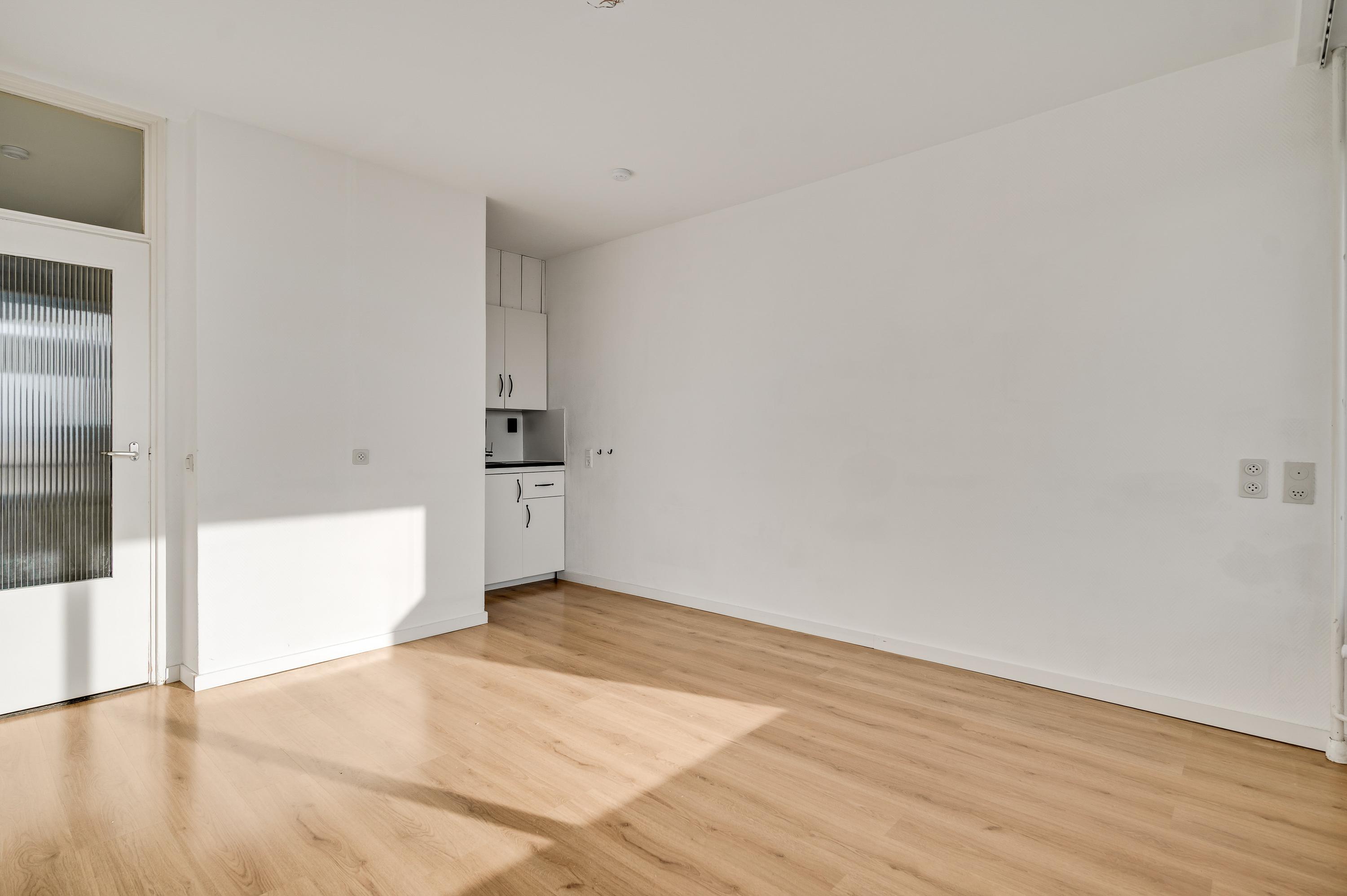 Bij huisnummer 59g loopt u naar binnen, de lange hal (circa 4,44 x 1,11) in. Aan de linkerzijde zijn de deuren van de slaapkamer, badkamer en een berging/wasruimte. De woonkamer (circa 4,27/4,04 x 3,71) bevindt zich aan de zuidkant, met lichtinval vanaf de zuidkant. U ziet het Vrijheidspark, de zuidkant van De Groene Loper en zelfs de Sint Pietersberg. In de aansluitende keuken staat een hoekopstelling met een gaskookplaat en afzuigkap.