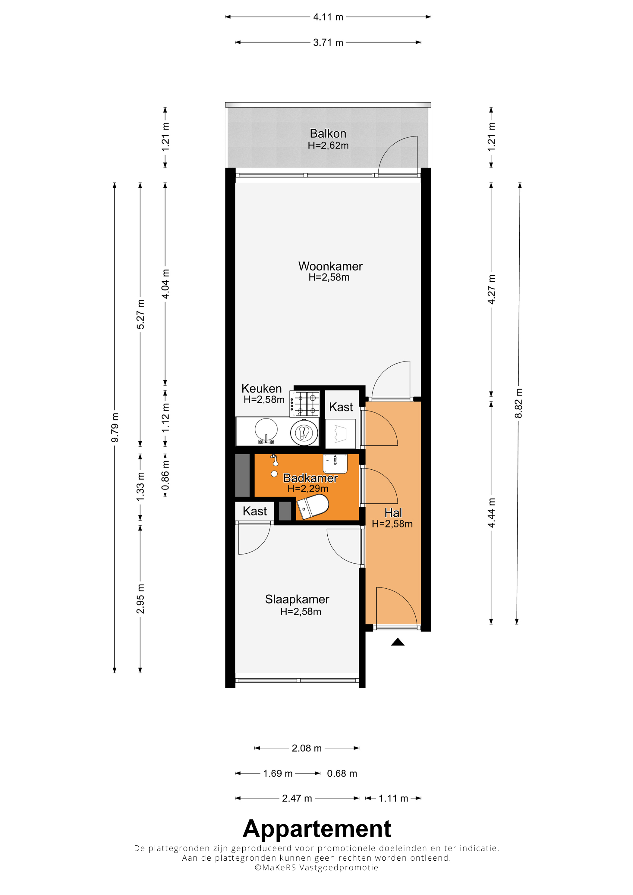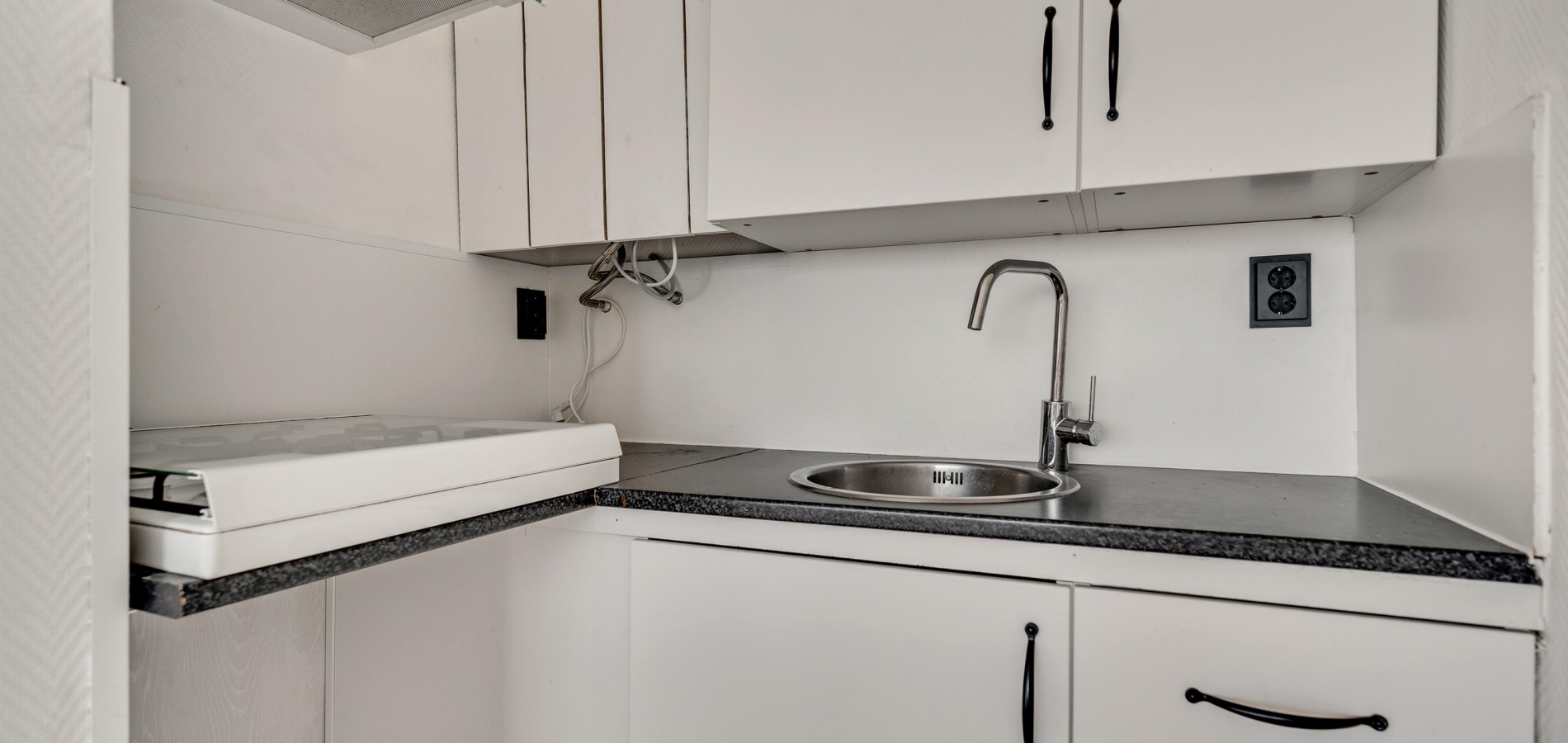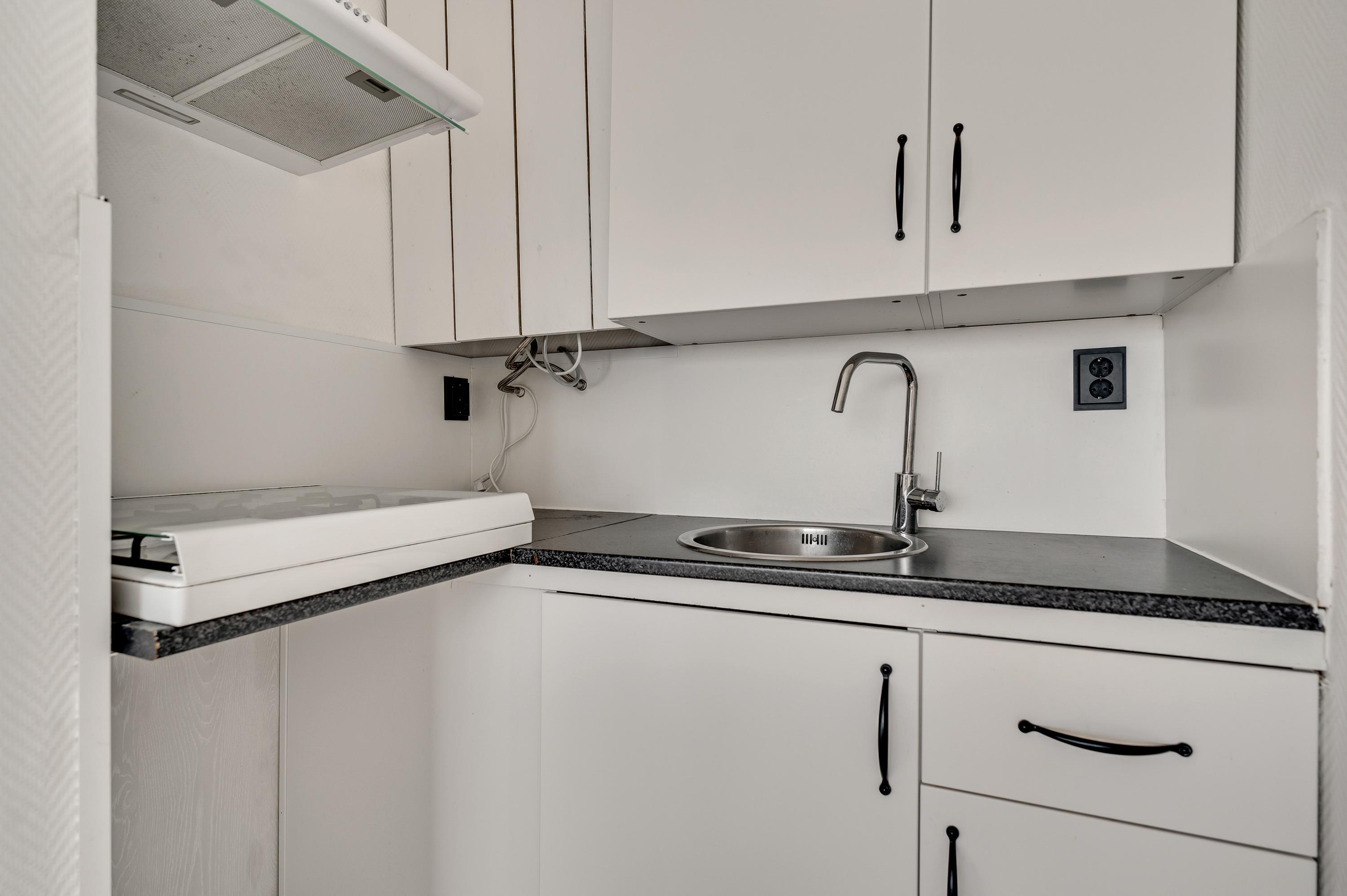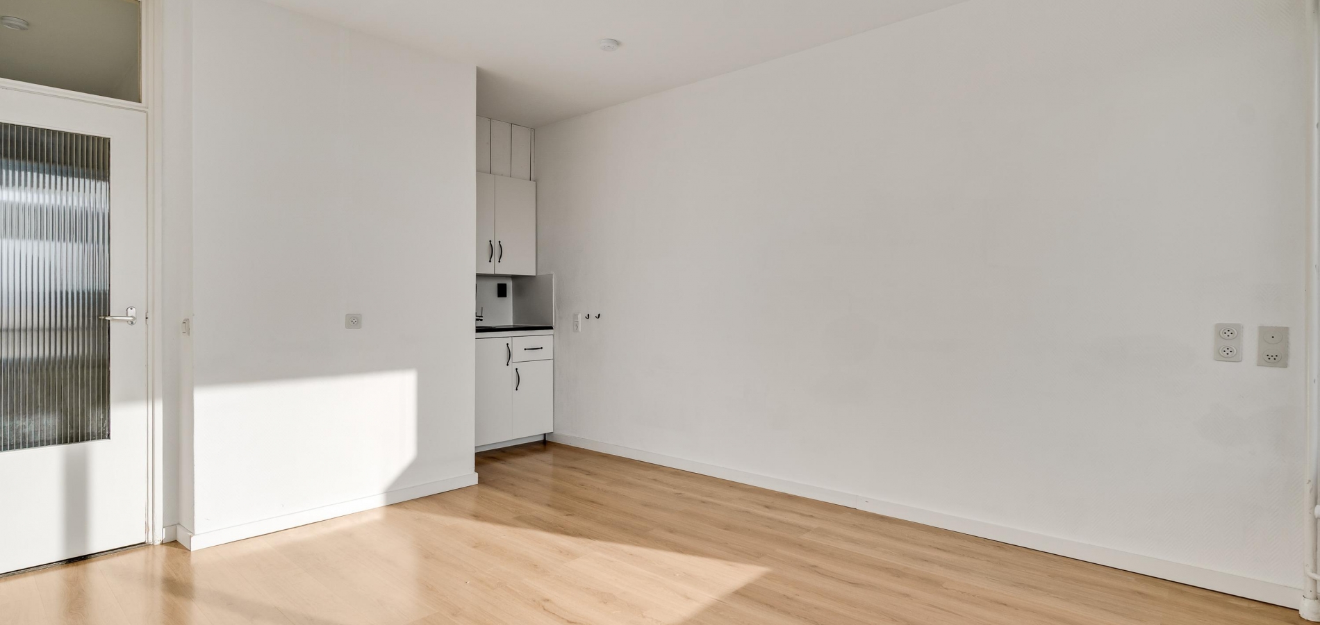 Bij huisnummer 59g loopt u naar binnen, de lange hal (circa 4,44 x 1,11) in. Aan de linkerzijde zijn de deuren van de slaapkamer, badkamer en een berging/wasruimte. De woonkamer (circa 4,27/4,04 x 3,71) bevindt zich aan de zuidkant, met lichtinval vanaf de zuidkant. U ziet het Vrijheidspark, de zuidkant van De Groene Loper en zelfs de Sint Pietersberg. In de aansluitende keuken staat een hoekopstelling met een gaskookplaat en afzuigkap.