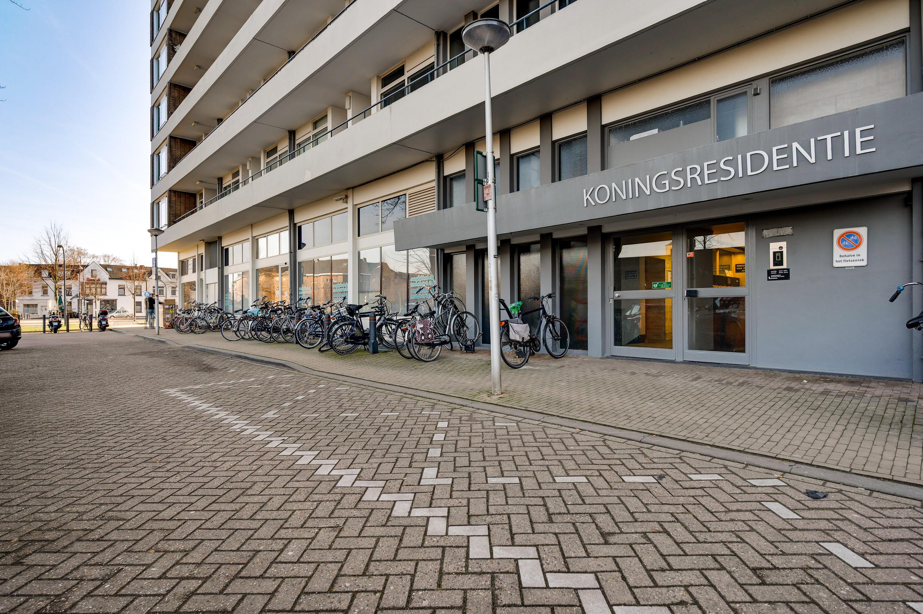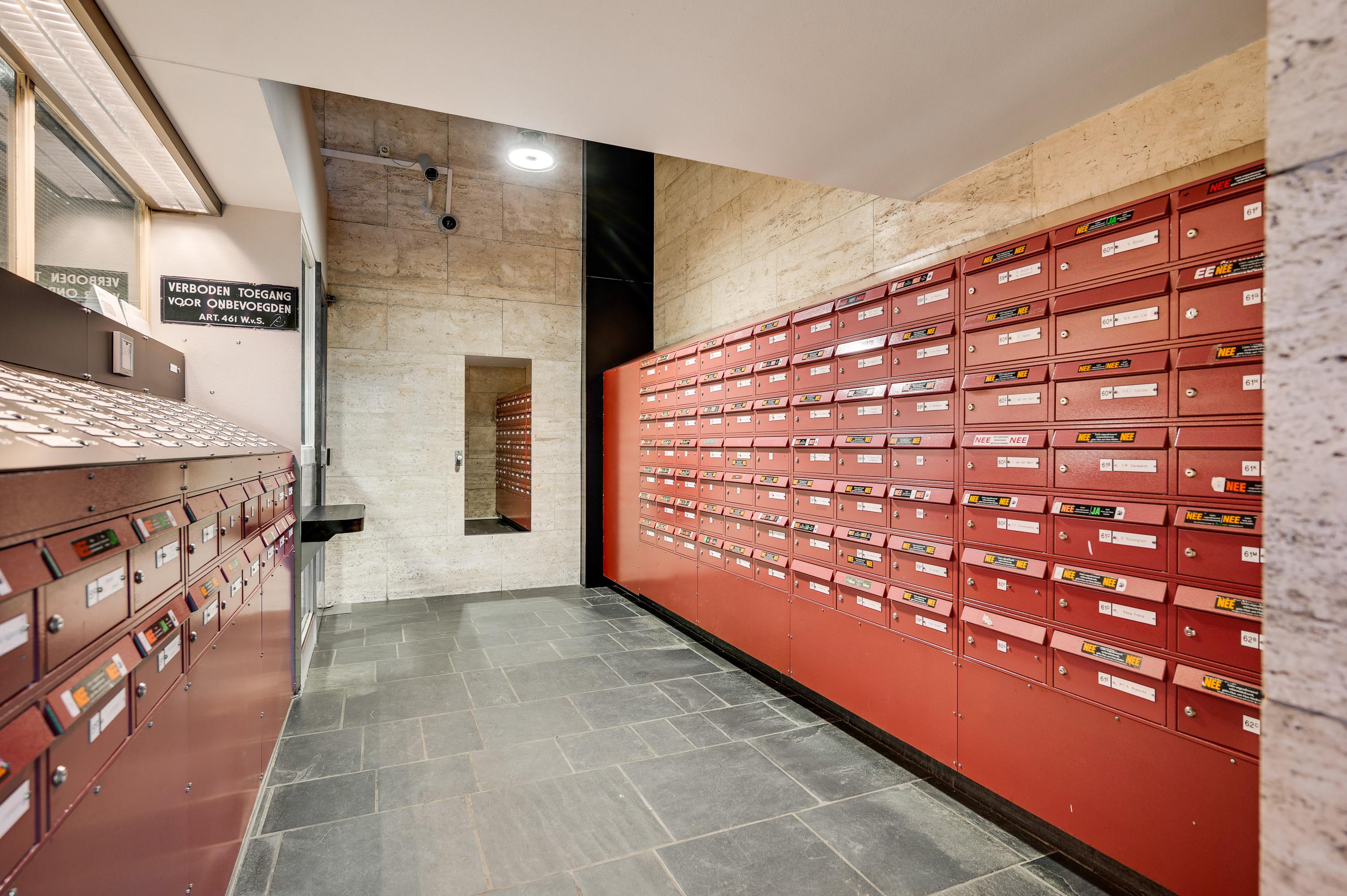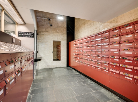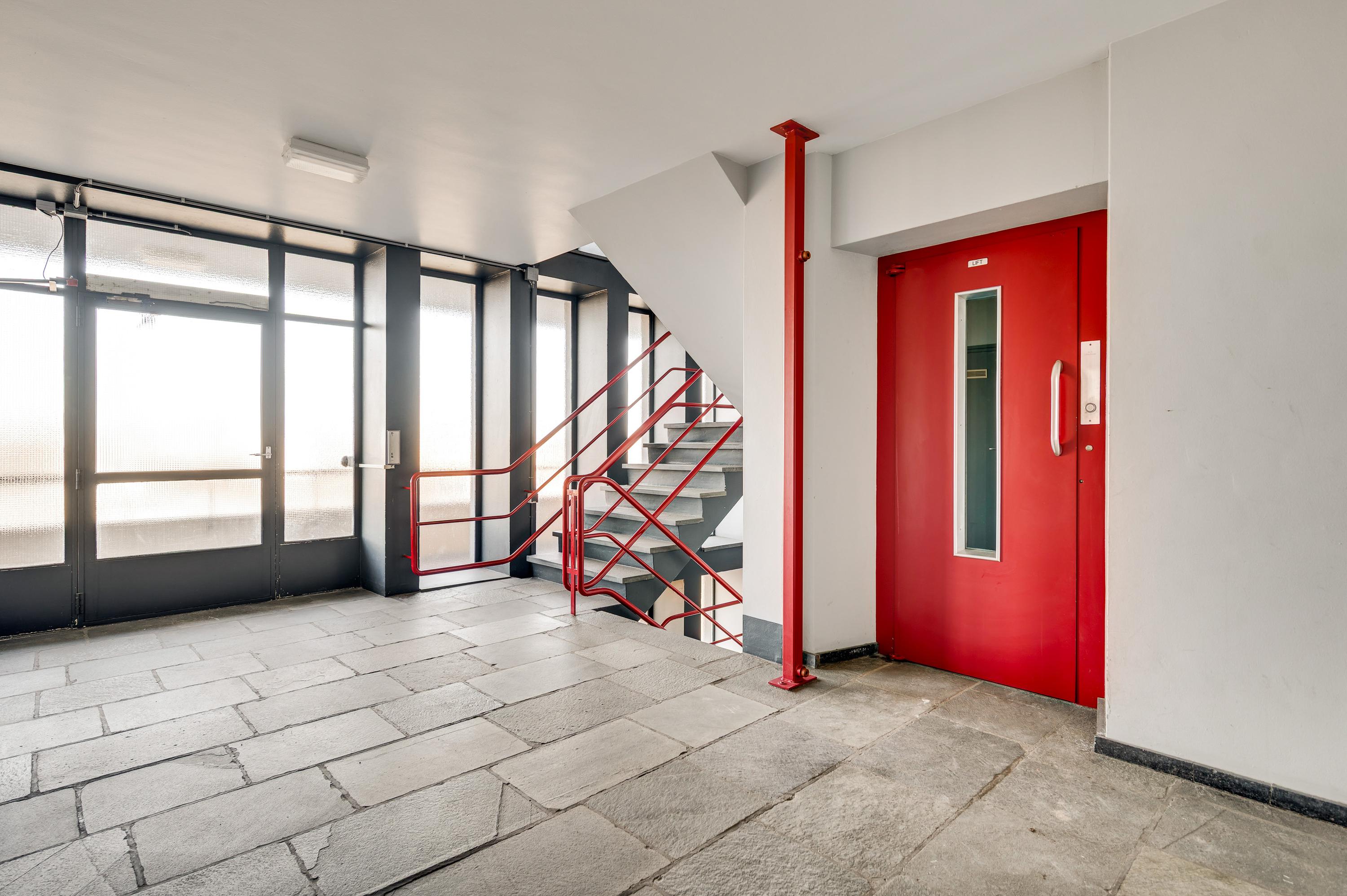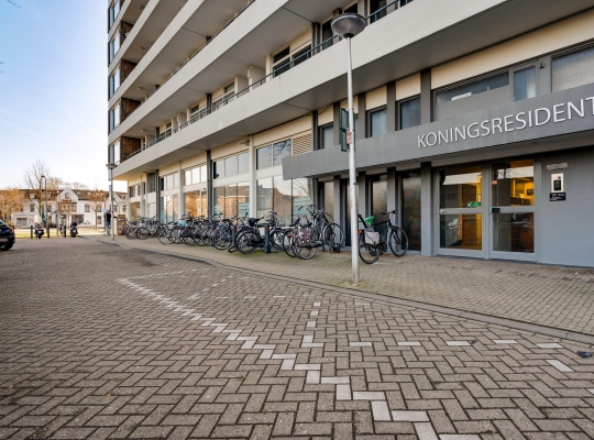 De entree van de Koningsresidentie, die ook bekendstaat als de ANWB-flat, is op de begane grond. Niet aan de kant van het park, maar aan de kant van een rustige straat met parkeergelegenheid. Eenmaal binnen kunt u met de trap of lift naar de fietsenkelder en naar het appartement, gesitueerd op de zesde verdieping.