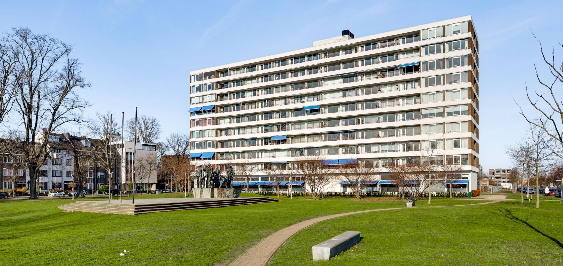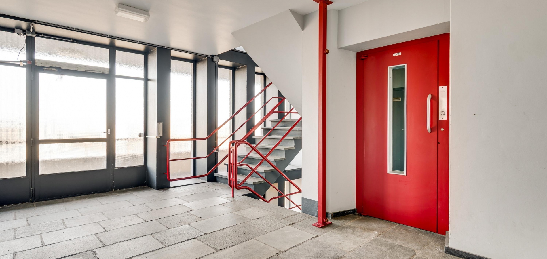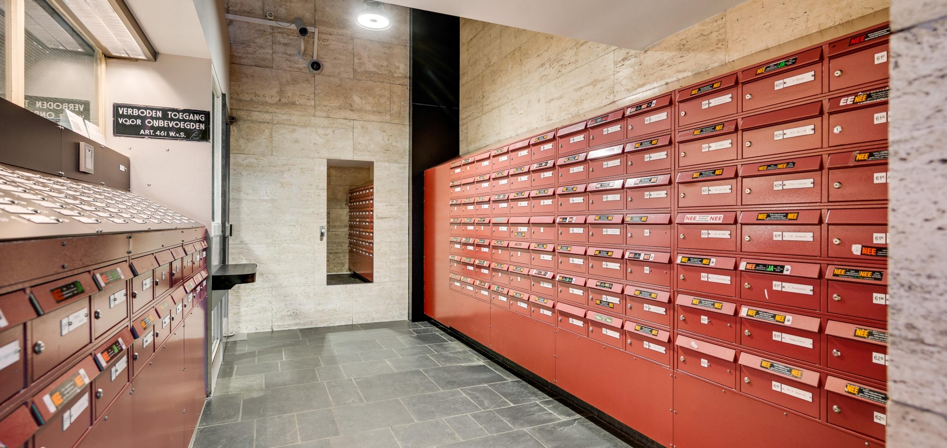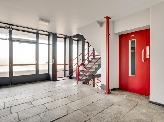 De entree van de Koningsresidentie, die ook bekendstaat als de ANWB-flat, is op de begane grond. Niet aan de kant van het park, maar aan de kant van een rustige straat met parkeergelegenheid. Eenmaal binnen kunt u met de trap of lift naar de fietsenkelder en naar het appartement, gesitueerd op de zesde verdieping.