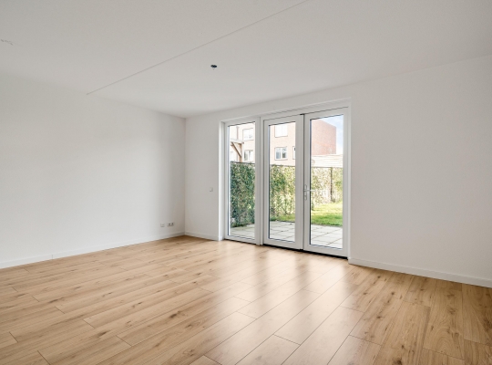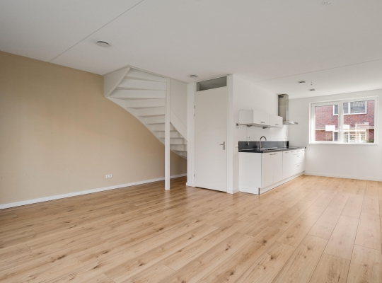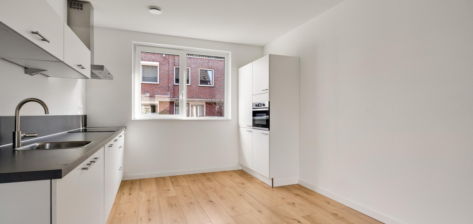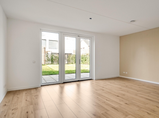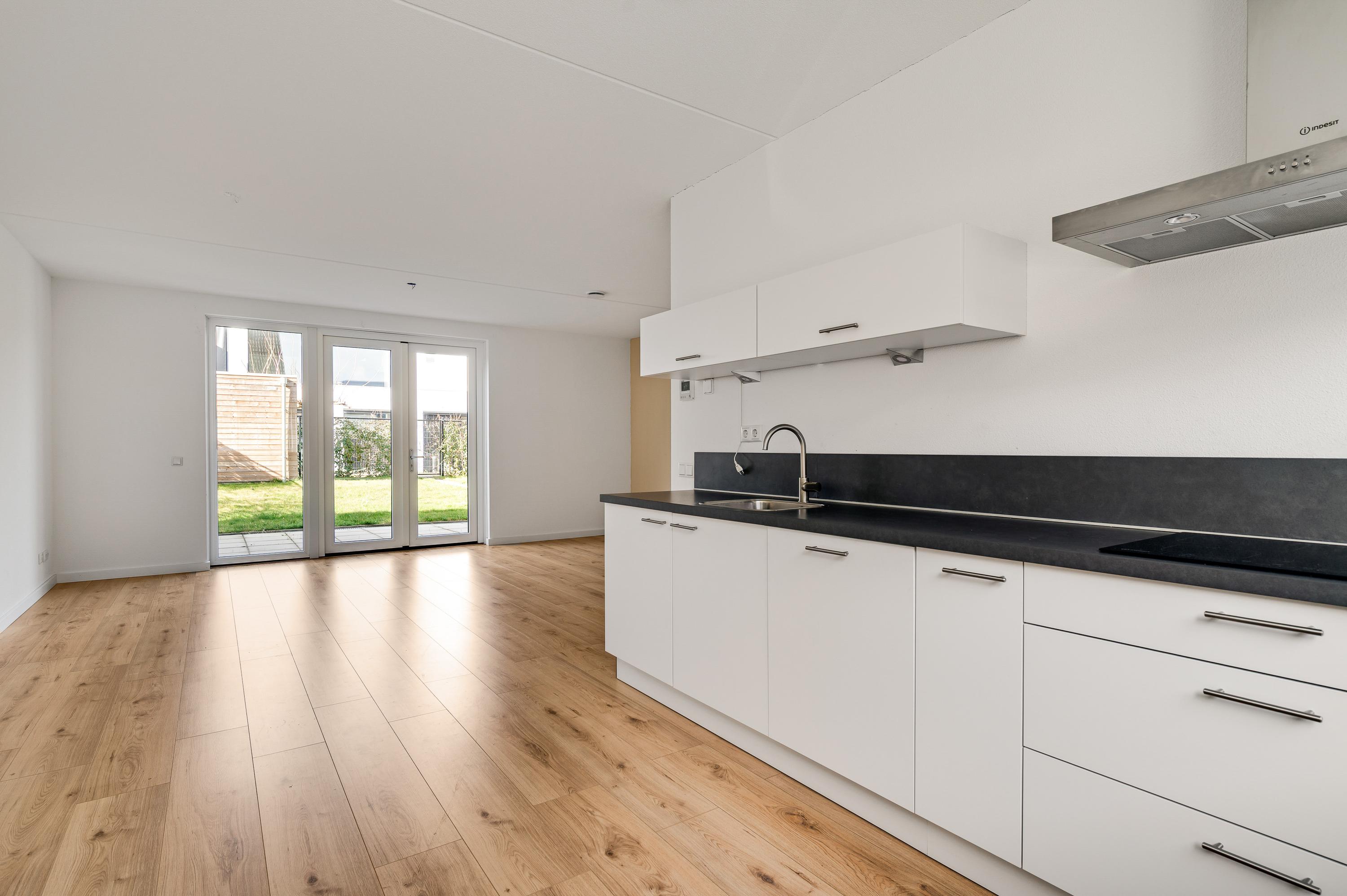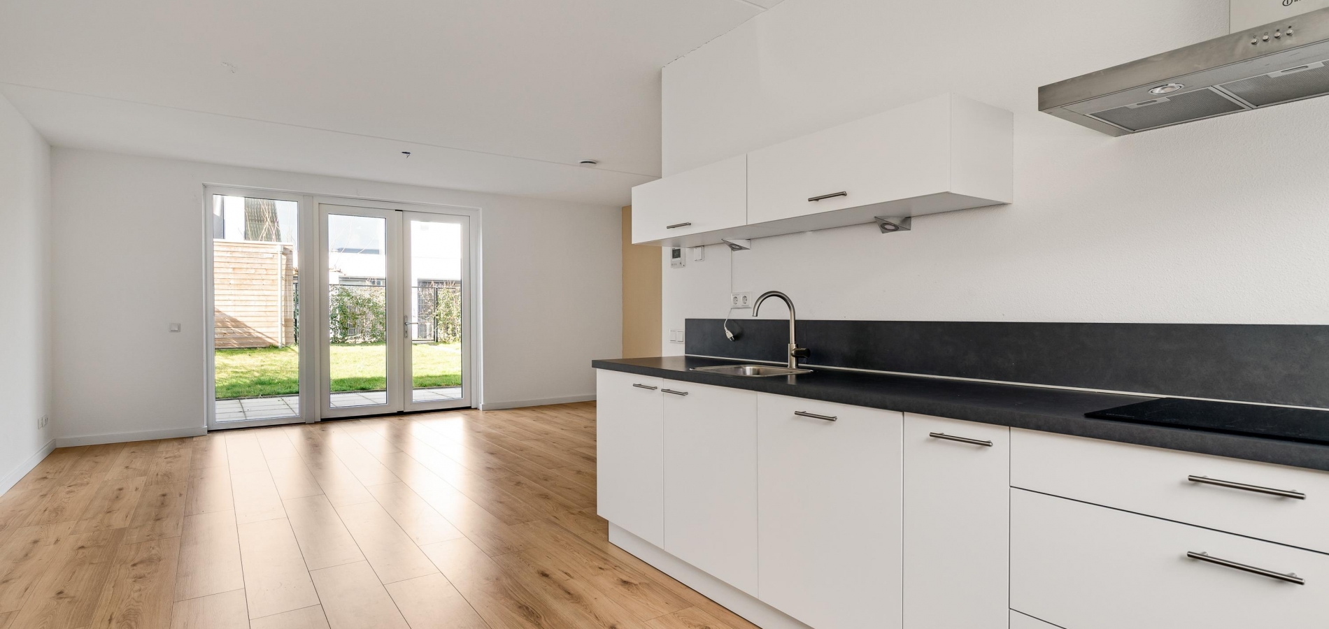 In de woonkamer (circa 5,76 x 4,57) ligt, net als in de hal en keuken, een mooie laminaatvloer met vloerverwarming. Rustige, warme kleuren bepalen de sfeer en openslaande deuren geven toegang tot de tuin. In de ruime keuken (circa 3,53 x 3,30) staat een lichte opstelling, met een hoge kastenwand en een antracietkleurig aanrechtblad. Alle benodigde apparatuur is ingebouwd: een inductie kookplaat, afzuigkap, combi-oven, vaatwasser en een koelkast.