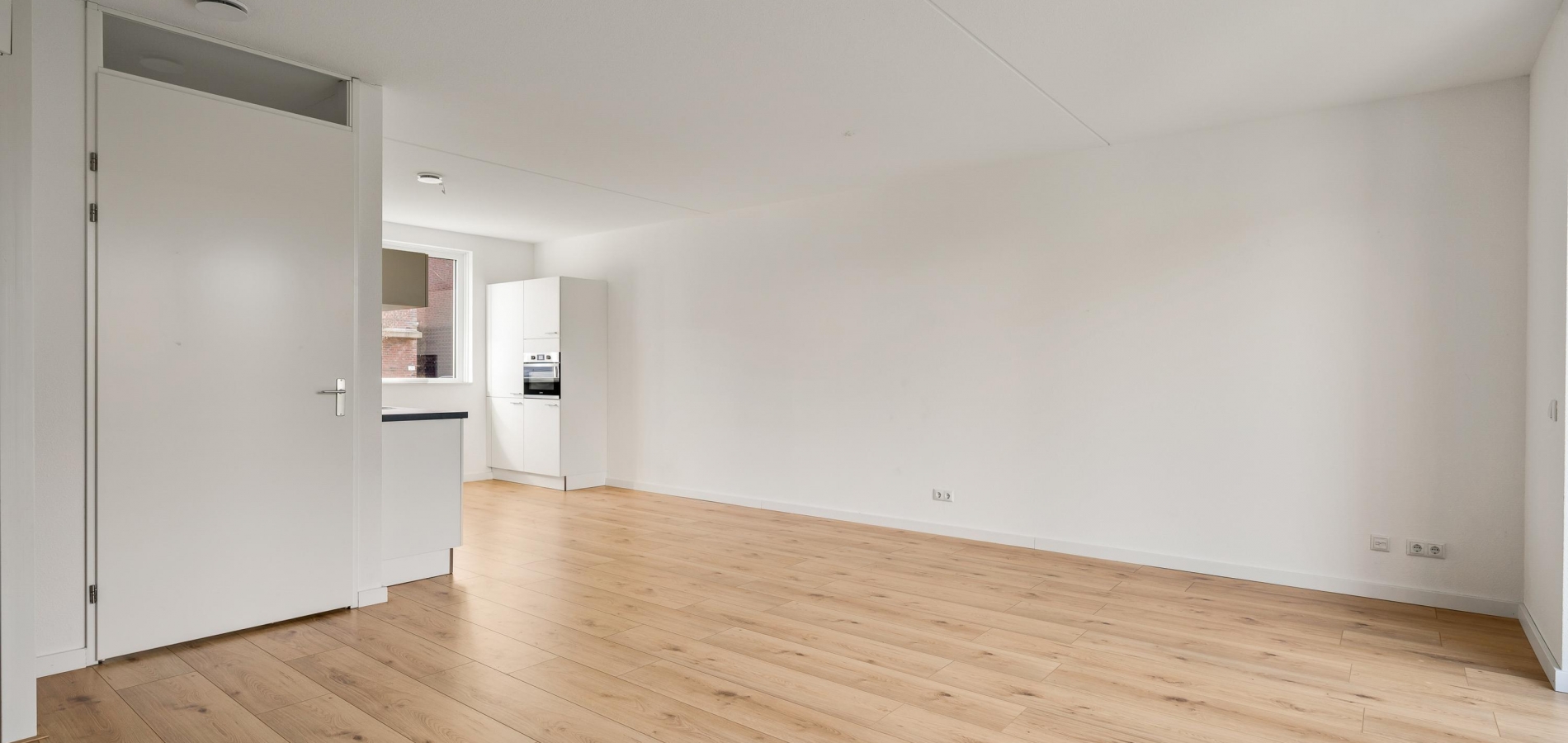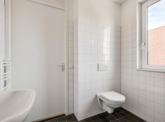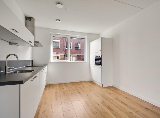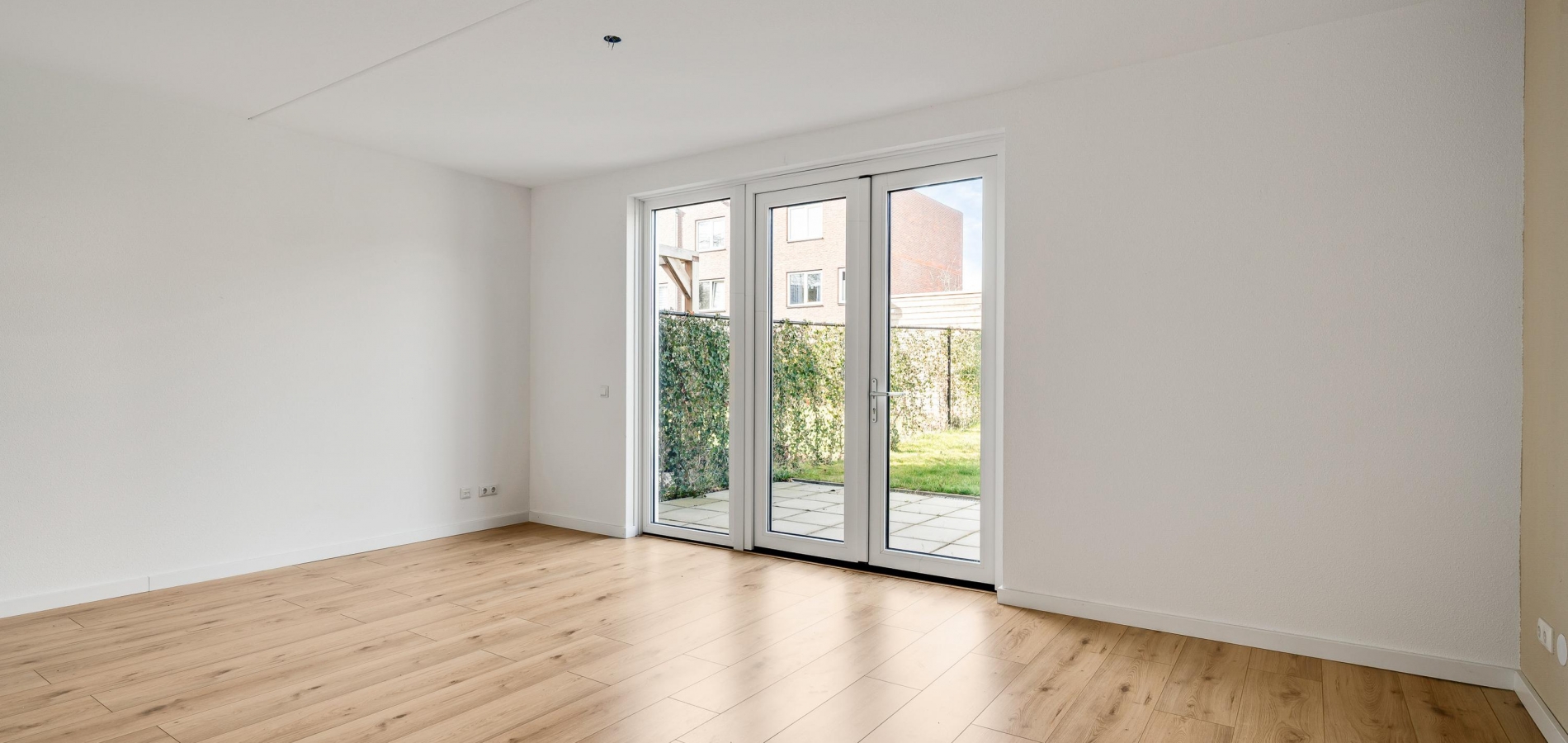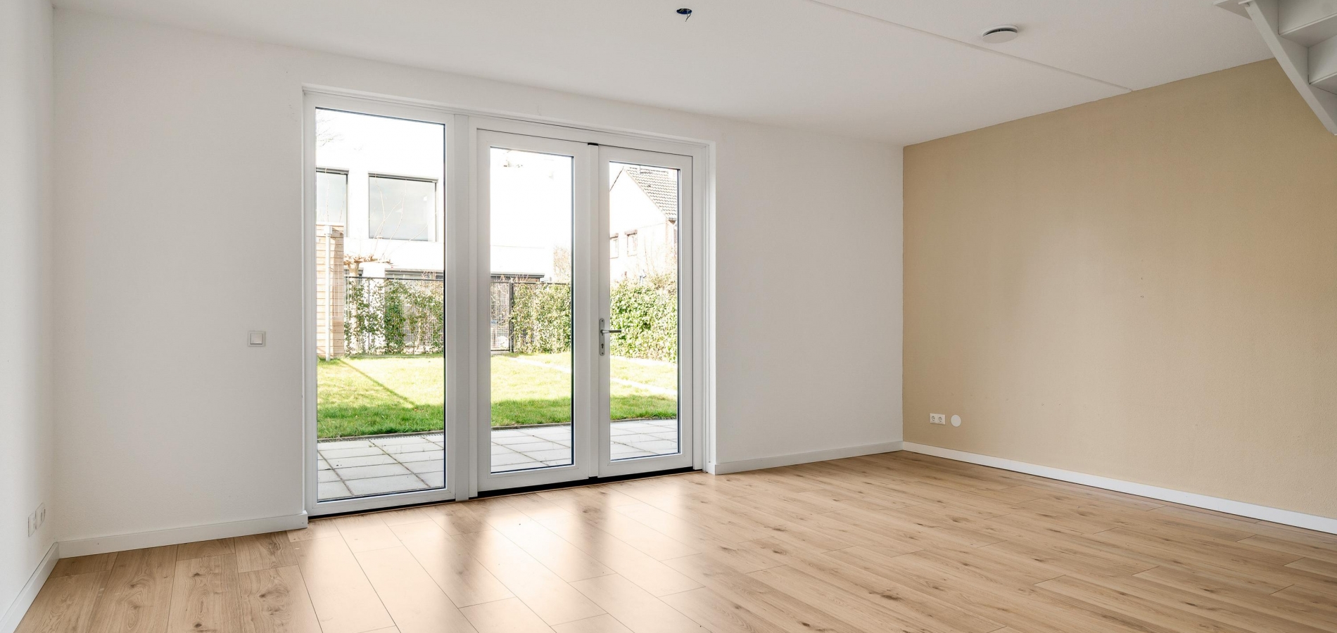 In de woonkamer (circa 5,76 x 4,57) ligt, net als in de hal en keuken, een mooie laminaatvloer met vloerverwarming. Rustige, warme kleuren bepalen de sfeer en openslaande deuren geven toegang tot de tuin. In de ruime keuken (circa 3,53 x 3,30) staat een lichte opstelling, met een hoge kastenwand en een antracietkleurig aanrechtblad. Alle benodigde apparatuur is ingebouwd: een inductie kookplaat, afzuigkap, combi-oven, vaatwasser en een koelkast.