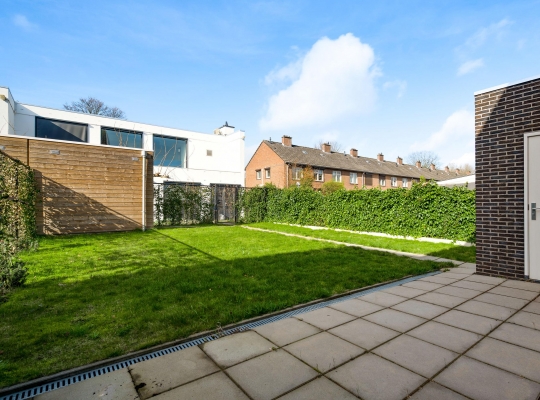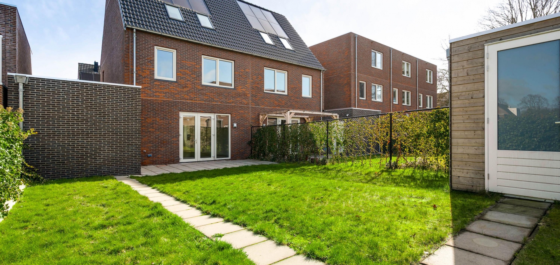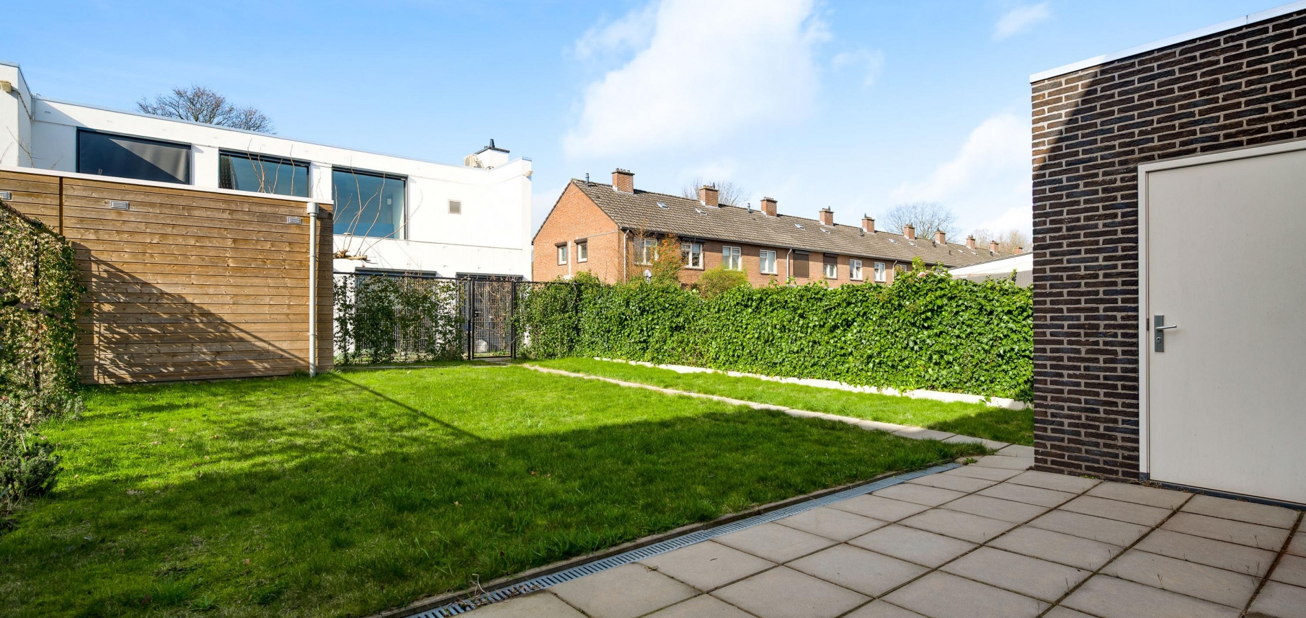 Deze woning heeft een ruime achtertuin op het westen, met een groot terras en gras. De erfafscheiding is in de afgelopen jaren flink gegroeid en er is een achterom. In de hoek van de tuin staat een berging (circa 2,89 x 2,00), voor het tuingereedschap en andere spullen.