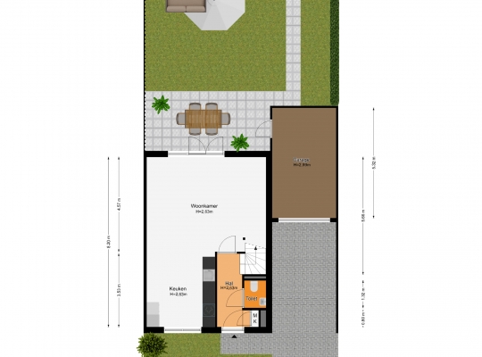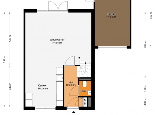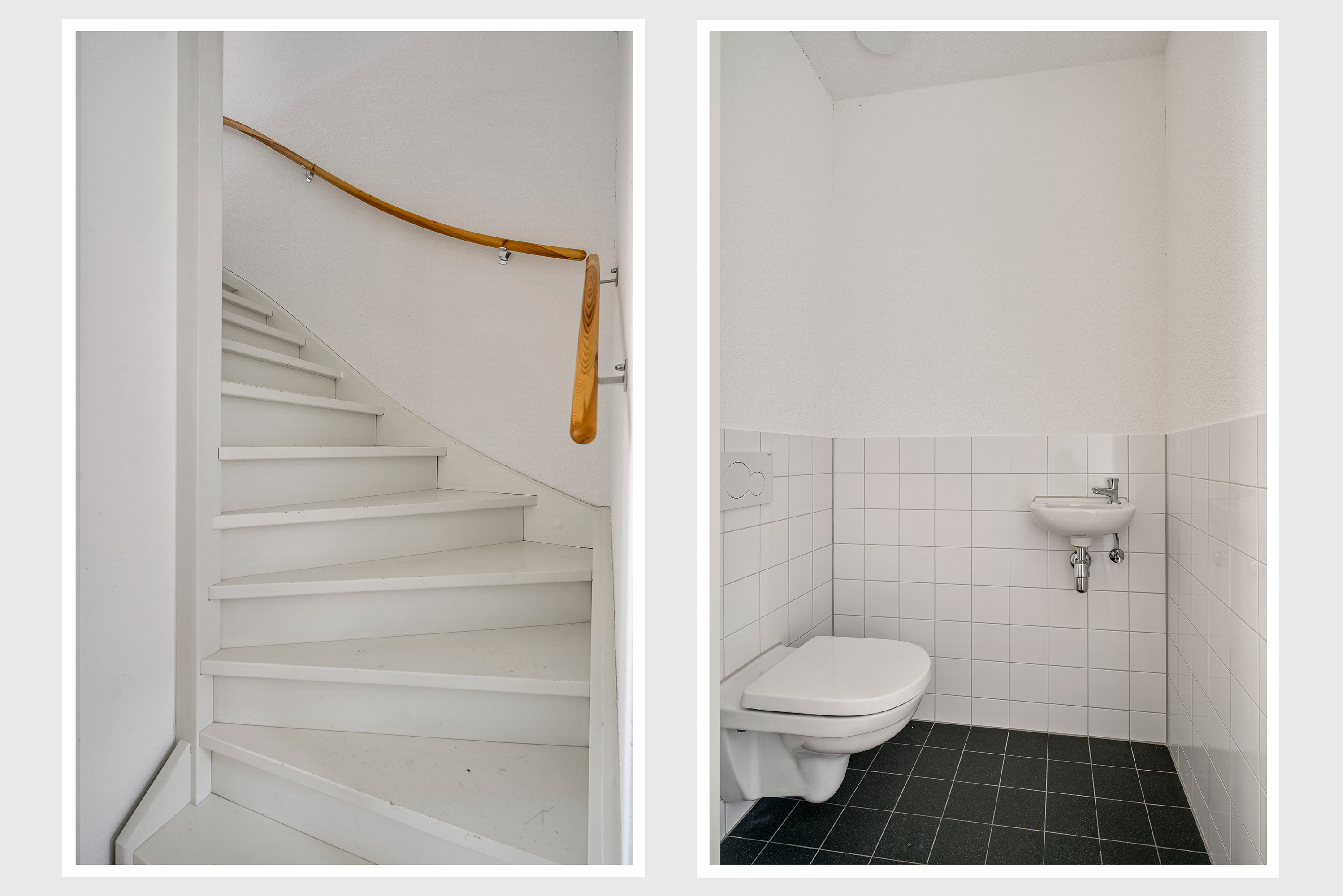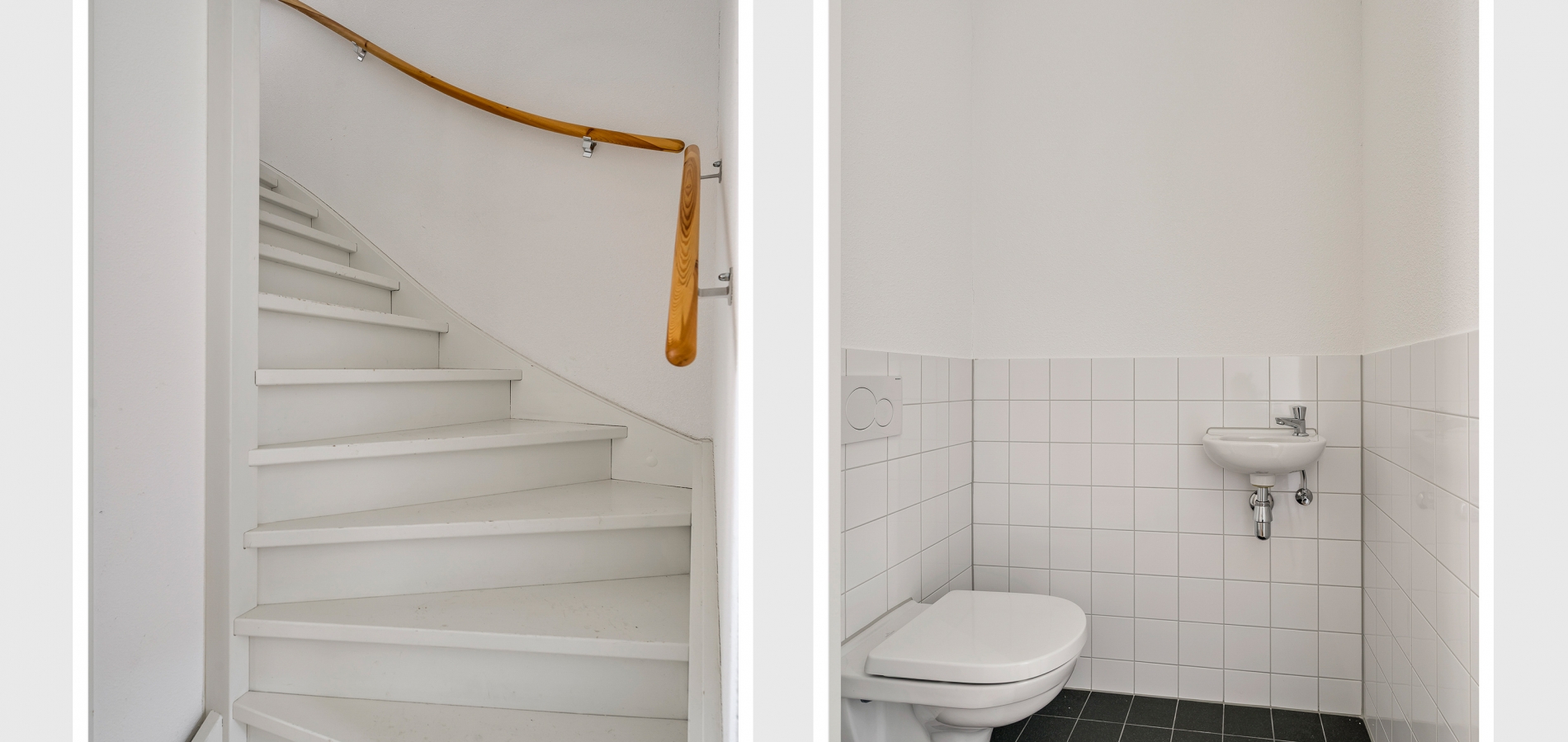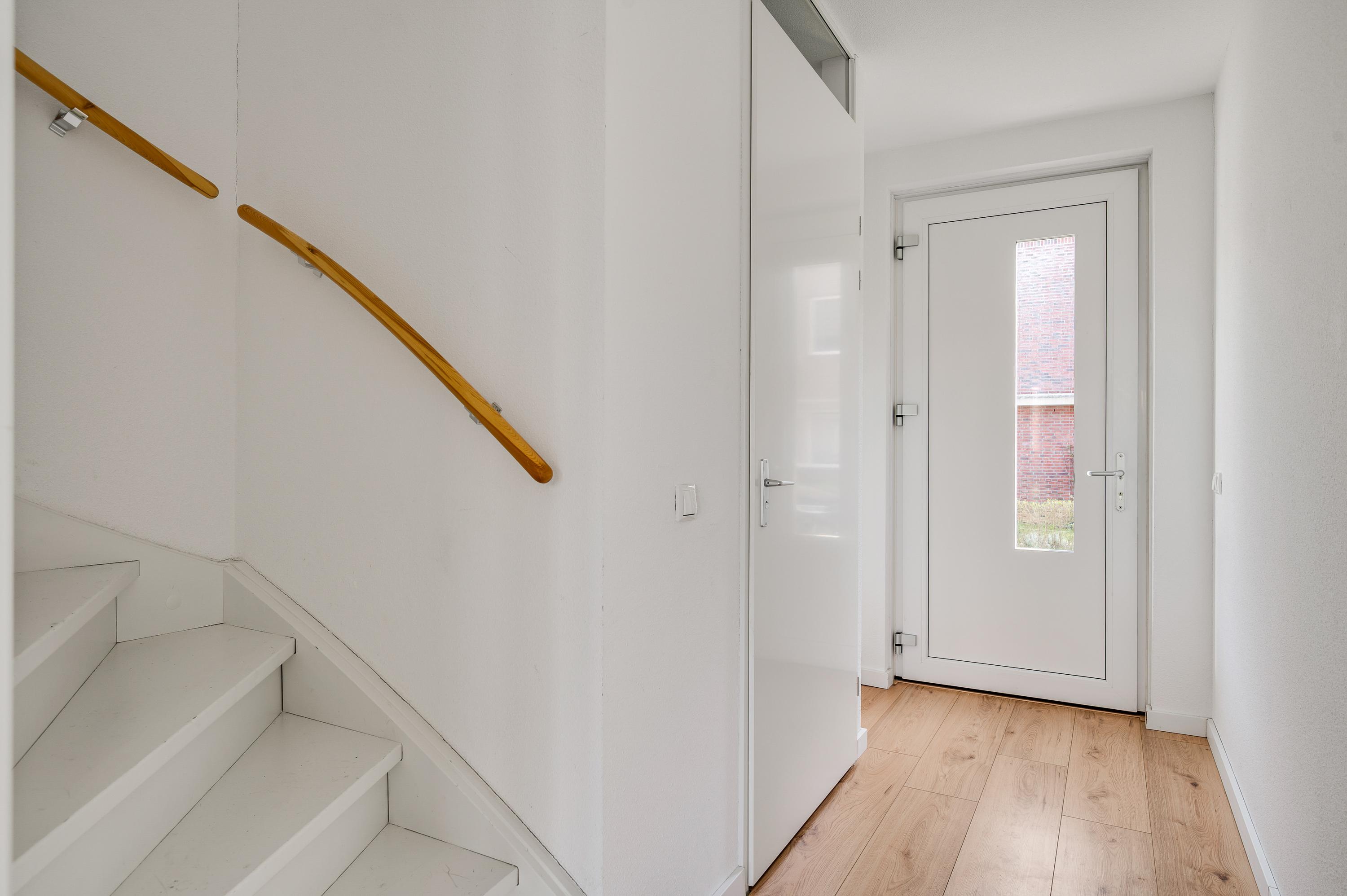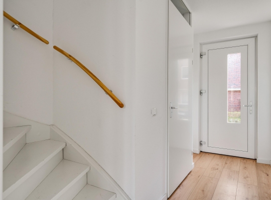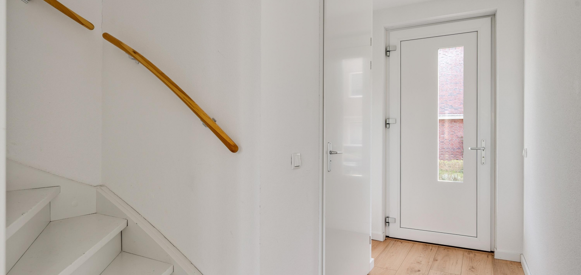 U zoekt niet te zoeken naar een parkeerplek, want deze woning heeft een oprit en een garage (circa 5,32 x 3,09). Op een paar stappen van de oprit is de voordeur, die toegang geeft tot de hal (circa 3,53 x 1,21). Hier zijn de meterkast, de trapopgang en de toiletruimte met fonteintje.