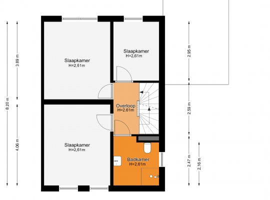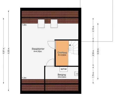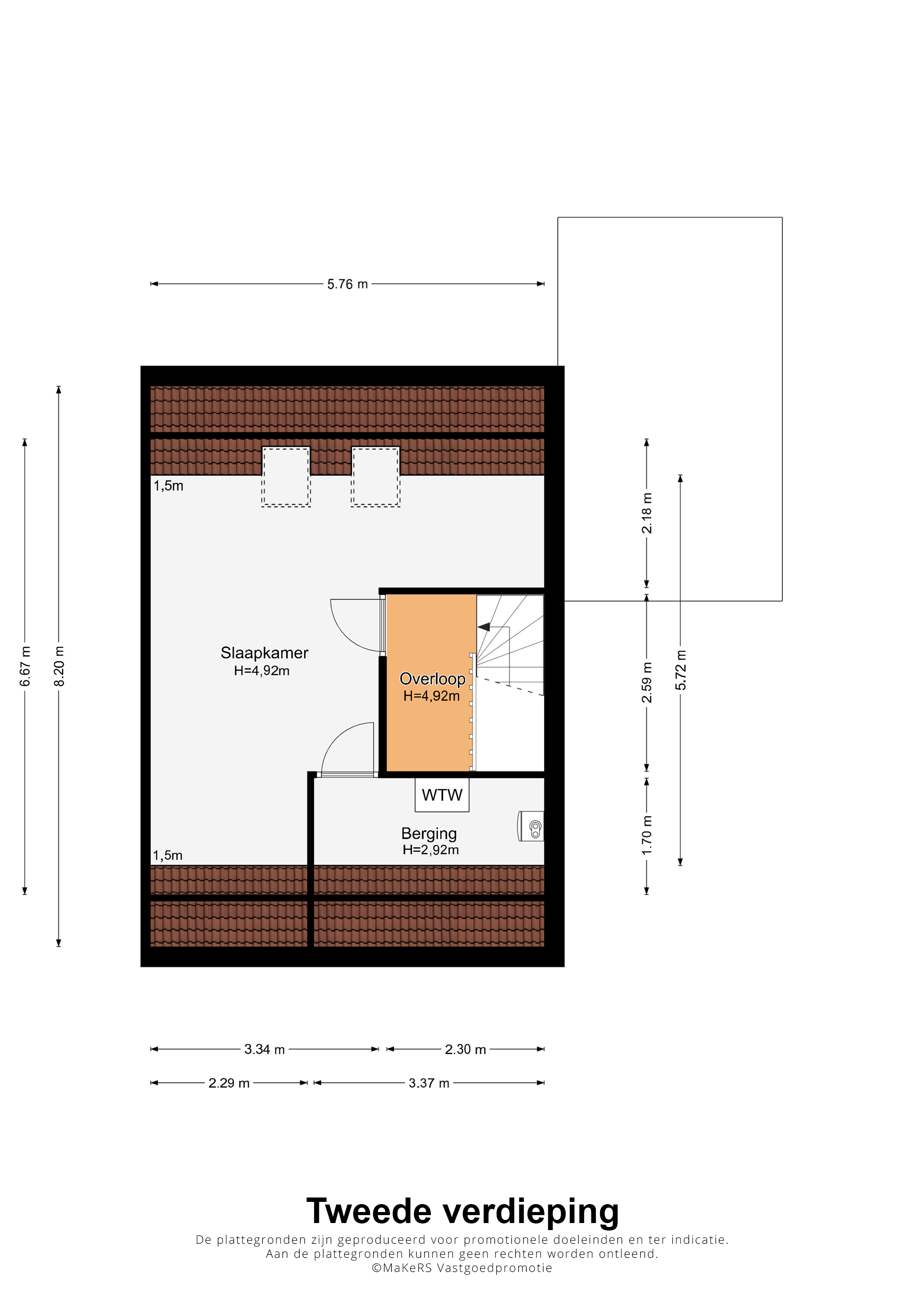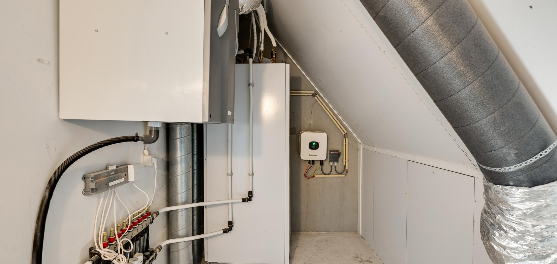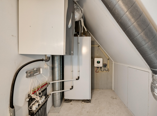 Verder zijn er een overloop en een berging (circa 3,37 x 1,70) op deze ruime verdieping. In de berging is de opstelling van de warmtepomp en het WTW-ventilatiesysteem.