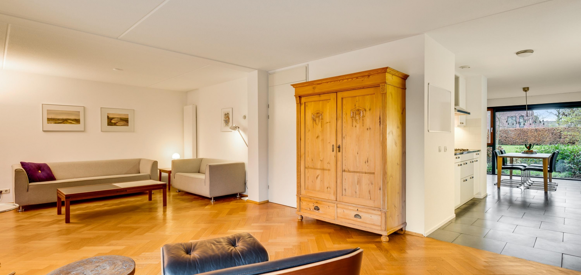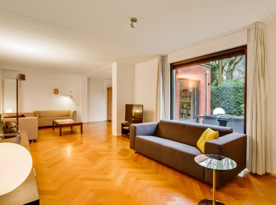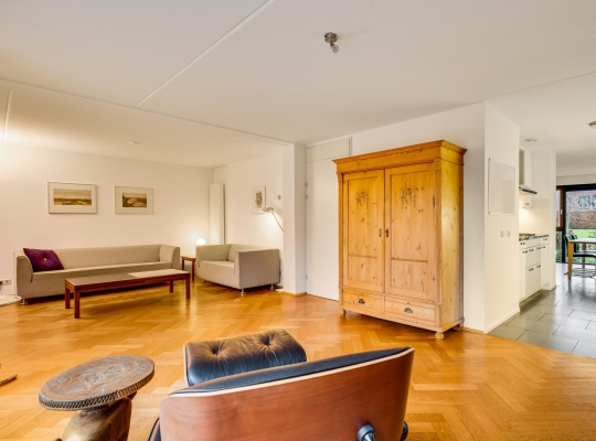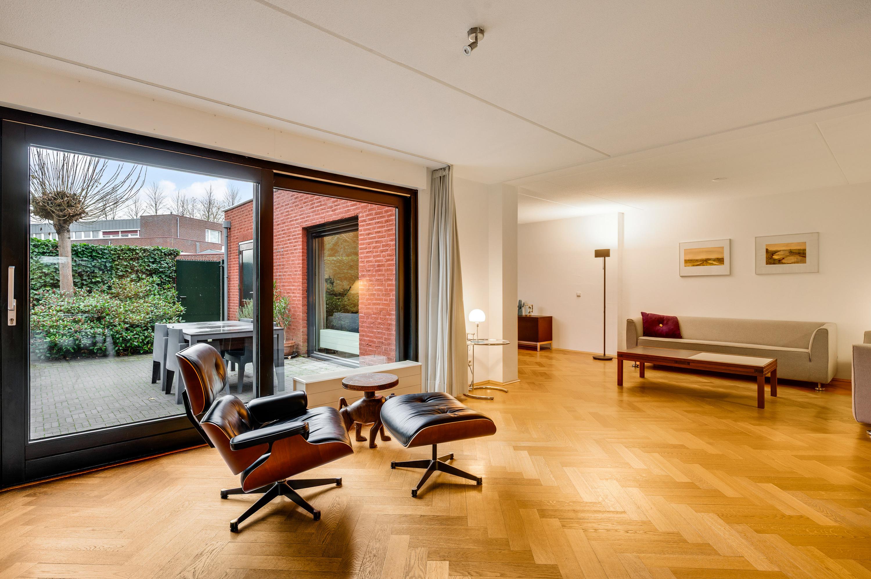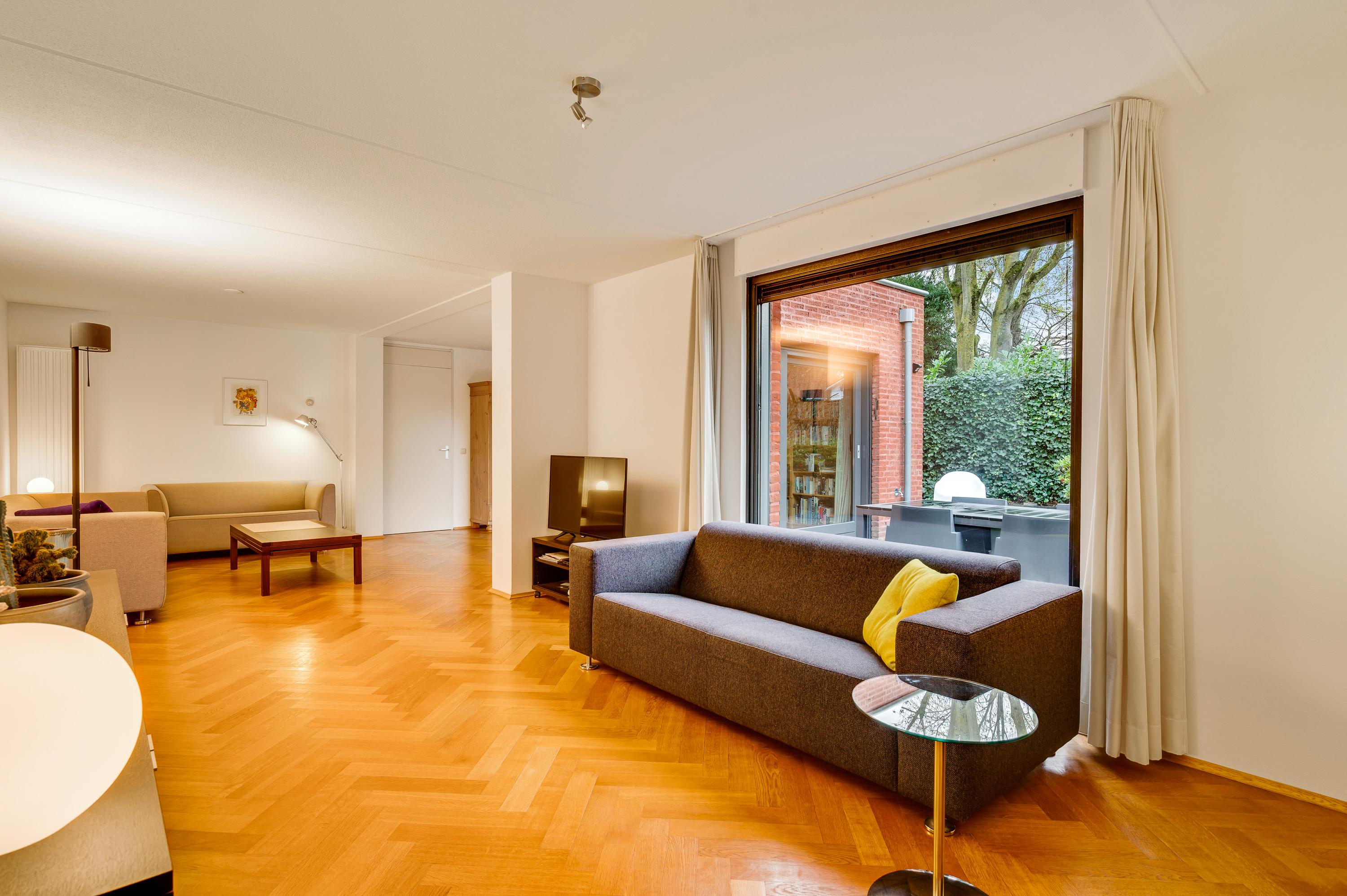 Aan de achterzijde is de verrassend grote woonkamer, in een L-vorm en met een schuifpui naar de tuin. De oppervlakte is circa 50 m2, fraai afgewerkt met een visgraat parketvloer en met diverse indelingsopties. Een zithoek, een aparte tv-hoek en een plek voor een fauteuil? Hier kan het allemaal!