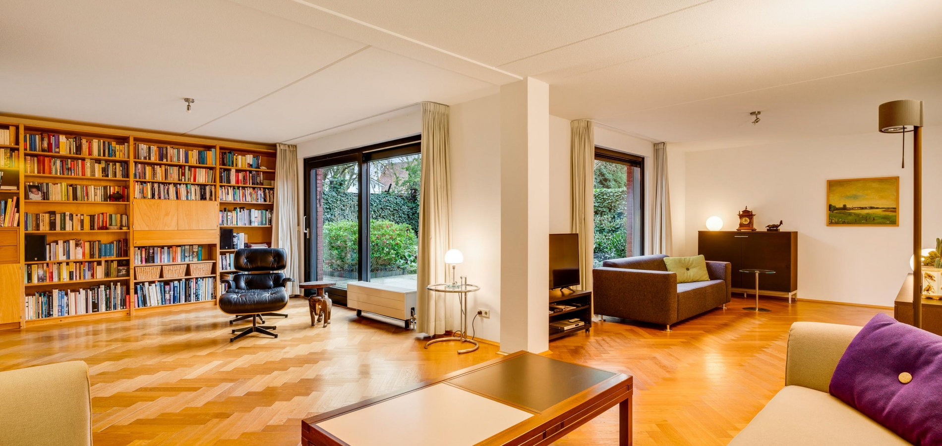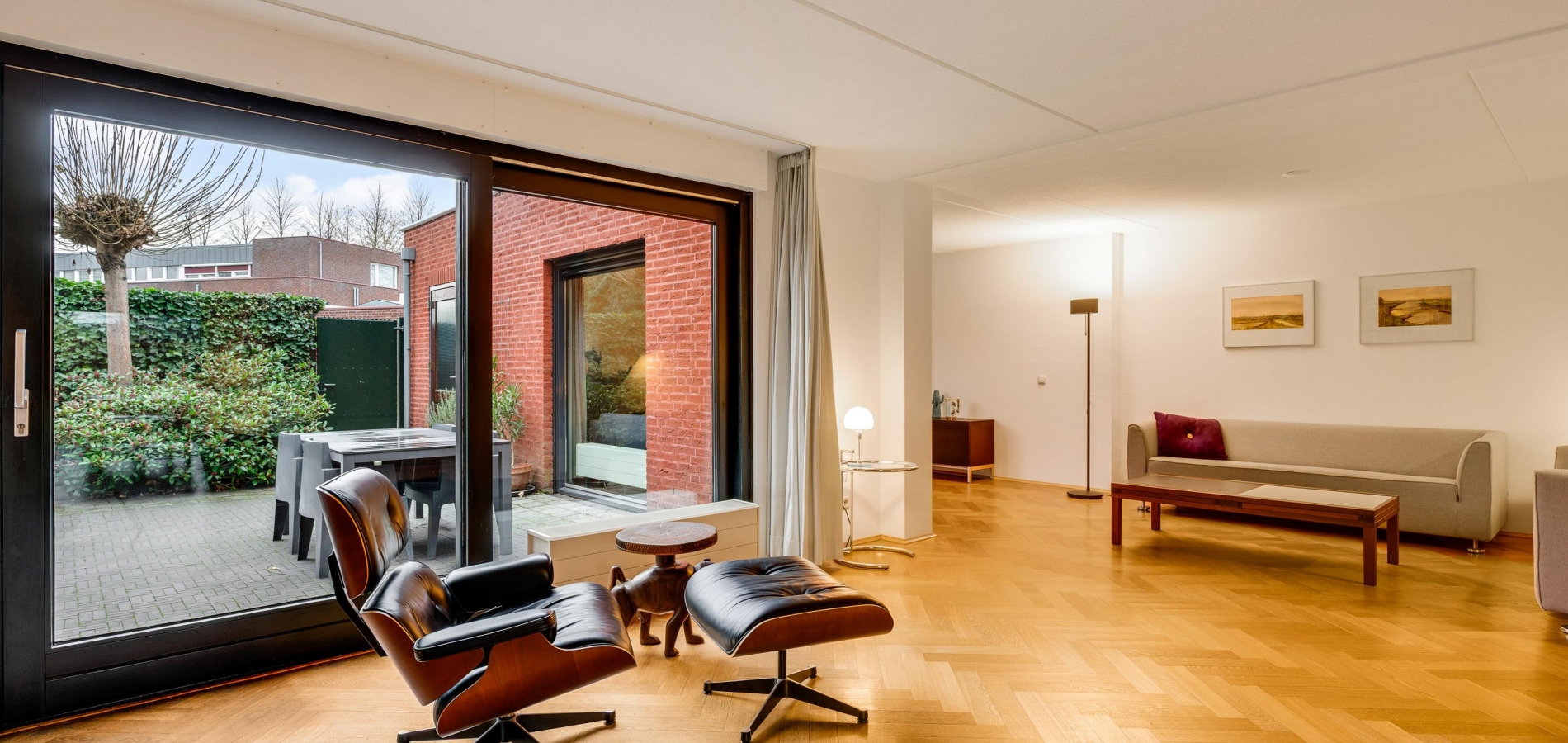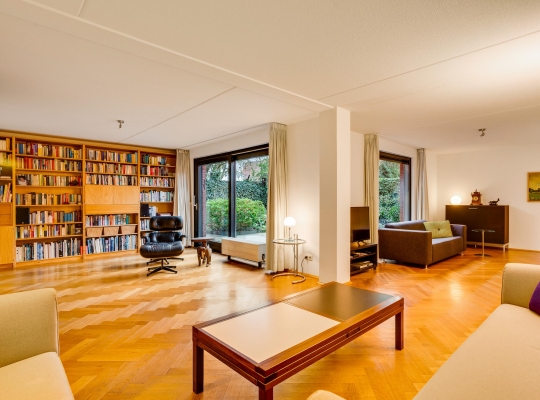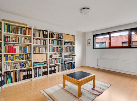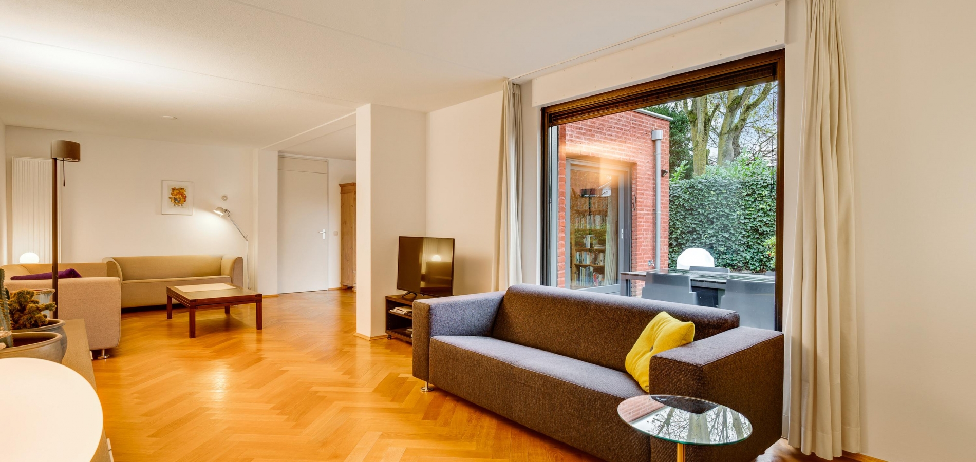 Aan de achterzijde is de verrassend grote woonkamer, in een L-vorm en met een schuifpui naar de tuin. De oppervlakte is circa 50 m2, fraai afgewerkt met een visgraat parketvloer en met diverse indelingsopties. Een zithoek, een aparte tv-hoek en een plek voor een fauteuil? Hier kan het allemaal!