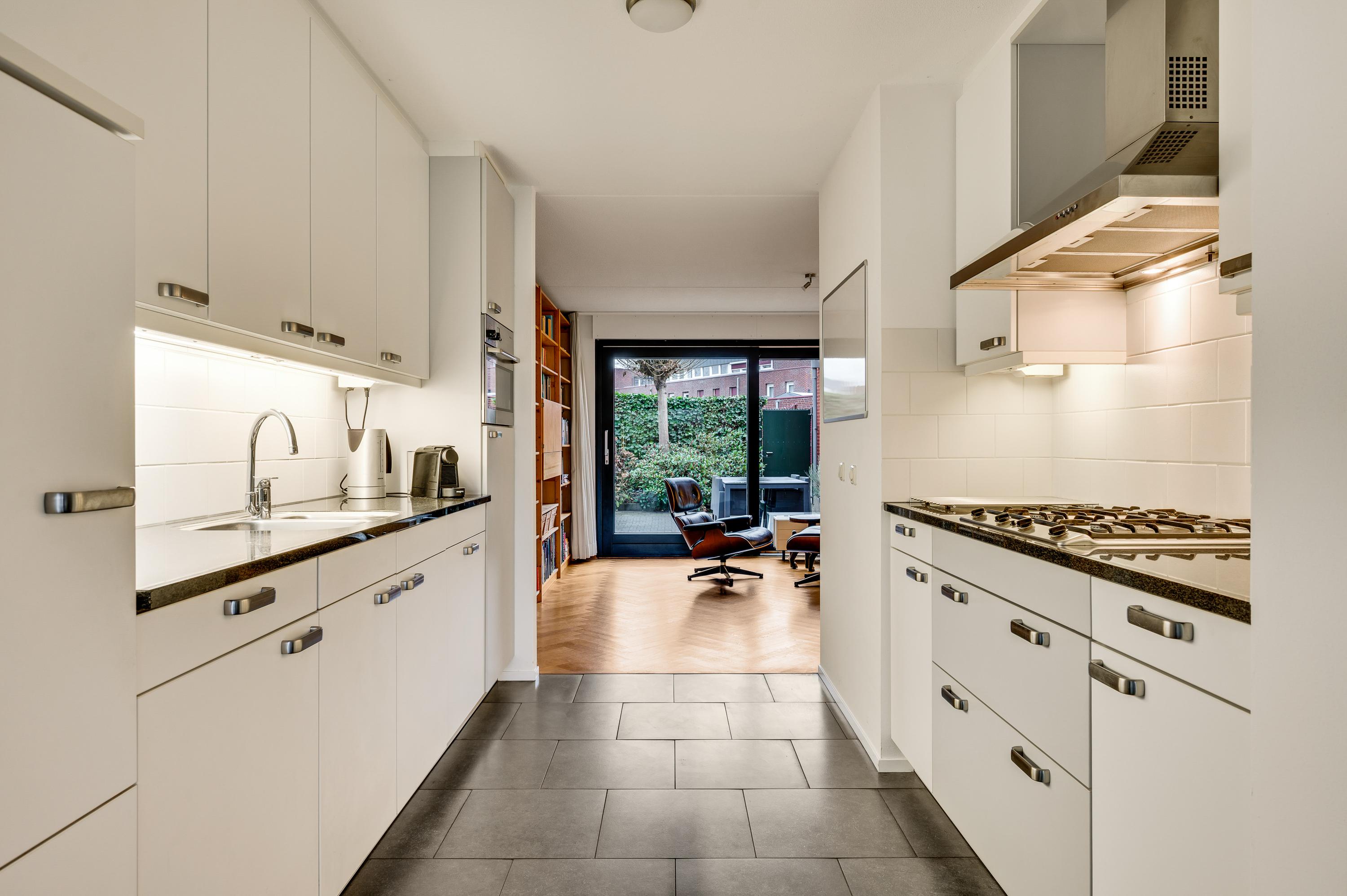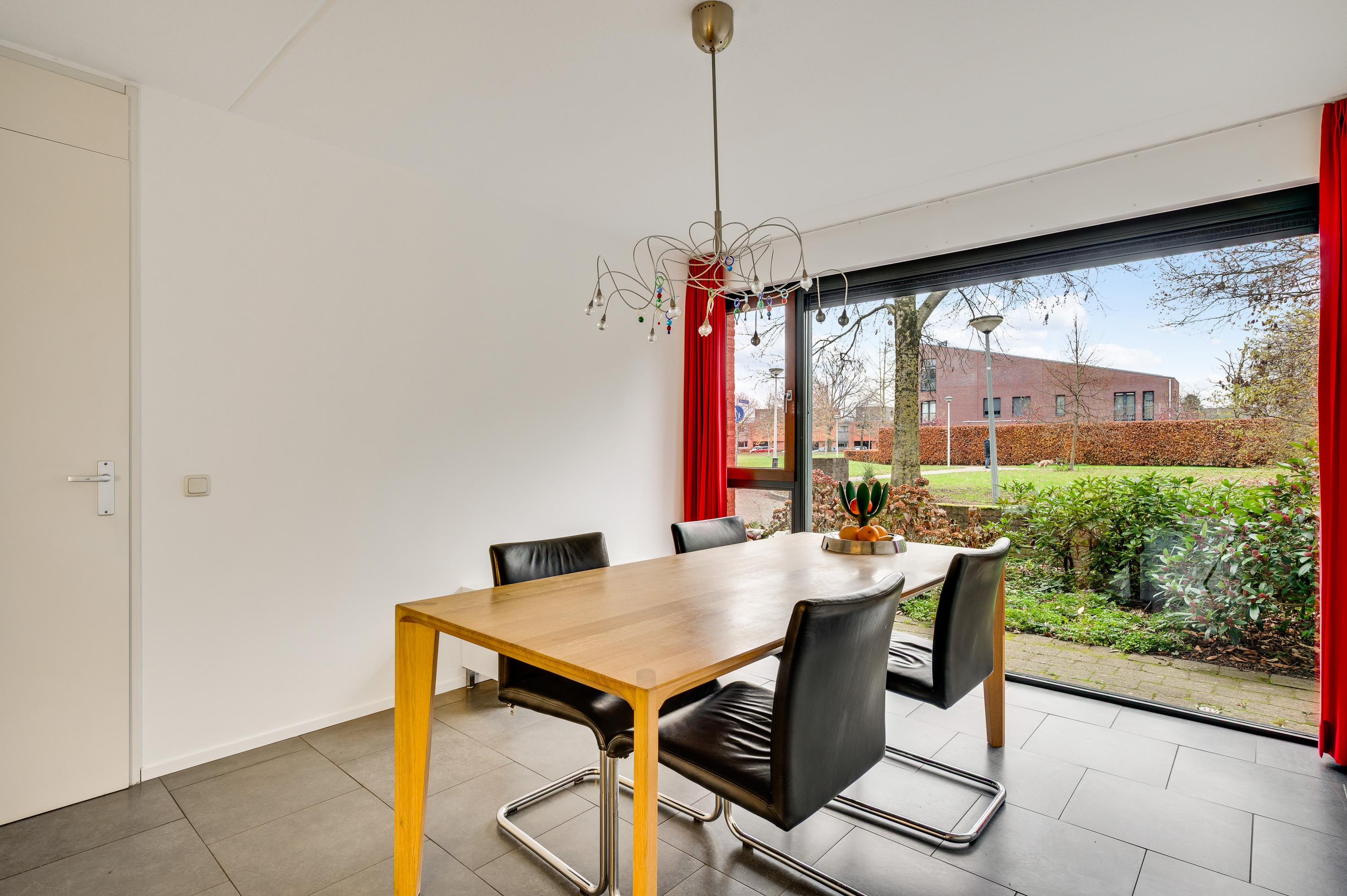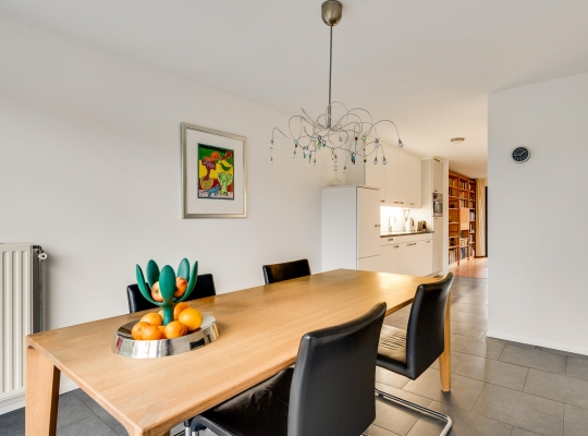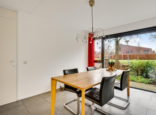 De eetkamer (circa 4,03 x 3,26) staat in open verbinding met de keuken (circa 3,41 x 2,65/2,05), beiden met een grijze tegelvloer. Terwijl u aan tafel zit, geniet u van het mooie uitzicht op het groen van het Maartveld. In de keuken staat een dubbele wandopstelling met inbouwapparatuur van Miele: een gaskookplaat, afzuigkap, combi- oven, vaatwasser en een koelkast. De inpandig te bereiken garage (circa 5,90 x 3,07/2,73) kan deels als provisieruimte annex bijkeuken worden gebruikt. En uiteraard voor de (kinder)fietsen!