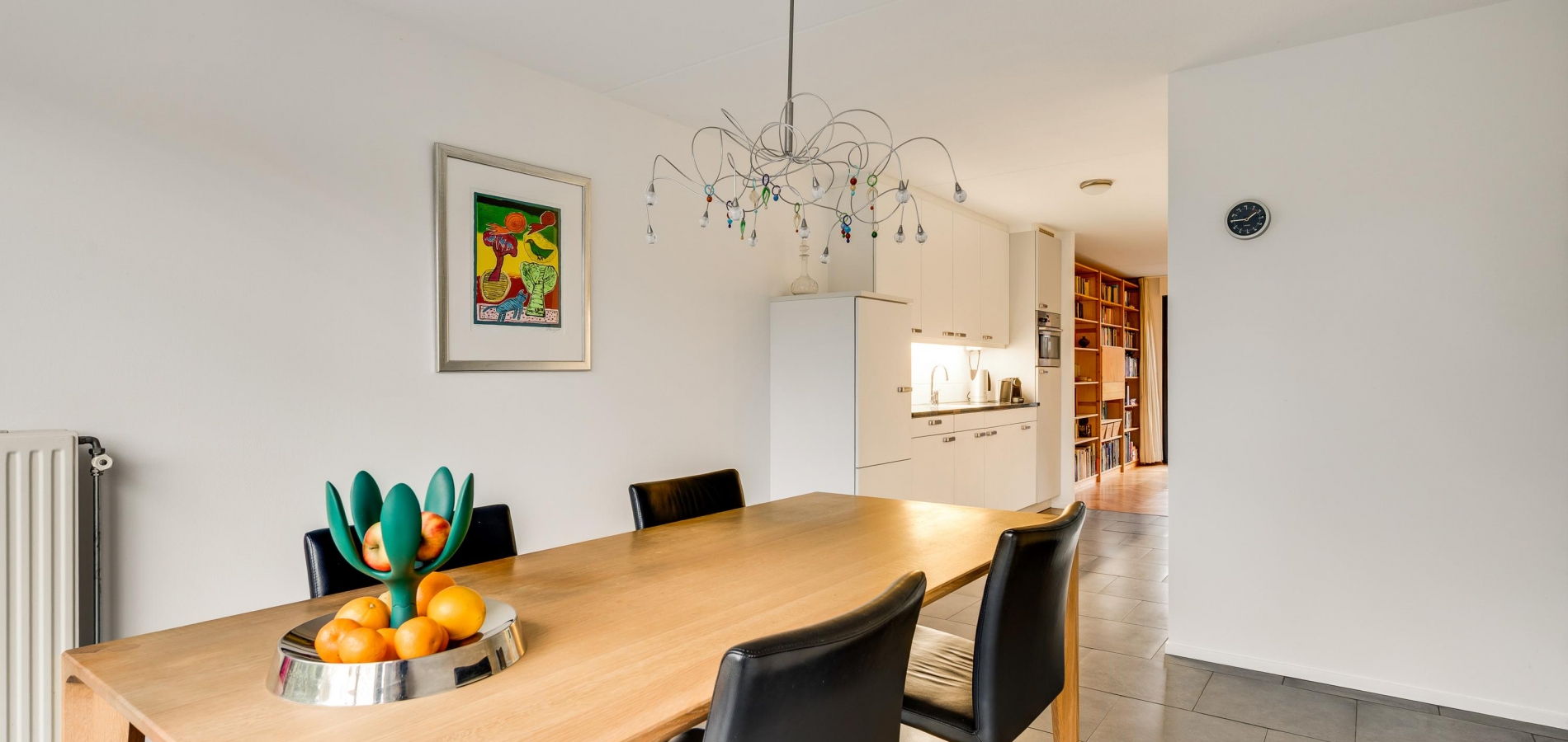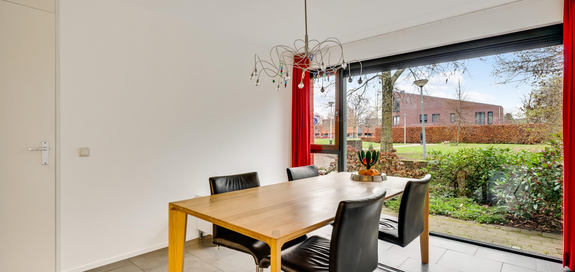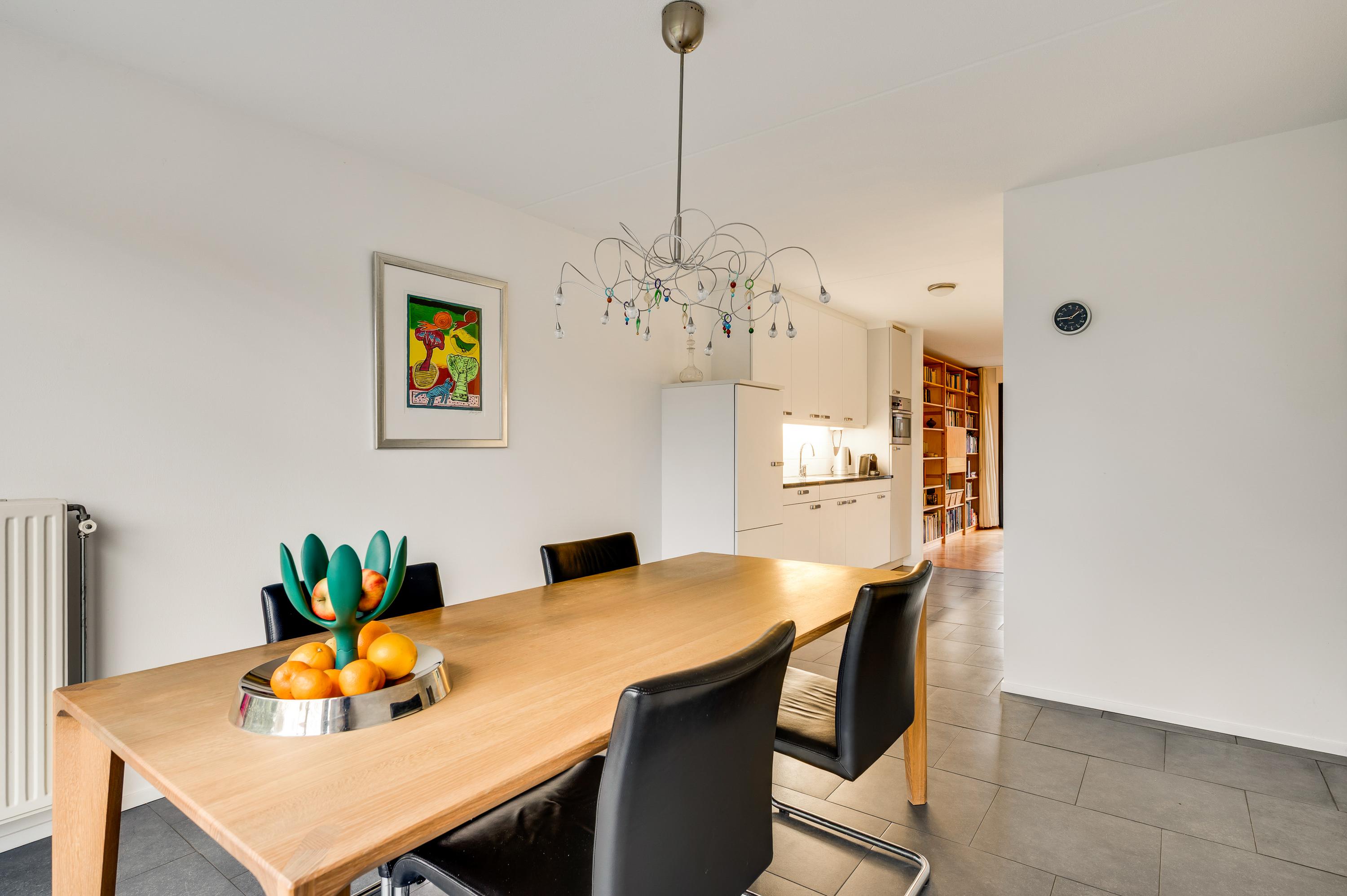 De eetkamer (circa 4,03 x 3,26) staat in open verbinding met de keuken (circa 3,41 x 2,65/2,05), beiden met een grijze tegelvloer. Terwijl u aan tafel zit, geniet u van het mooie uitzicht op het groen van het Maartveld. In de keuken staat een dubbele wandopstelling met inbouwapparatuur van Miele: een gaskookplaat, afzuigkap, combi- oven, vaatwasser en een koelkast. De inpandig te bereiken garage (circa 5,90 x 3,07/2,73) kan deels als provisieruimte annex bijkeuken worden gebruikt. En uiteraard voor de (kinder)fietsen!