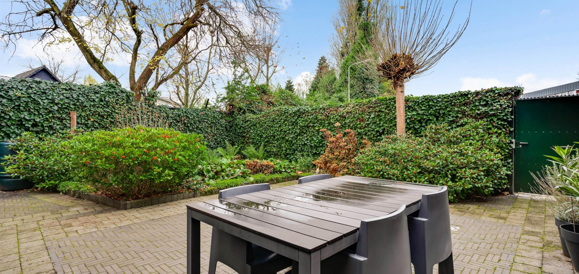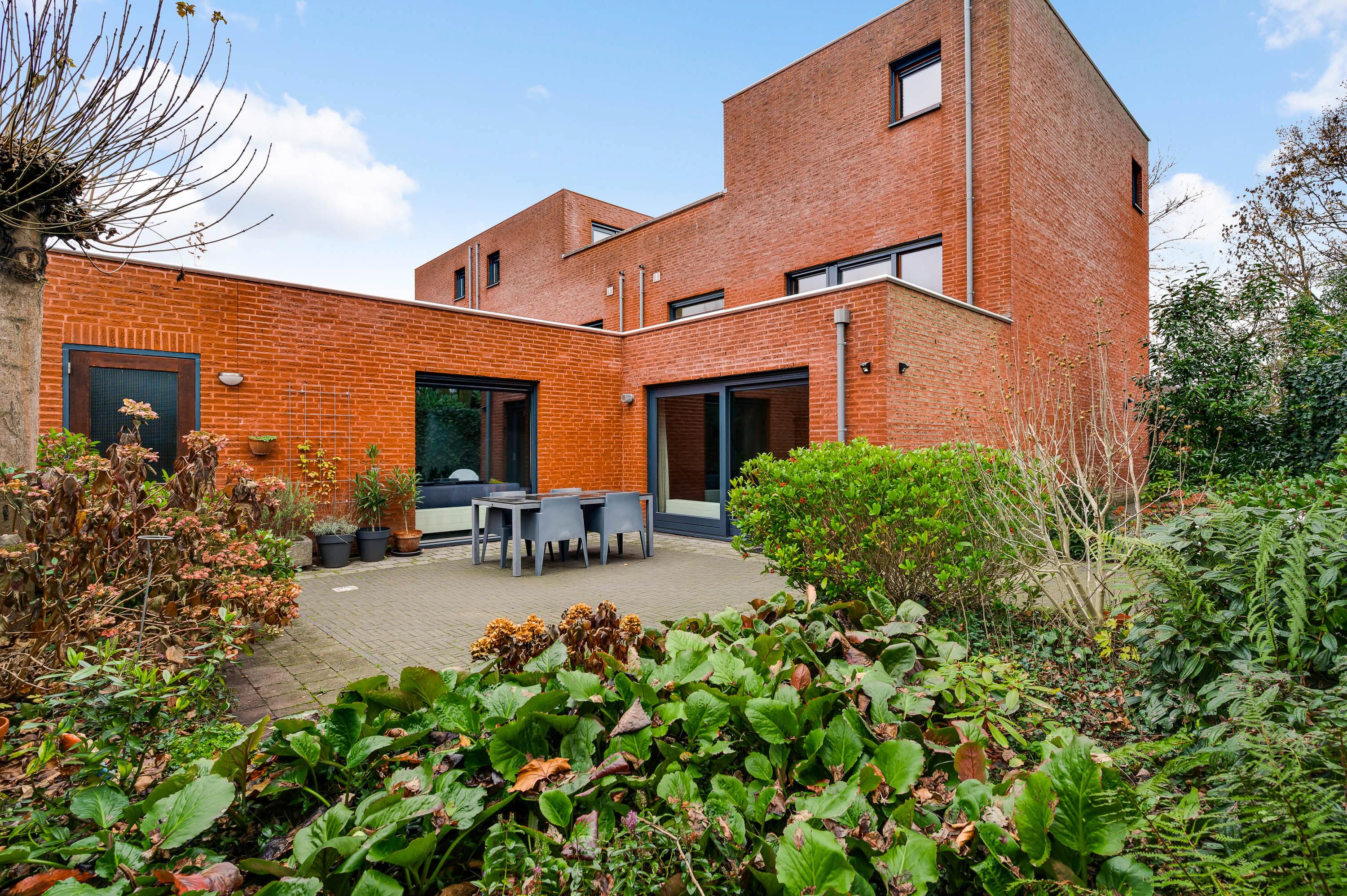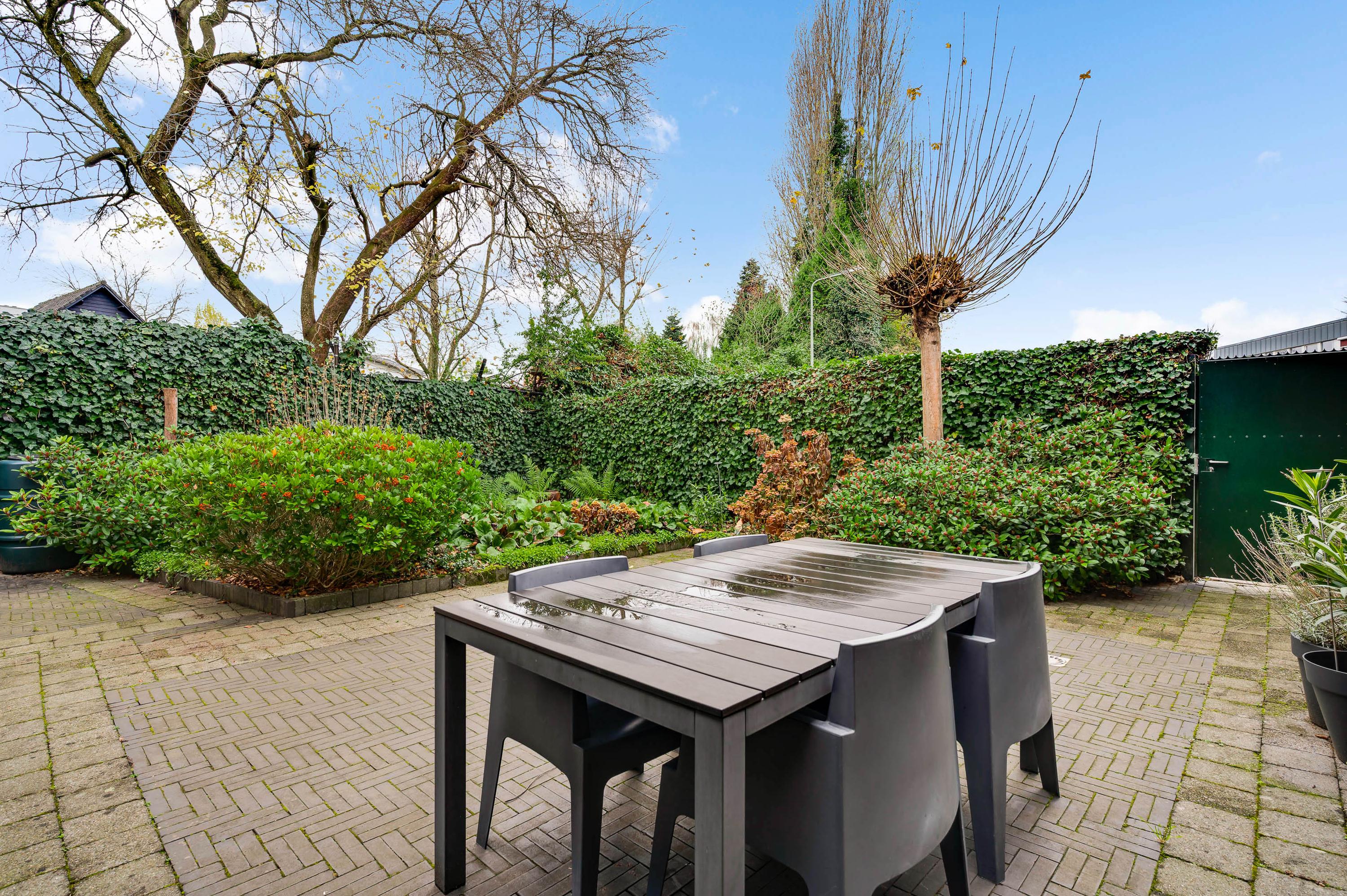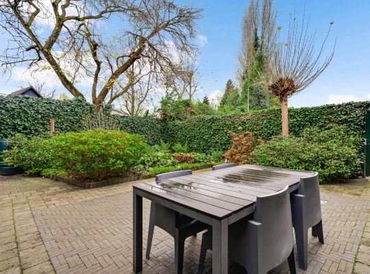 De achtertuin, gesitueerd op het westen, is ingericht met twee terrassen en veel groen. In het verlengde van de aanbouw is een (fietsen)berging van circa 3,85 x 2,10 meter, die ook geschikt is voor het tuingereedschap. Er is een eigen achterom, afgesloten met een poort, en vanuit de achtertuin is het binnenterrein met parkeergelegenheid (in mandelig eigendom) te bereiken. Ook in de voortuin ziet u veel groen, merendeels groenblijvend en onderhoudsvriendelijk.