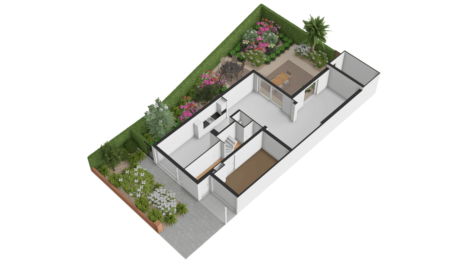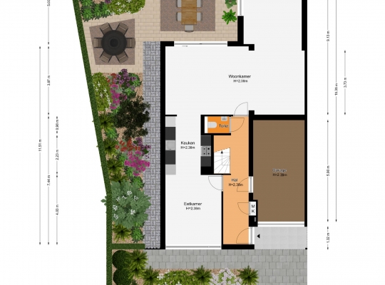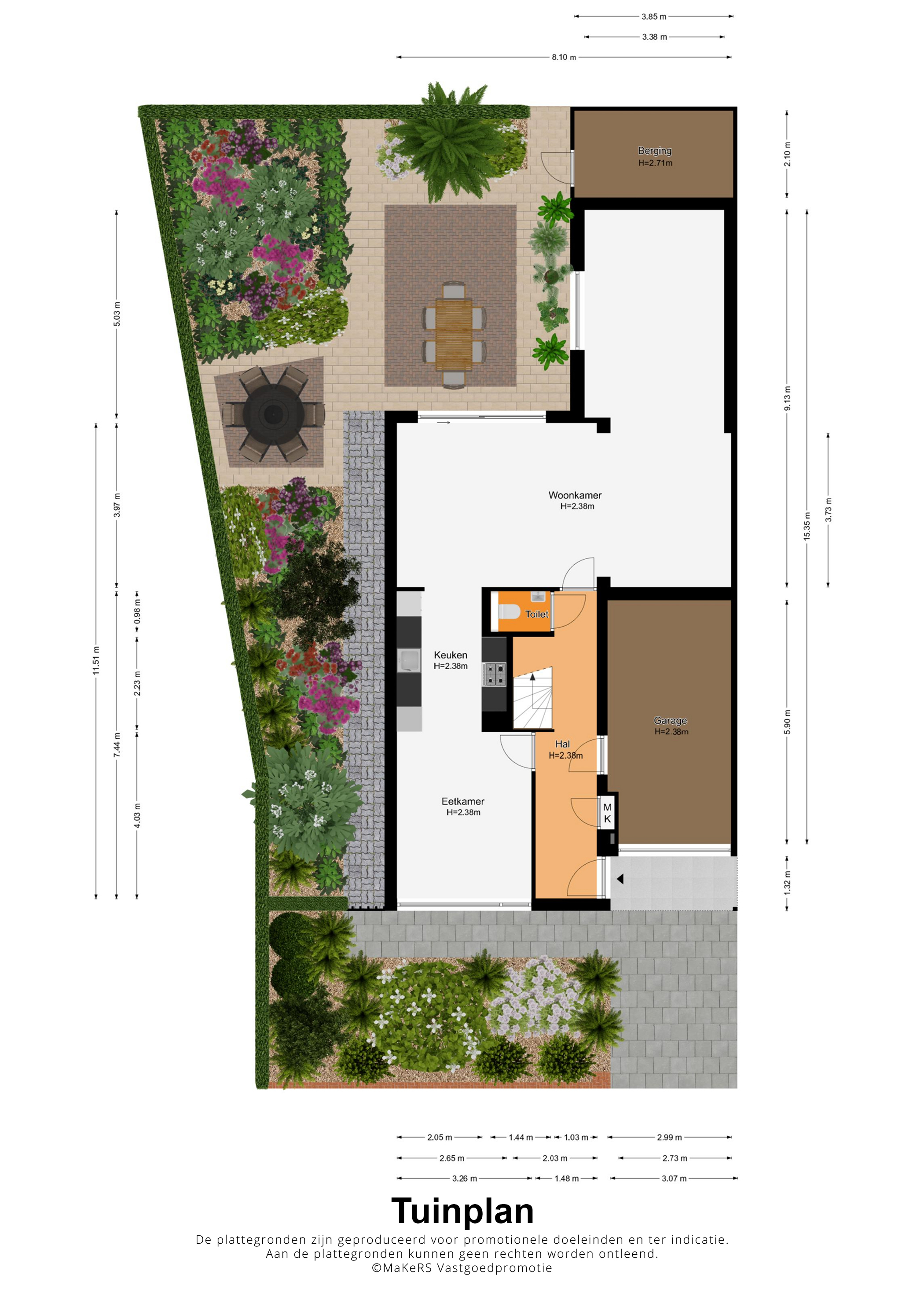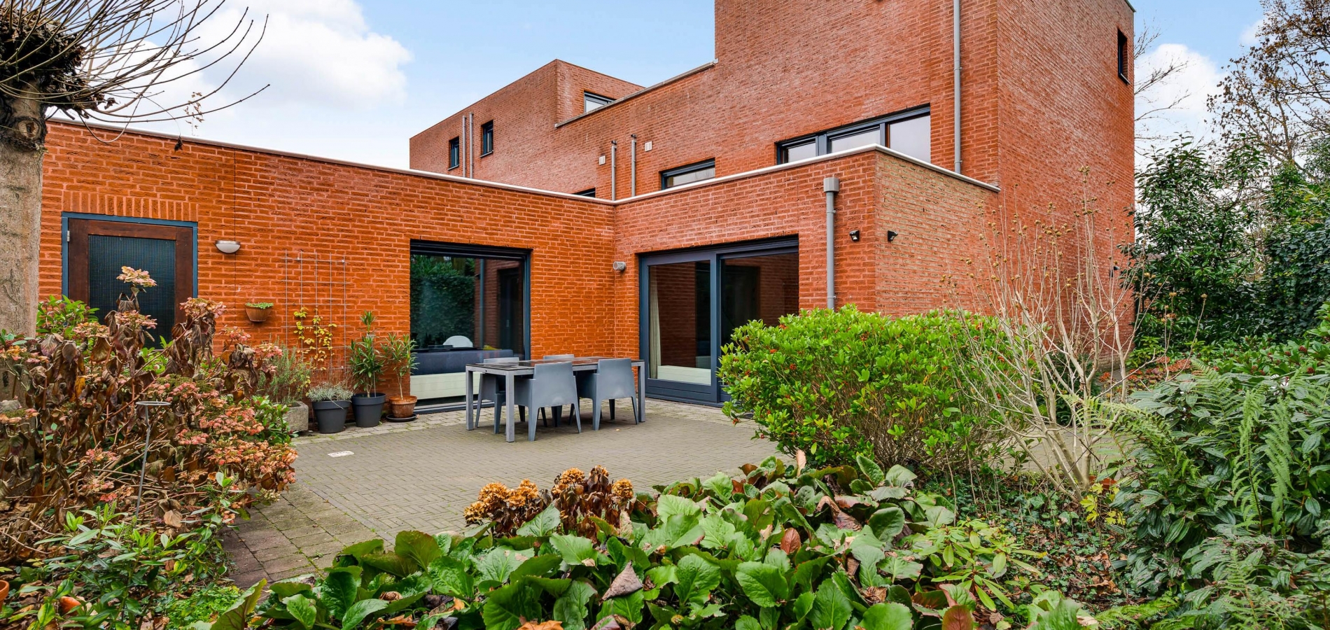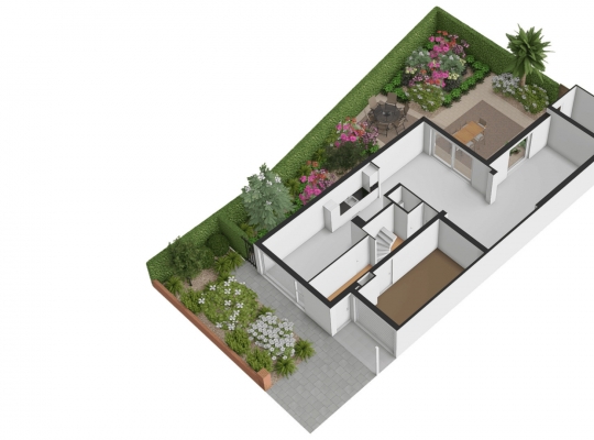 De achtertuin, gesitueerd op het westen, is ingericht met twee terrassen en veel groen. In het verlengde van de aanbouw is een (fietsen)berging van circa 3,85 x 2,10 meter, die ook geschikt is voor het tuingereedschap. Er is een eigen achterom, afgesloten met een poort, en vanuit de achtertuin is het binnenterrein met parkeergelegenheid (in mandelig eigendom) te bereiken. Ook in de voortuin ziet u veel groen, merendeels groenblijvend en onderhoudsvriendelijk.