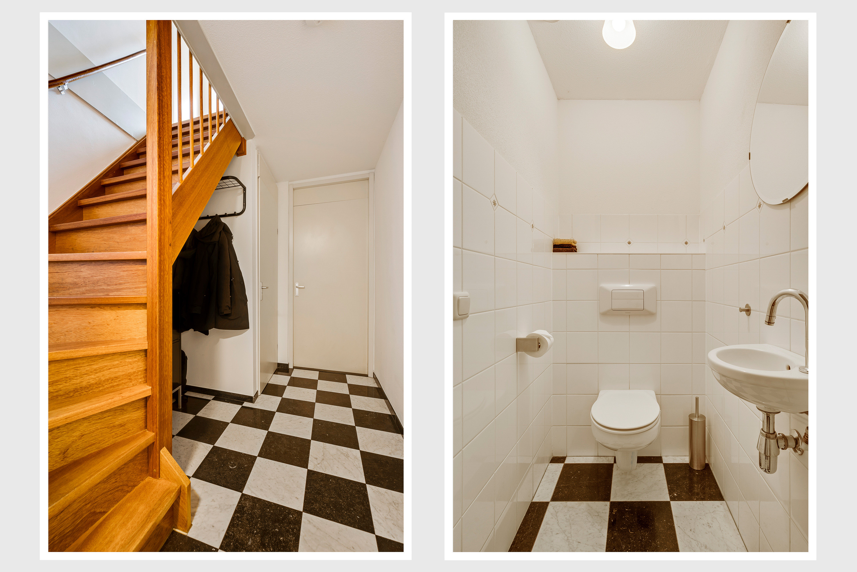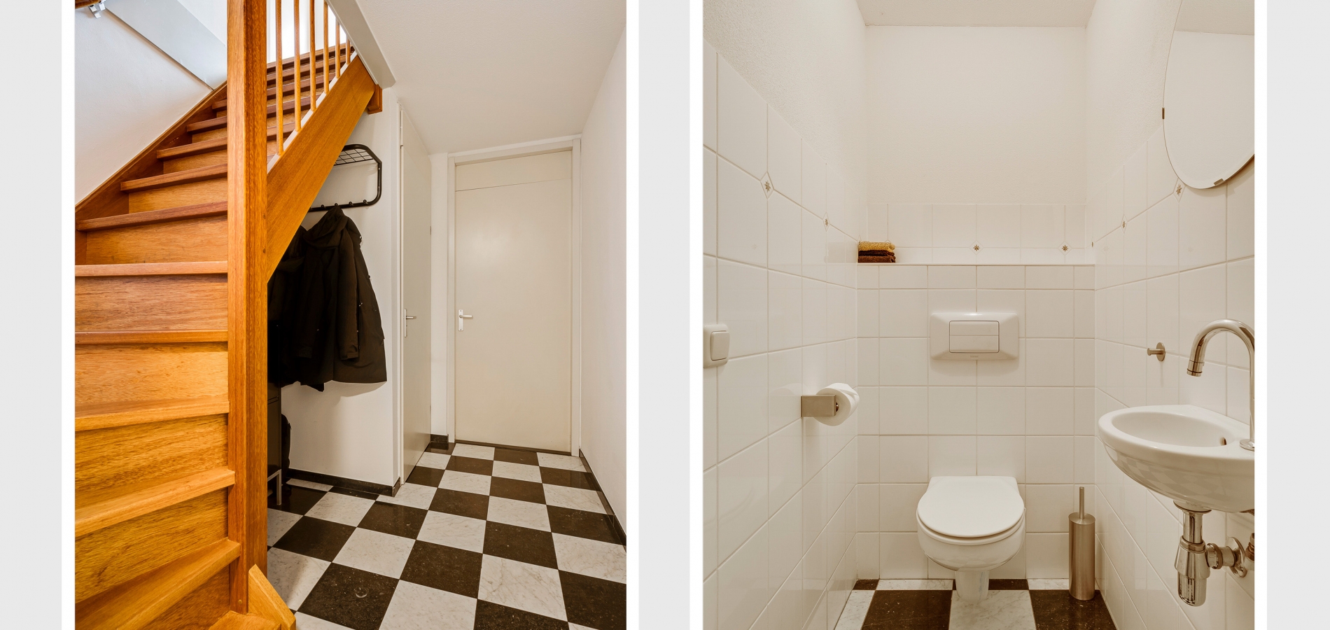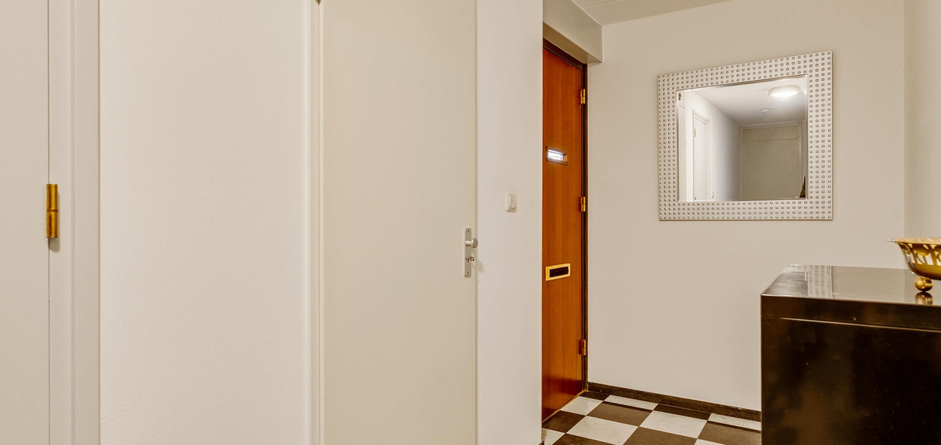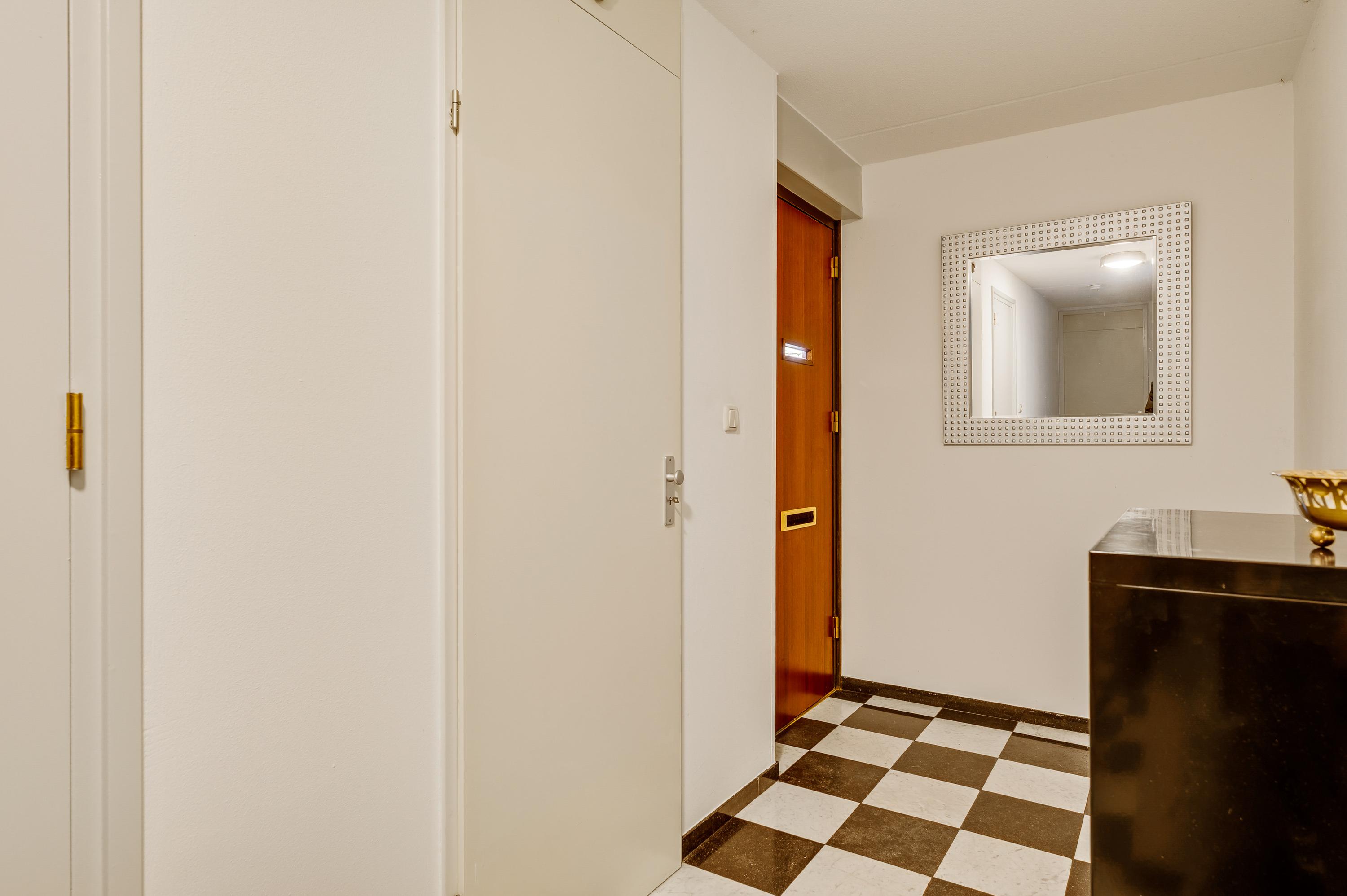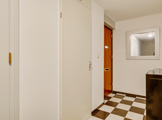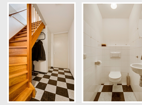 Niet alleen op het terrein aan de achterzijde, maar ook voor de garage is er de mogelijkheid om te parkeren. Hier is ook de overdekte entree, die toegang geeft tot de hal (circa 7,44 x 1,48). Hier zijn de meterkast, de trapopgang en de toiletruimte met fonteintje. Onder de trap is ruimte voor een kapstok, de tegelvloer is van marmer.