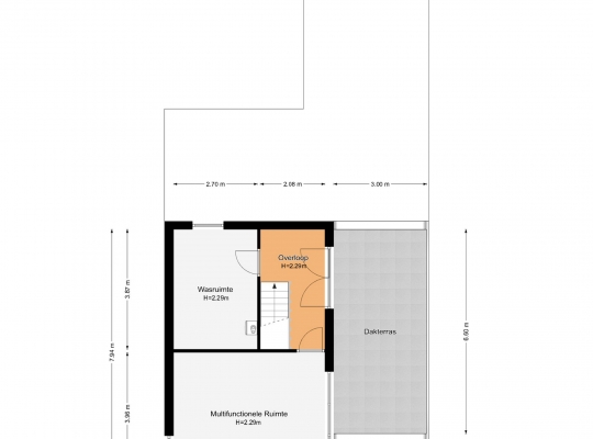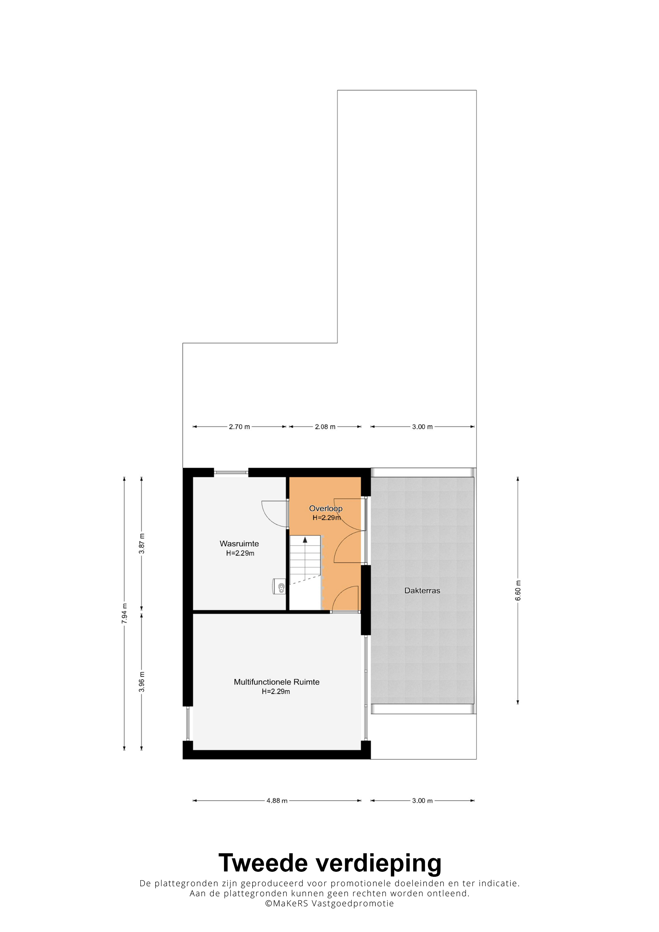 Er is een vaste trap naar de tweede verdieping waar een overloop, twee ruimtes en het dakterras (circa 6,60 x 3,00) zijn. De ruimte aan de achterzijde is in gebruik als wasruimte/berging (circa 3,87 x 2,70) en slaapkamer IV (circa 4,88 x 3,96) heeft lichtinval vanaf twee kanten.