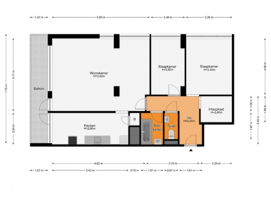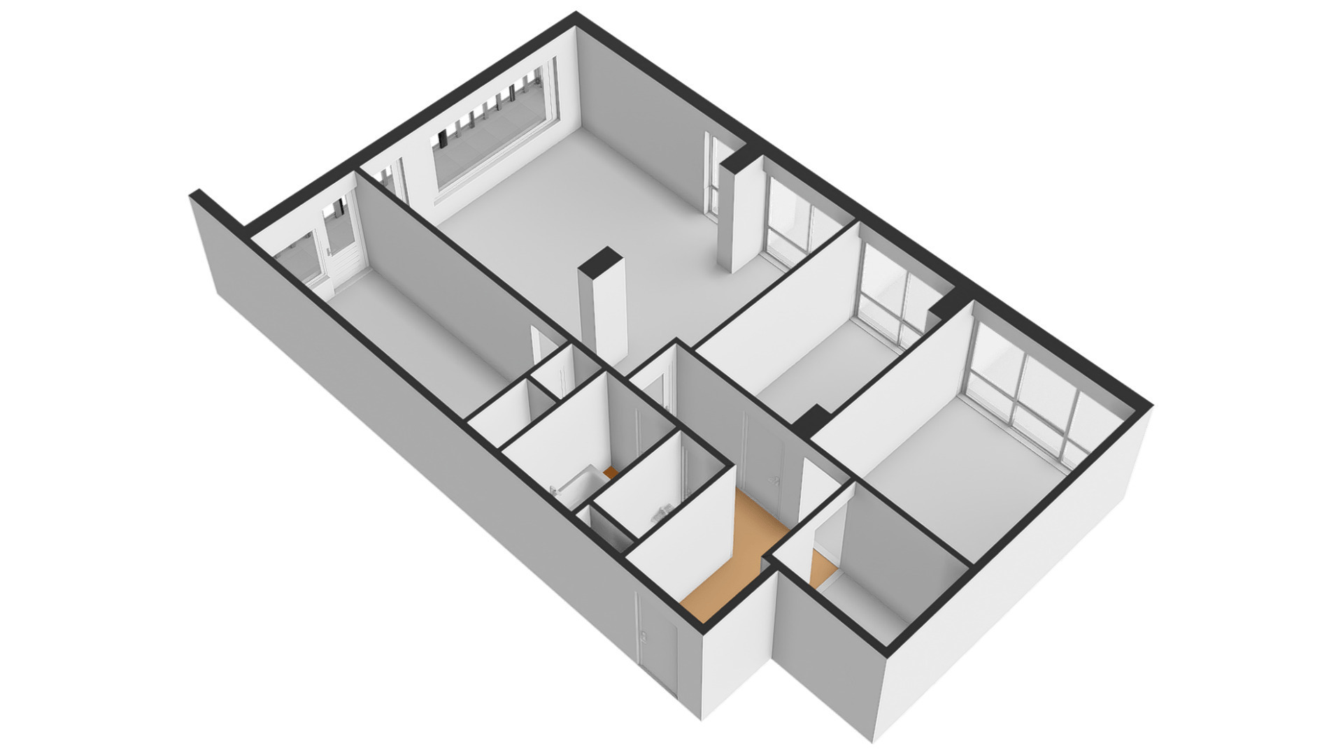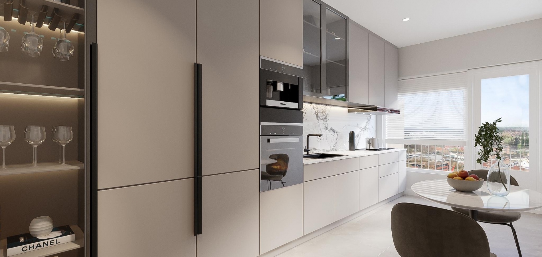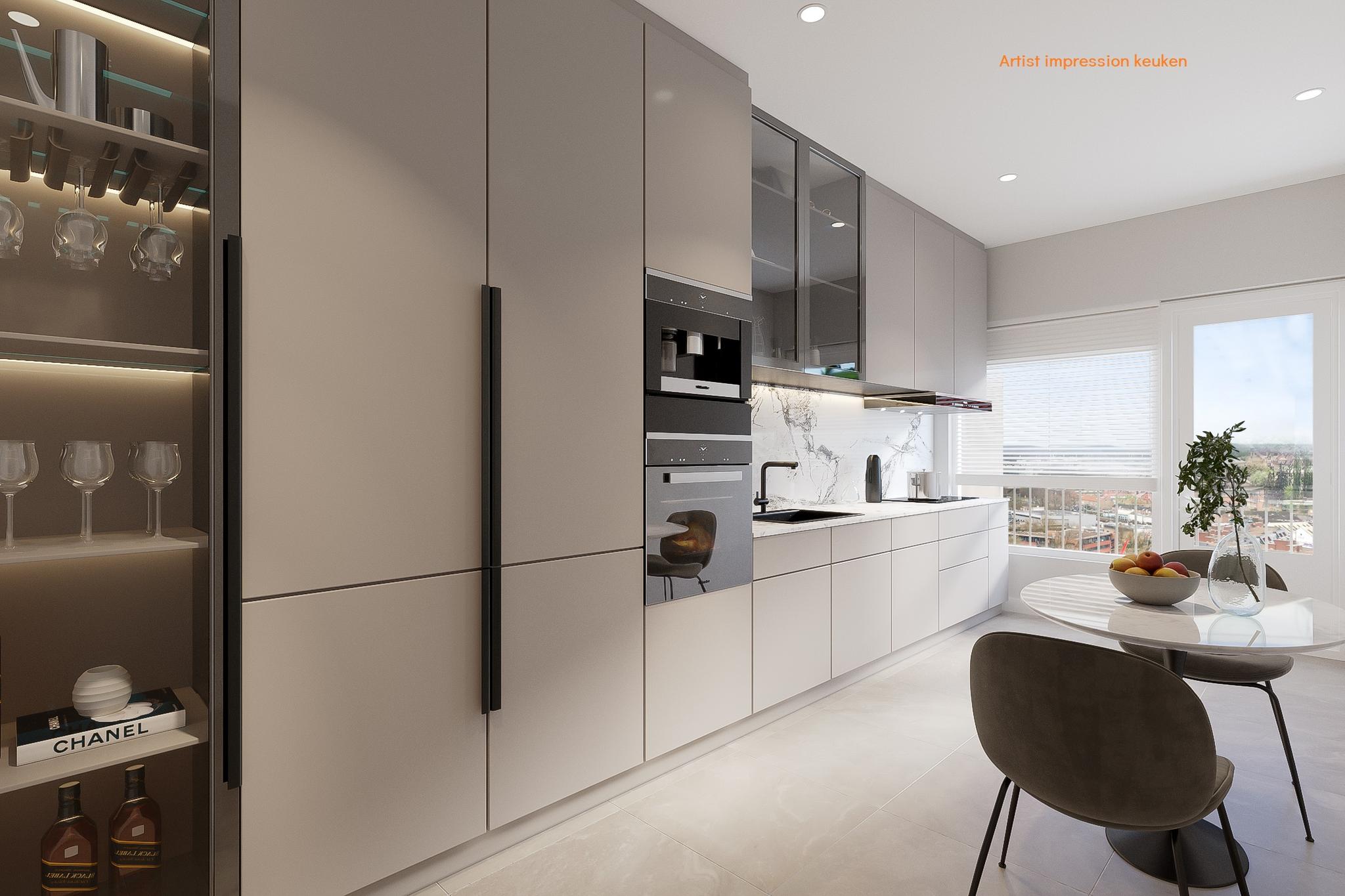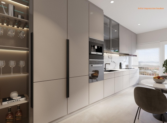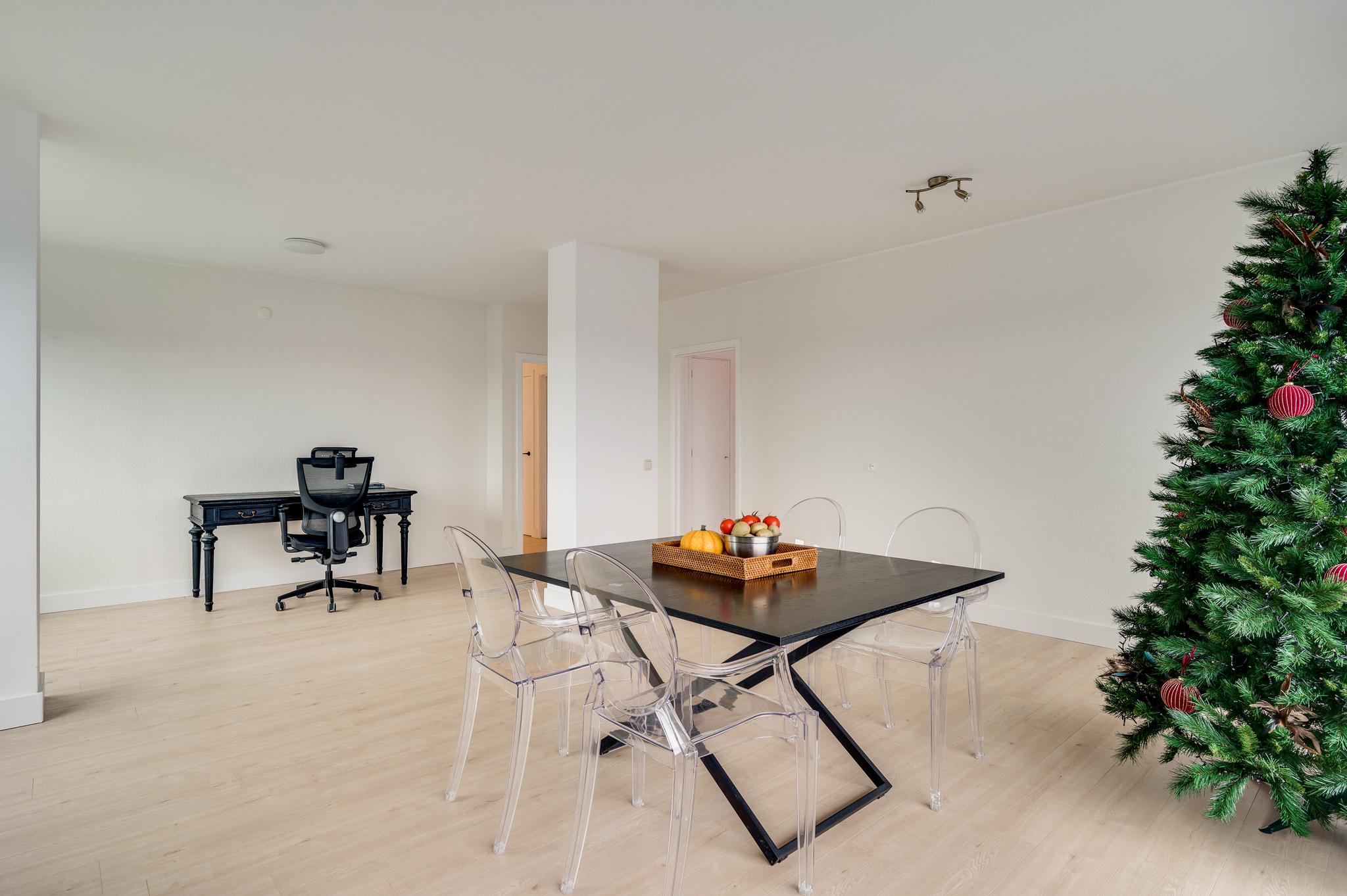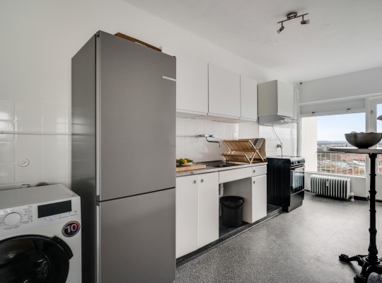 Aan het einde van de hal loopt u de woonkamer (circa 6,95 x 5,17), met grote ramen aan twee zijden en een deur naar het balkon. Geniet van de lichtinval en het fantastische uitzicht over Maastricht. Op de plek waar nu een bureau staat, kan een extra (slaap)kamer worden gerealiseerd. Naast de woonkamer is de dichte keuken (circa 5,43 x 2,24), waar de originele keukenopstelling met spoelbak staat.