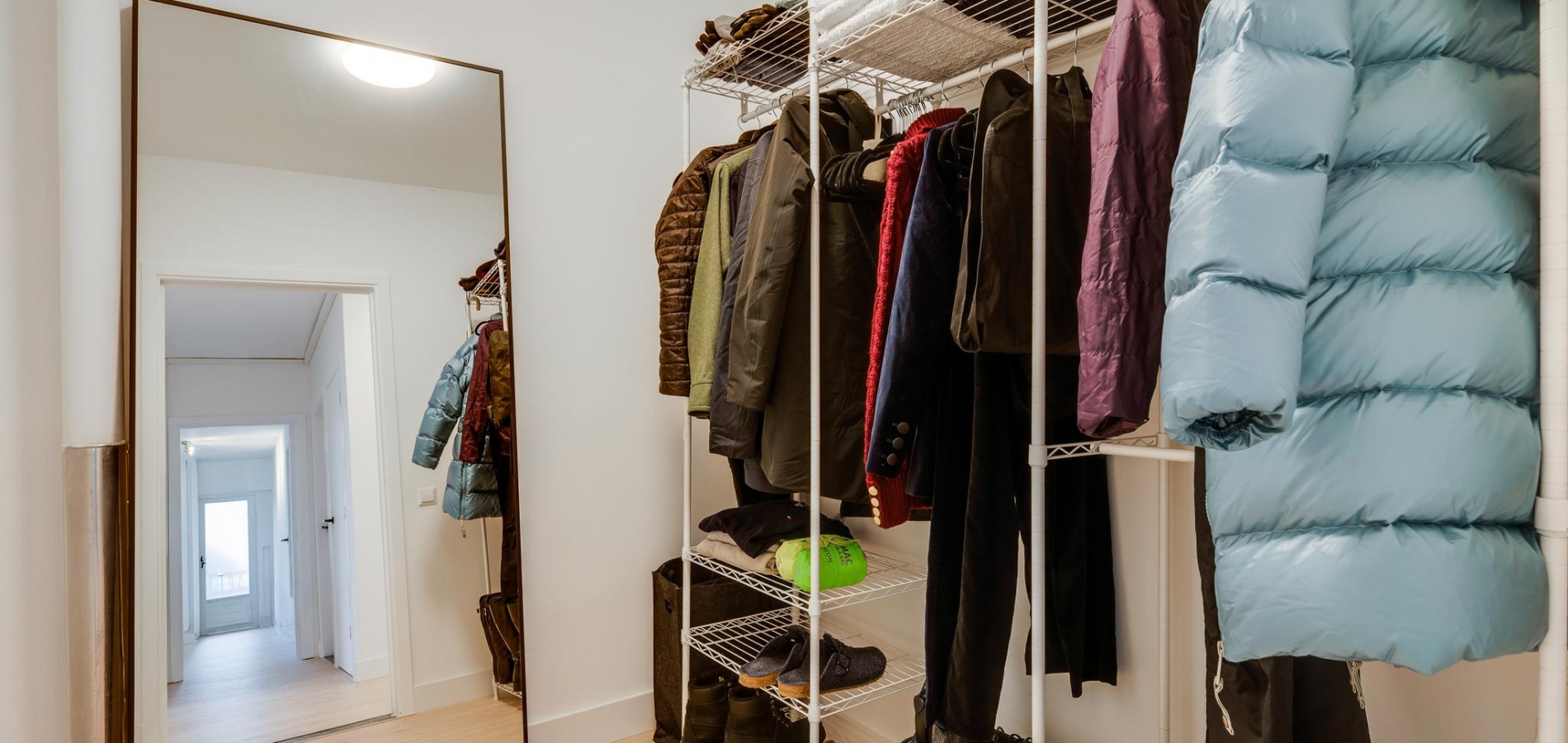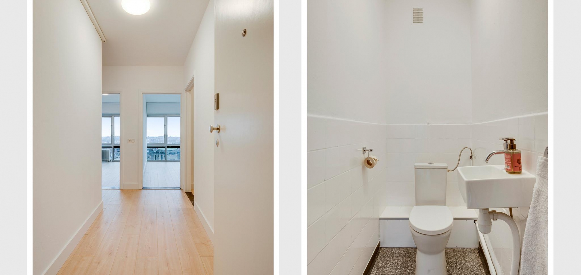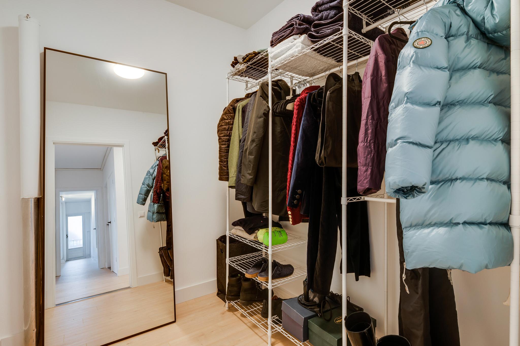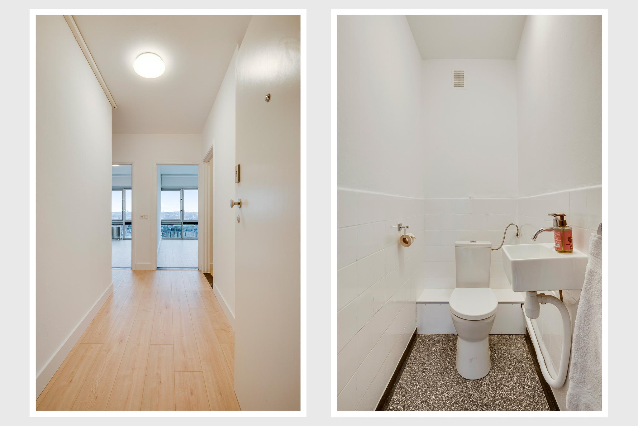 Vlak naast de lift is de voordeur van dit lichte hoekappartement. In de L-vormige hal ligt, net als in bijna het hele appartement, laminaat op de vloer. Aan de linkerzijde zijn de toiletruimte met fonteintje en de badkamer (circa 2,24 x 1,57), ingedeeld met een ligbad/douche en een wastafel. Voor de jassen en andere spullen is er een aparte ruimte (circa 1,86 x 2,23), die ook als werk-/studeerplek of hobbyruimte gebruikt kan worden.