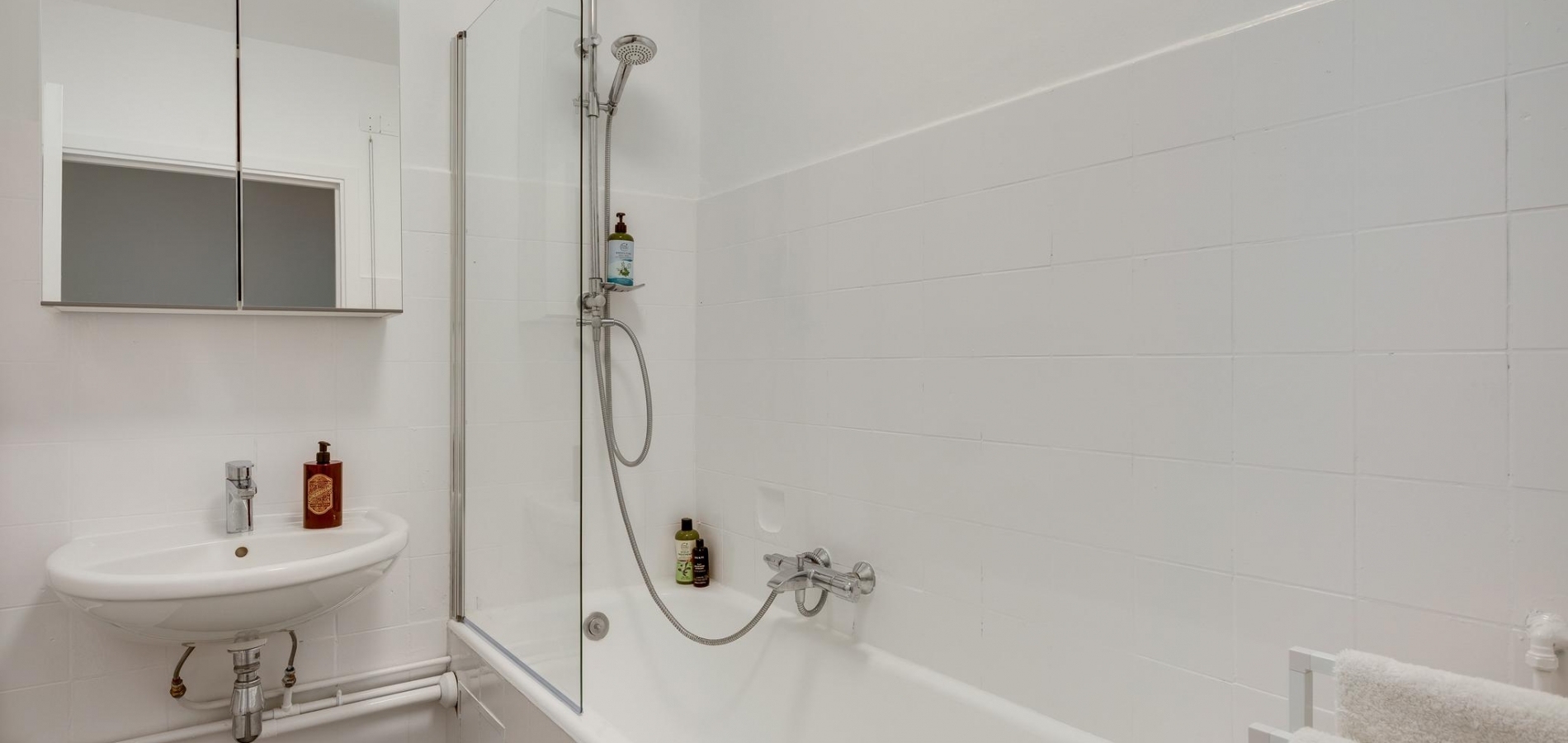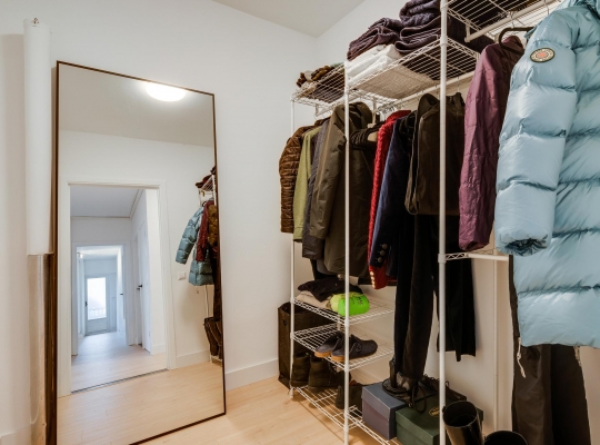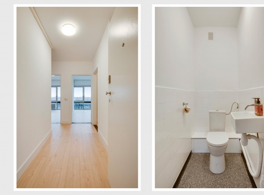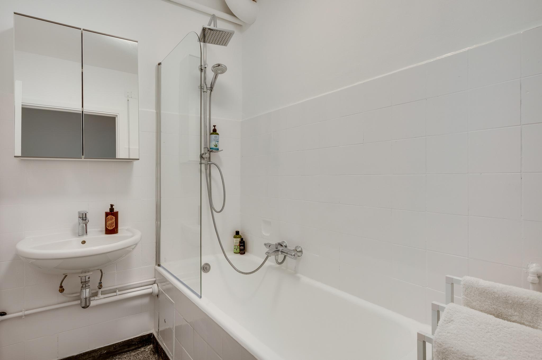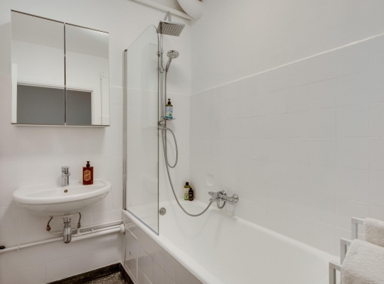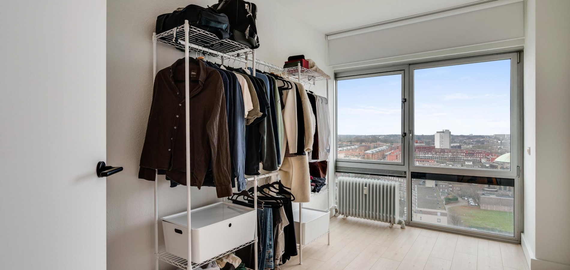 Vlak naast de lift is de voordeur van dit lichte hoekappartement. In de L-vormige hal ligt, net als in bijna het hele appartement, laminaat op de vloer. Aan de linkerzijde zijn de toiletruimte met fonteintje en de badkamer (circa 2,24 x 1,57), ingedeeld met een ligbad/douche en een wastafel. Voor de jassen en andere spullen is er een aparte ruimte (circa 1,86 x 2,23), die ook als werk-/studeerplek of hobbyruimte gebruikt kan worden.