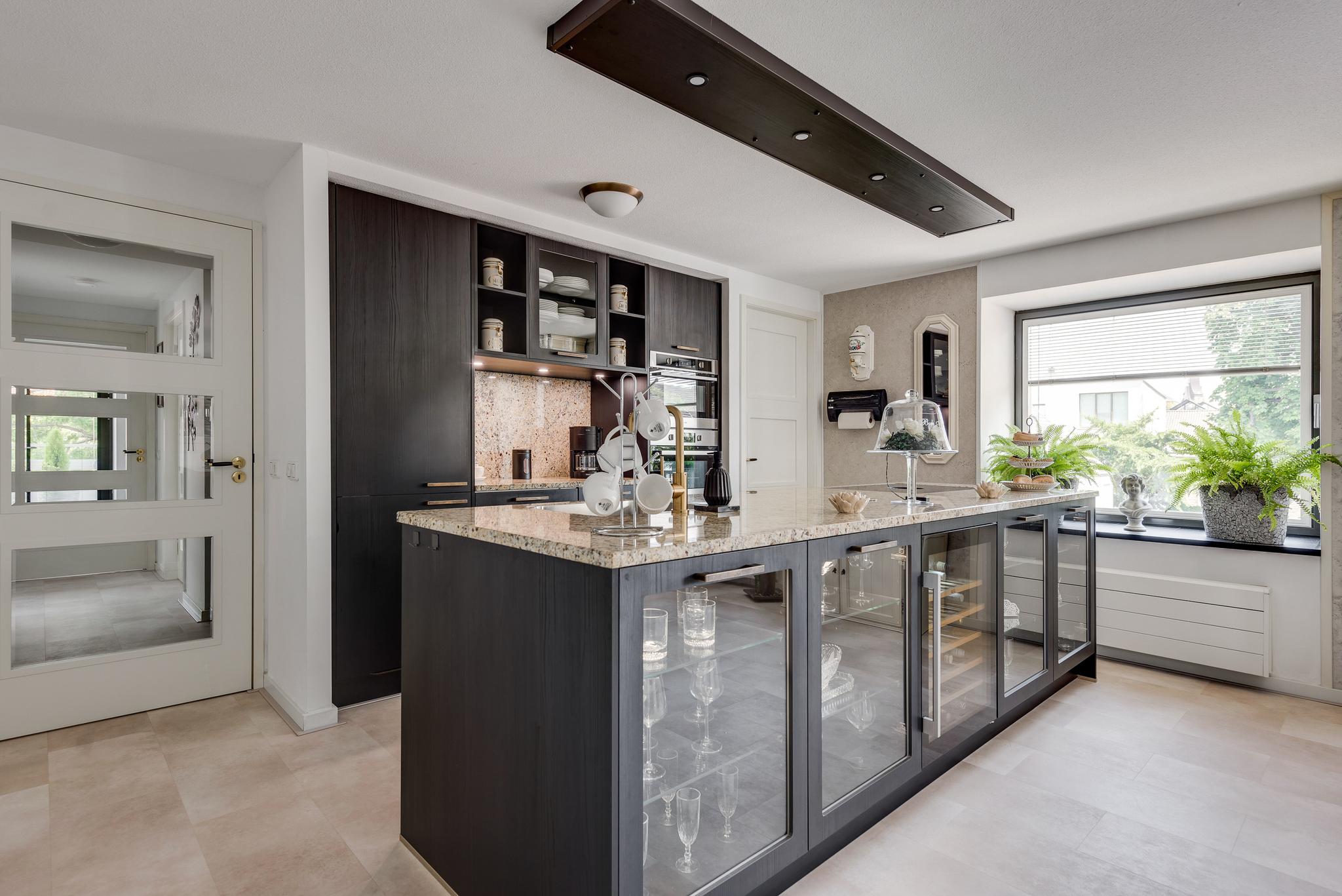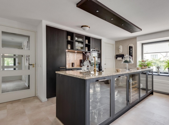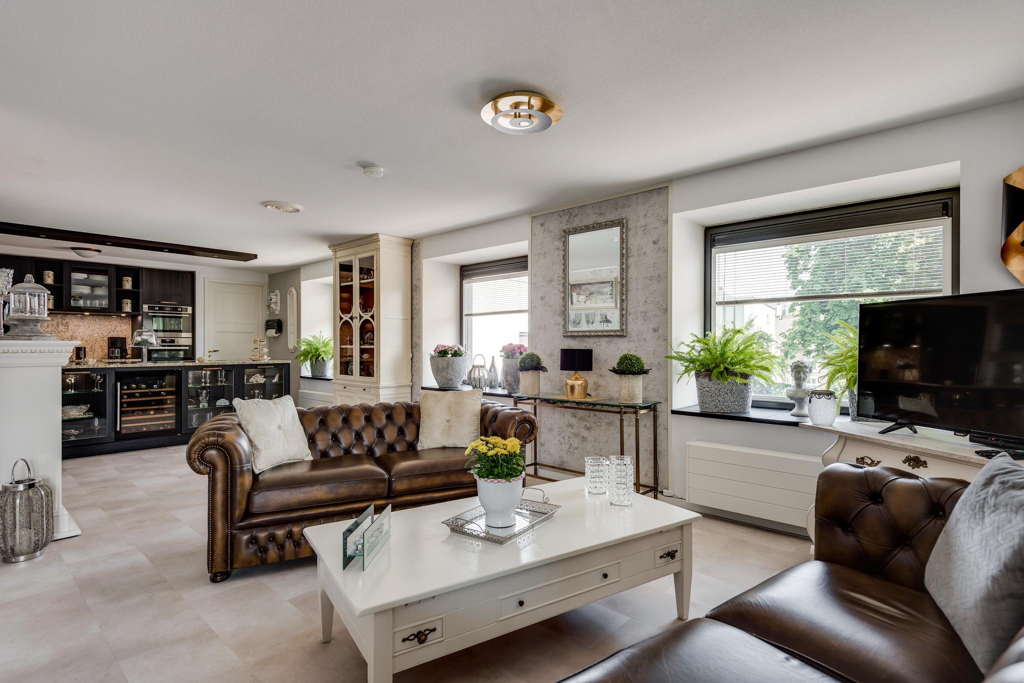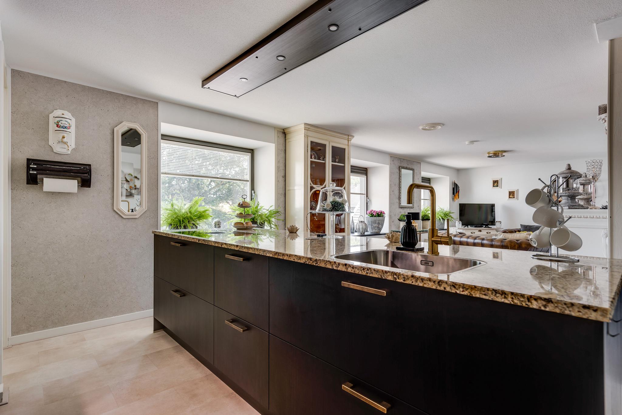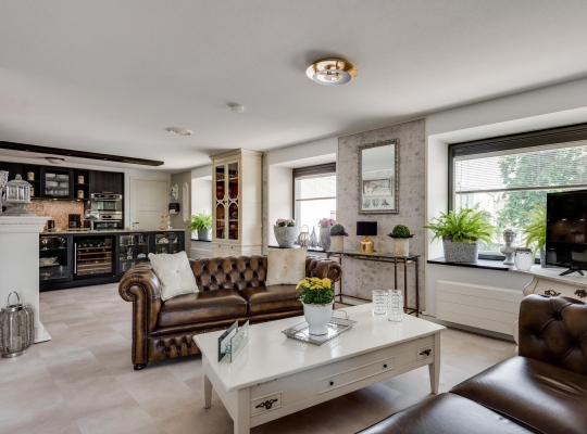 De woonkamer met open keuken (circa 53 m2) heeft lichtinval aan twee zijden en openslaande deuren naar het balkon. In de keuken staan een stijlvol, op maat gemaakt kook-/spoeleiland met servieskasten en een ingebouwde kastenwand. De achterwand en werkbladen zijn van graniet en alle apparatuur is van topkwaliteit. Zo ziet u een Bora inductie kookplaat met afzuiging en een AEG wijnkoelkast. In de bijkeuken (circa 4 m2) is, op een verhoging, de opstelling van de wasapparatuur en ruimte voor een vriezer.