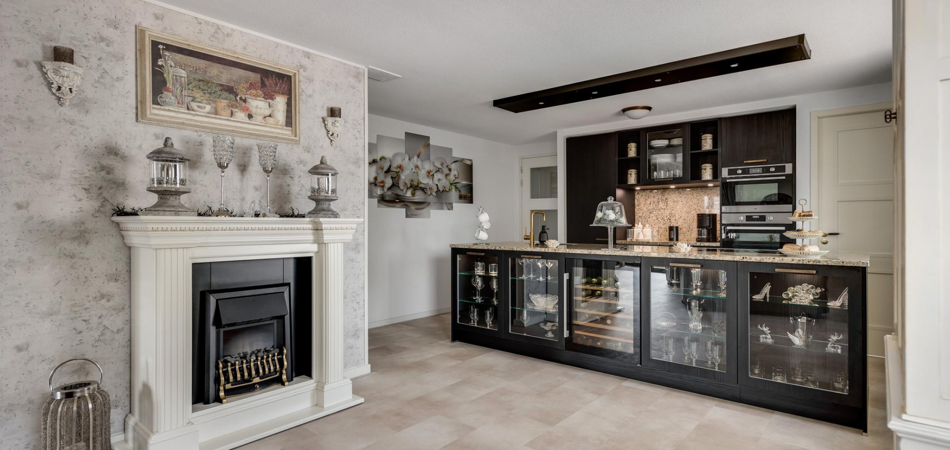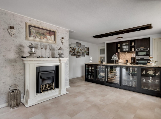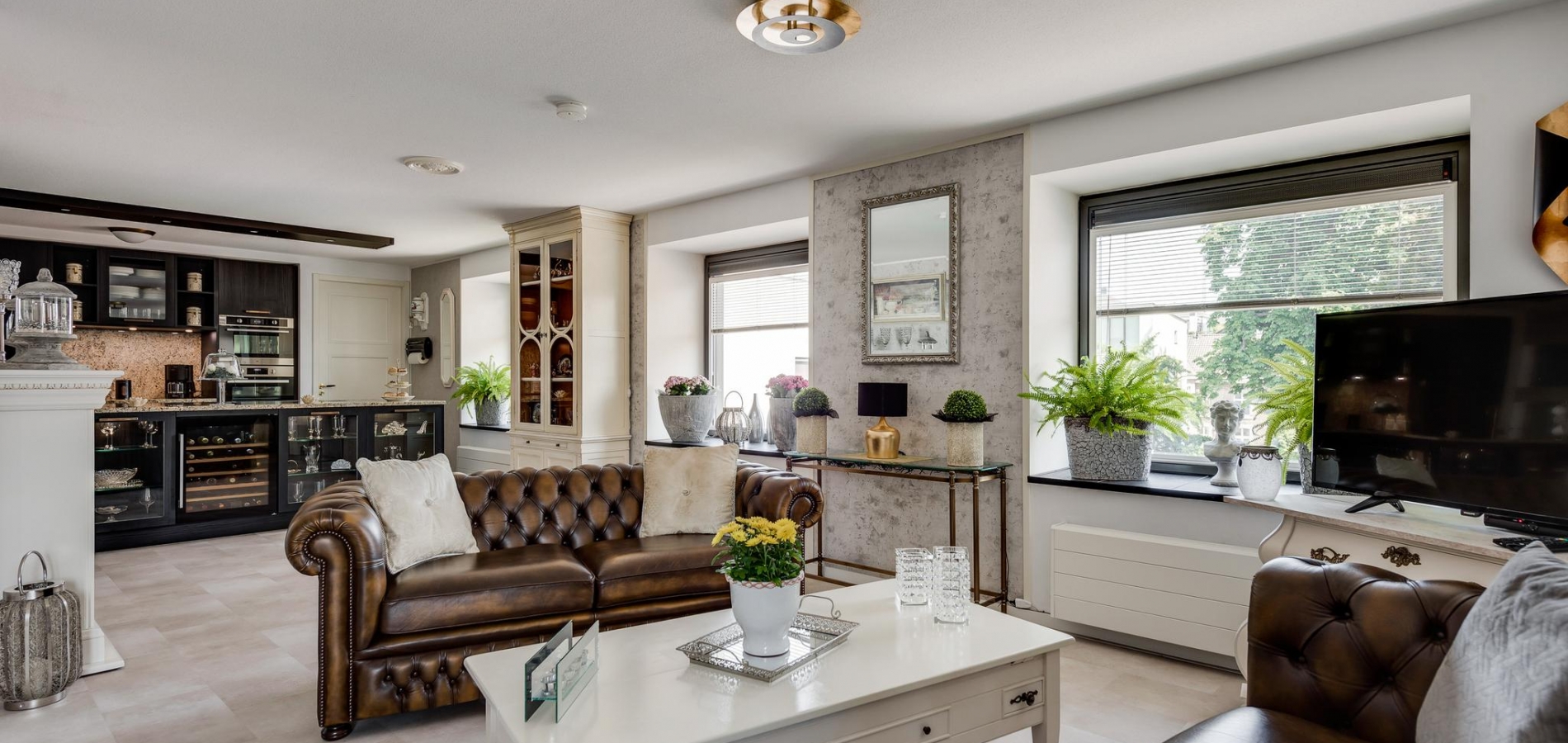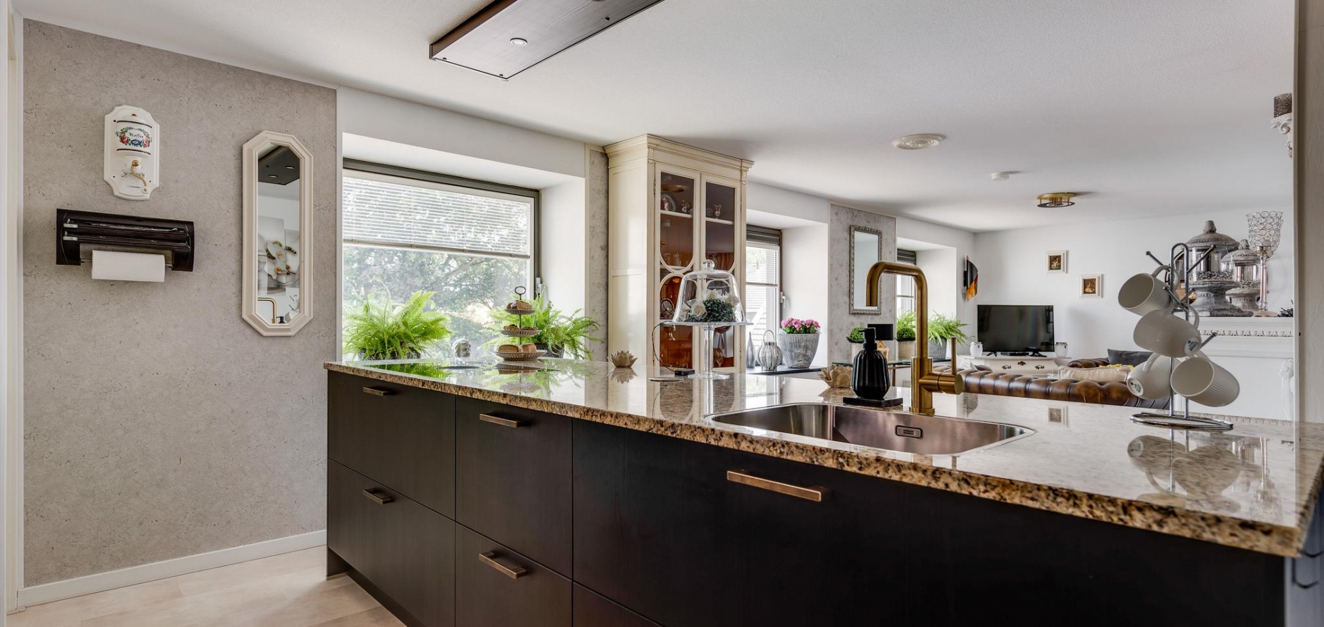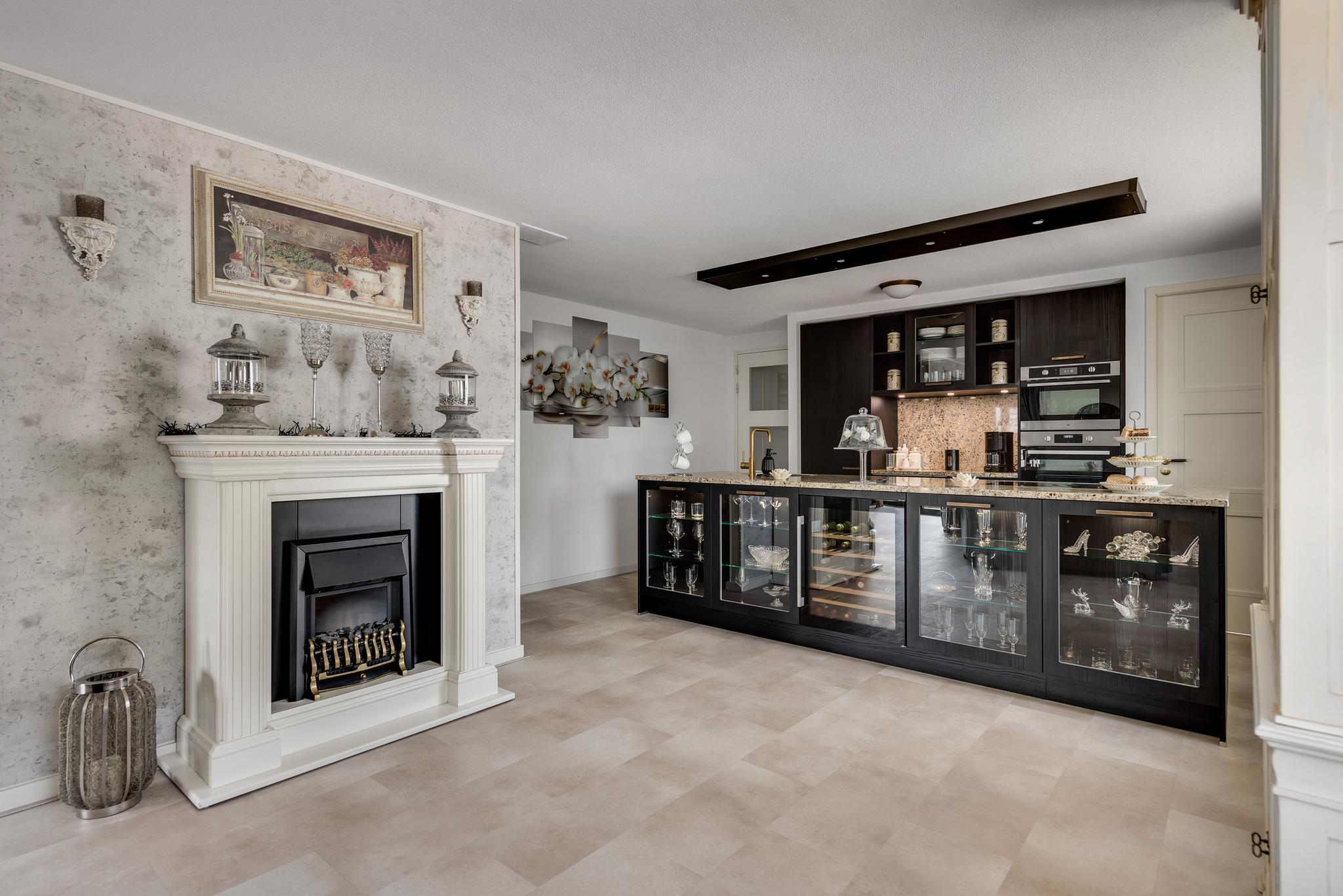 De woonkamer met open keuken (circa 53 m2) heeft lichtinval aan twee zijden en openslaande deuren naar het balkon. In de keuken staan een stijlvol, op maat gemaakt kook-/spoeleiland met servieskasten en een ingebouwde kastenwand. De achterwand en werkbladen zijn van graniet en alle apparatuur is van topkwaliteit. Zo ziet u een Bora inductie kookplaat met afzuiging en een AEG wijnkoelkast. In de bijkeuken (circa 4 m2) is, op een verhoging, de opstelling van de wasapparatuur en ruimte voor een vriezer.