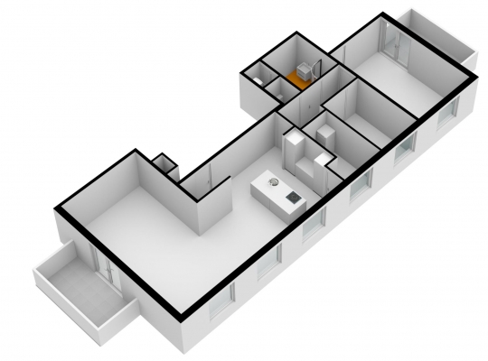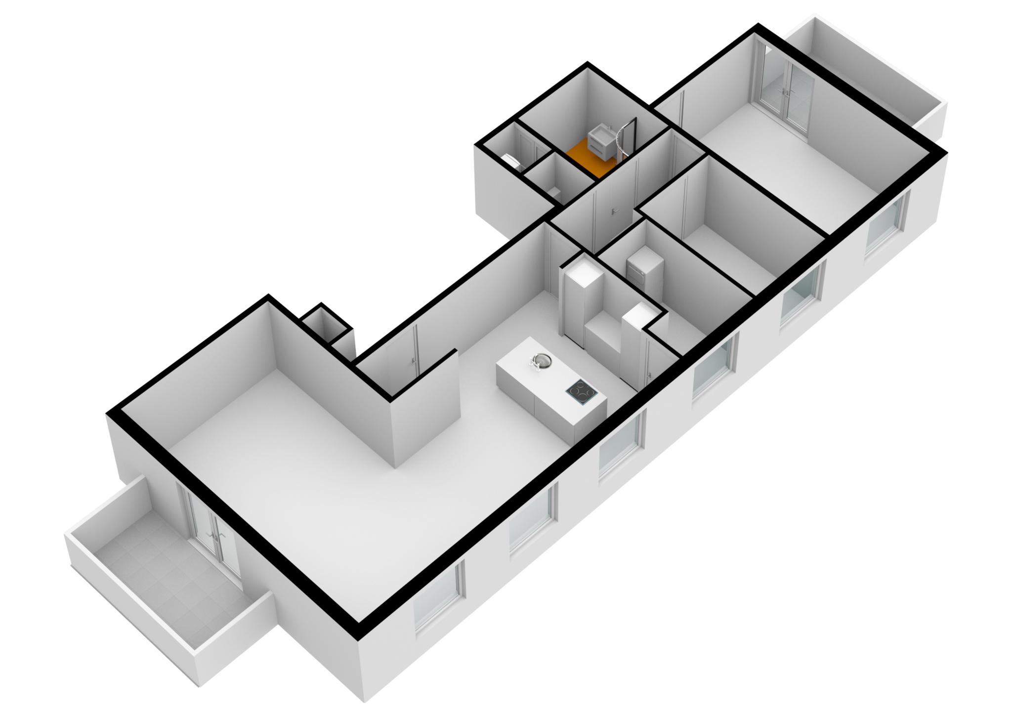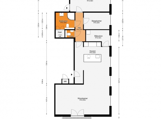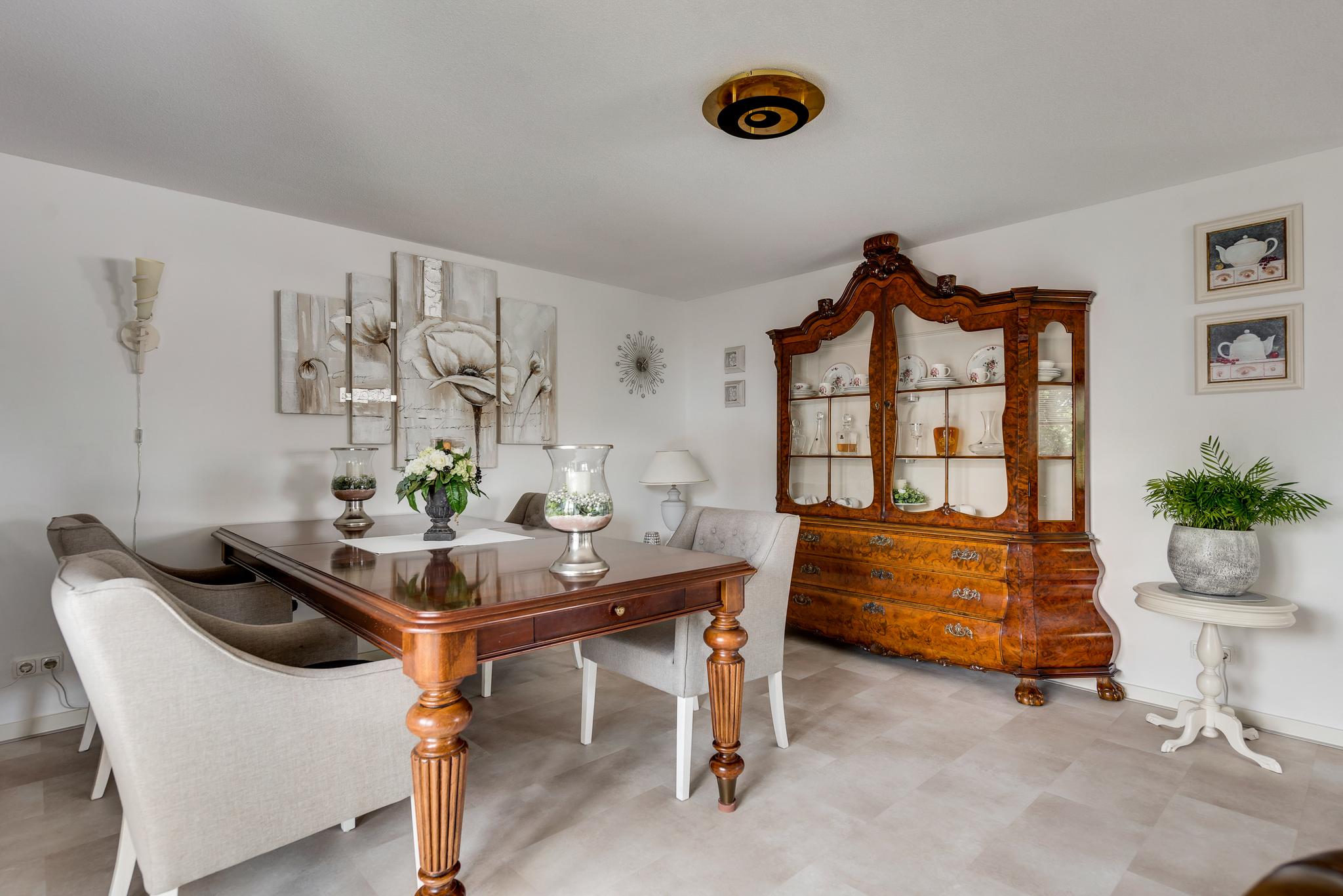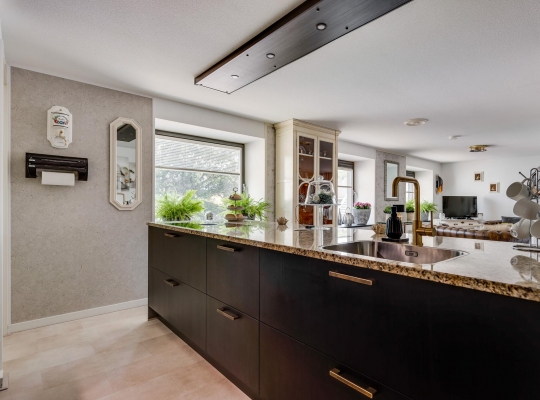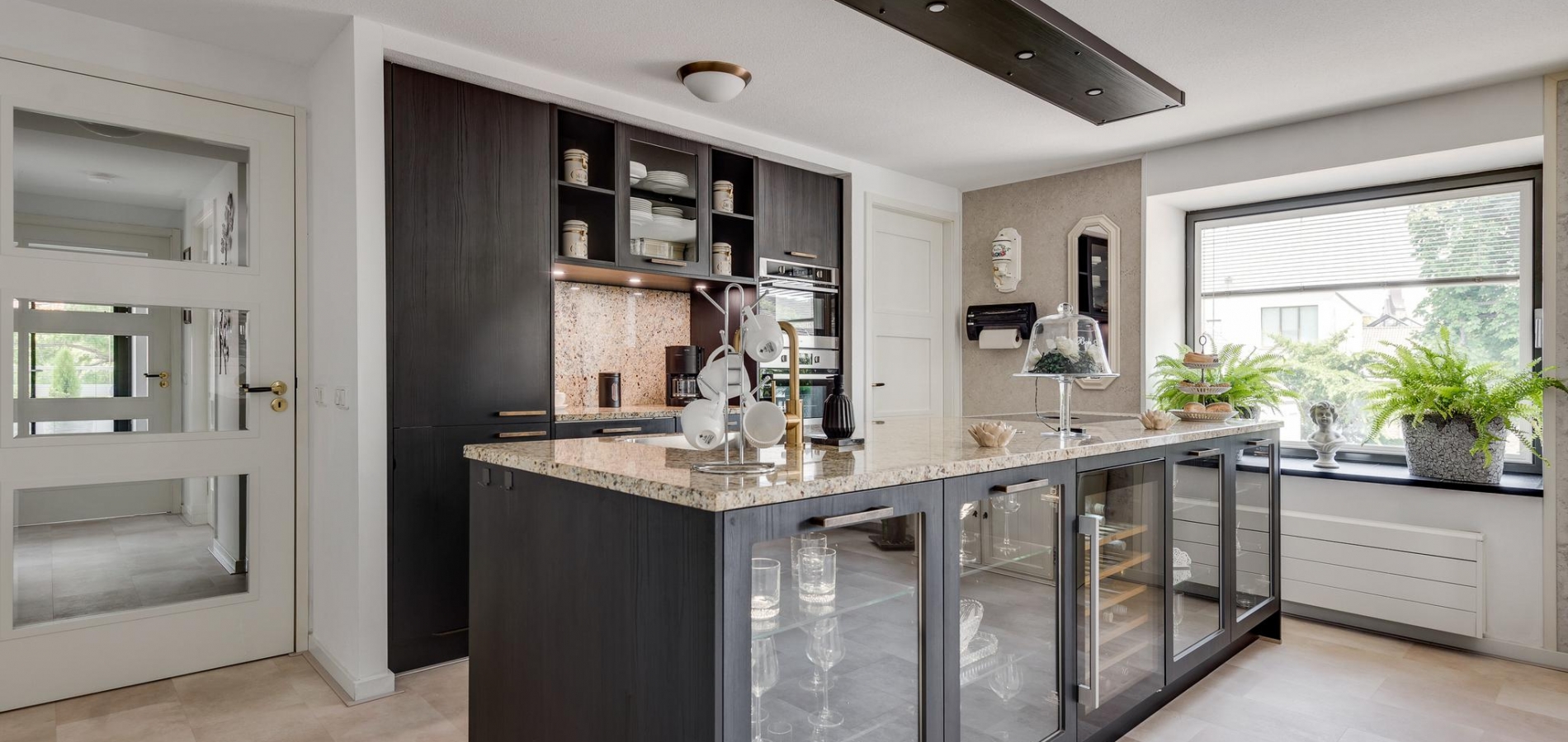 De woonkamer met open keuken (circa 53 m2) heeft lichtinval aan twee zijden en openslaande deuren naar het balkon. In de keuken staan een stijlvol, op maat gemaakt kook-/spoeleiland met servieskasten en een ingebouwde kastenwand. De achterwand en werkbladen zijn van graniet en alle apparatuur is van topkwaliteit. Zo ziet u een Bora inductie kookplaat met afzuiging en een AEG wijnkoelkast. In de bijkeuken (circa 4 m2) is, op een verhoging, de opstelling van de wasapparatuur en ruimte voor een vriezer.