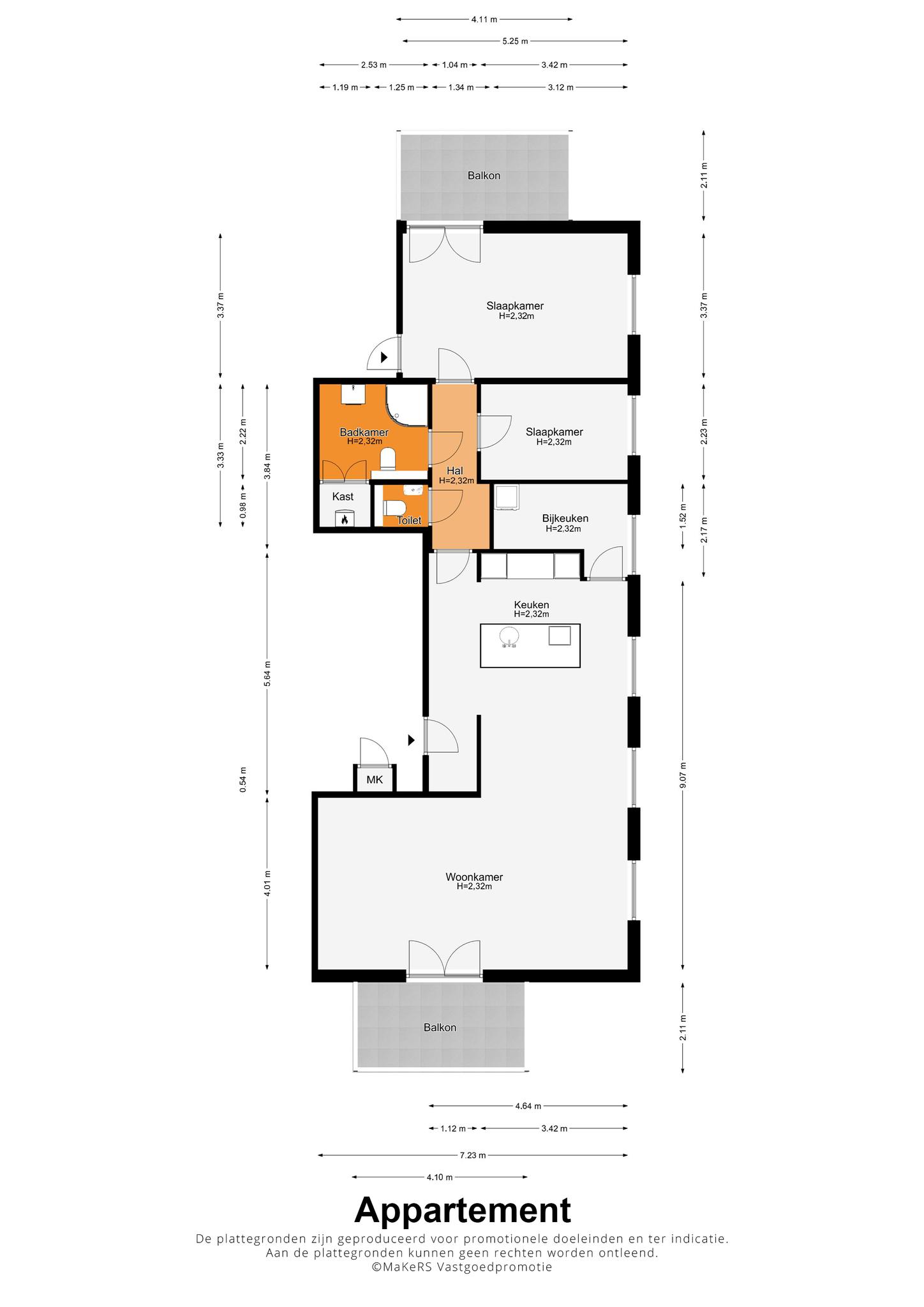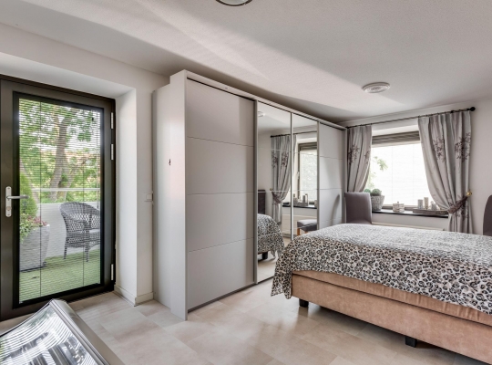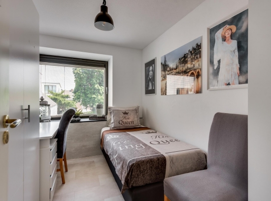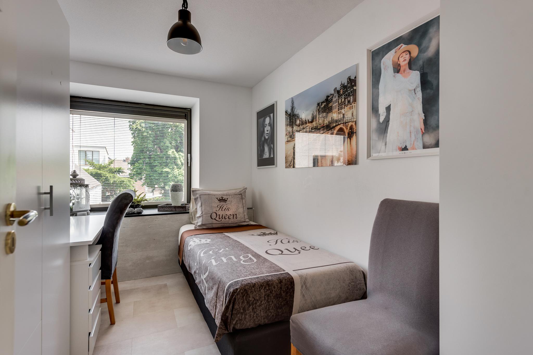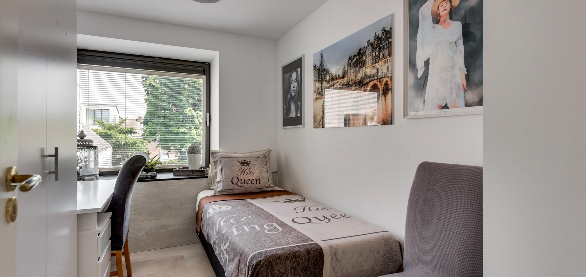 Vanuit de keuken loopt u naar een tweede hal waaraan de slaapkamers, badkamer en separate toiletruimte grenzen. Slaapkamer I (5,25 x 3,37) grenst aan het tweede balkon en slaapkamer II (3,42 x 2,23) is ook als werkkamer/hobbyruimte te gebruiken. Beide slaapkamers zijn heel sfeervol en uitstekend afgewerkt, waardoor u niet hoeft te verbouwen.