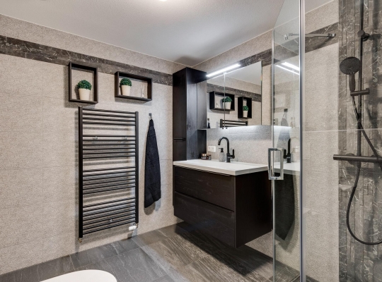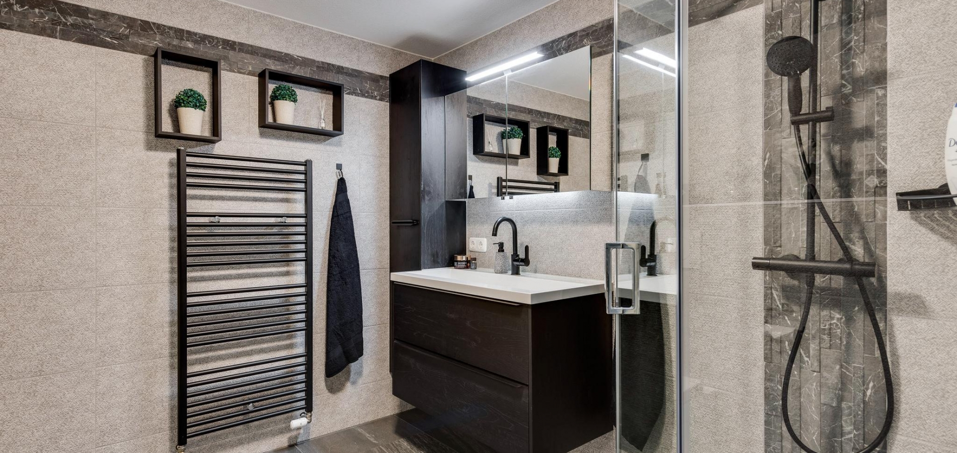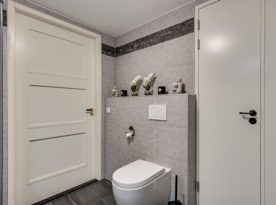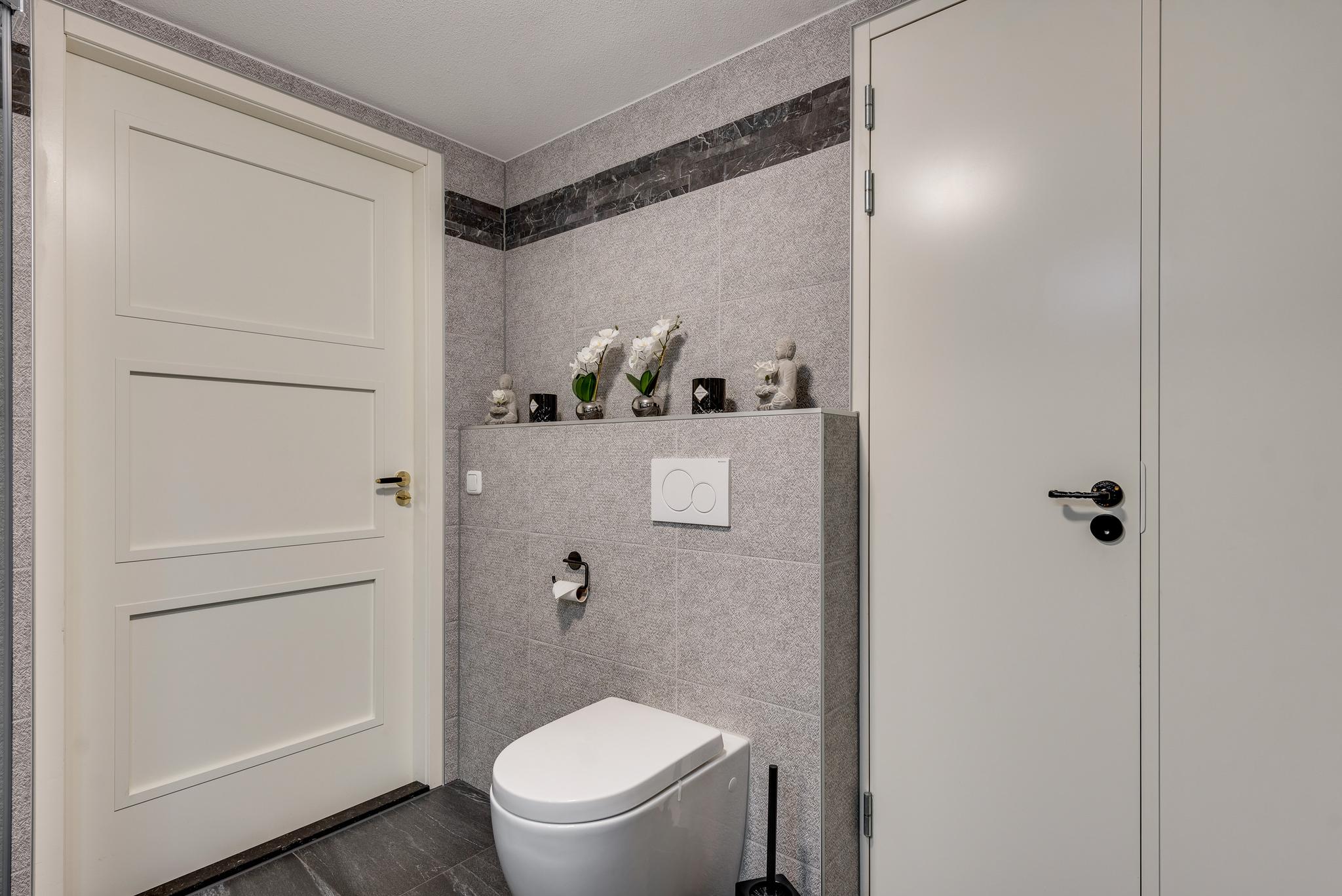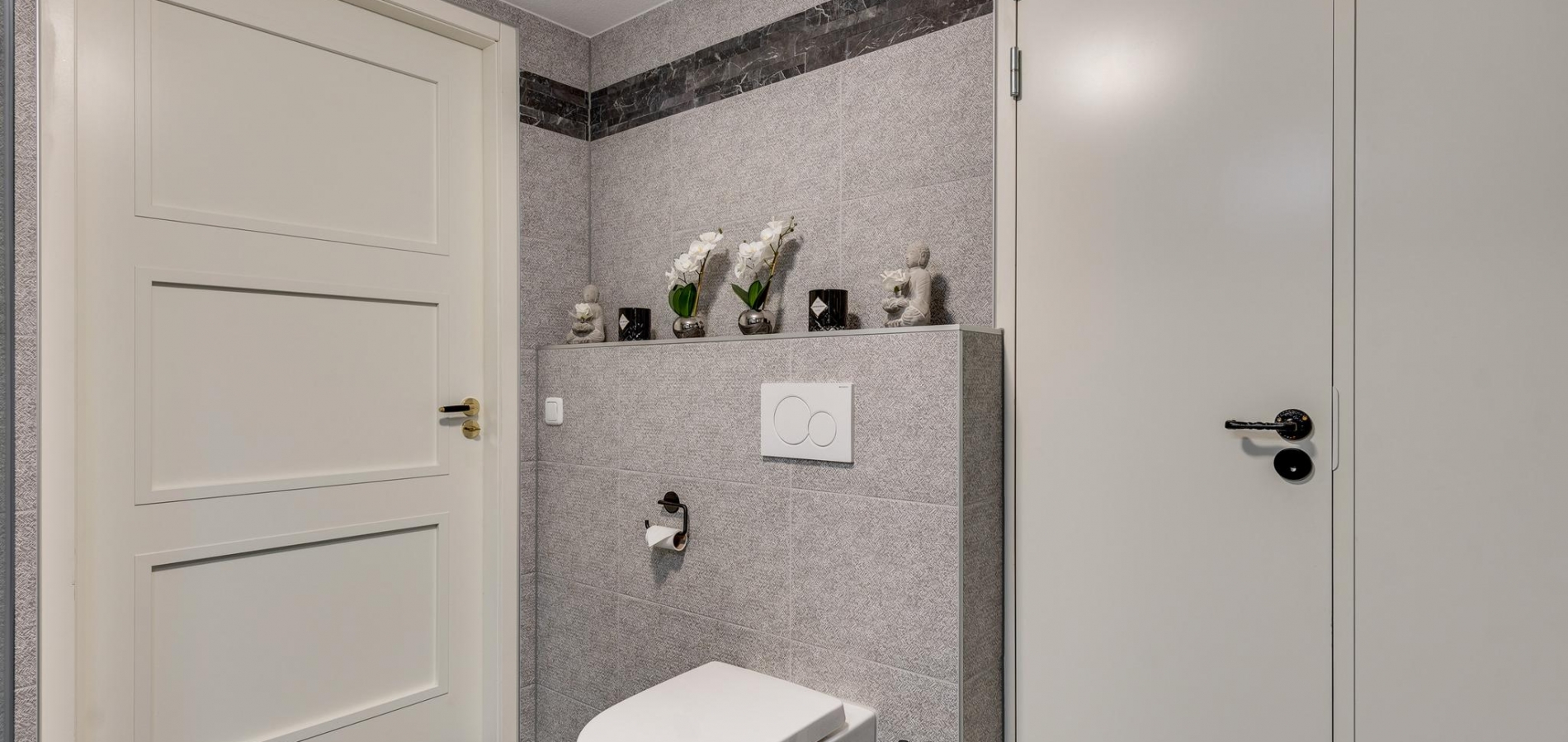 Aan de overzijde van de hal zijn de badkamer en toiletruimte gesitueerd. De luxe badkamer (2,53 x 2,22) is, net als de keuken en toiletruimte, in 2021 vernieuwd. Aan de rechterzijde zijn de inloopdouche en een stijlvol wastafelmeubel geplaatst. Naast het toilet ziet u dubbele deuren die toegang geven tot de cv-ruimte.