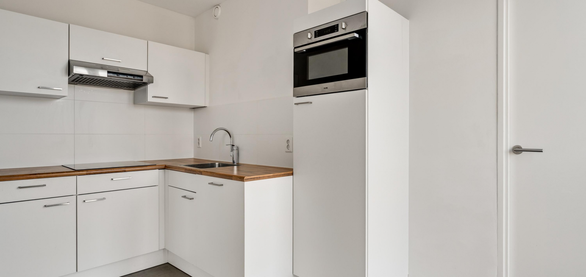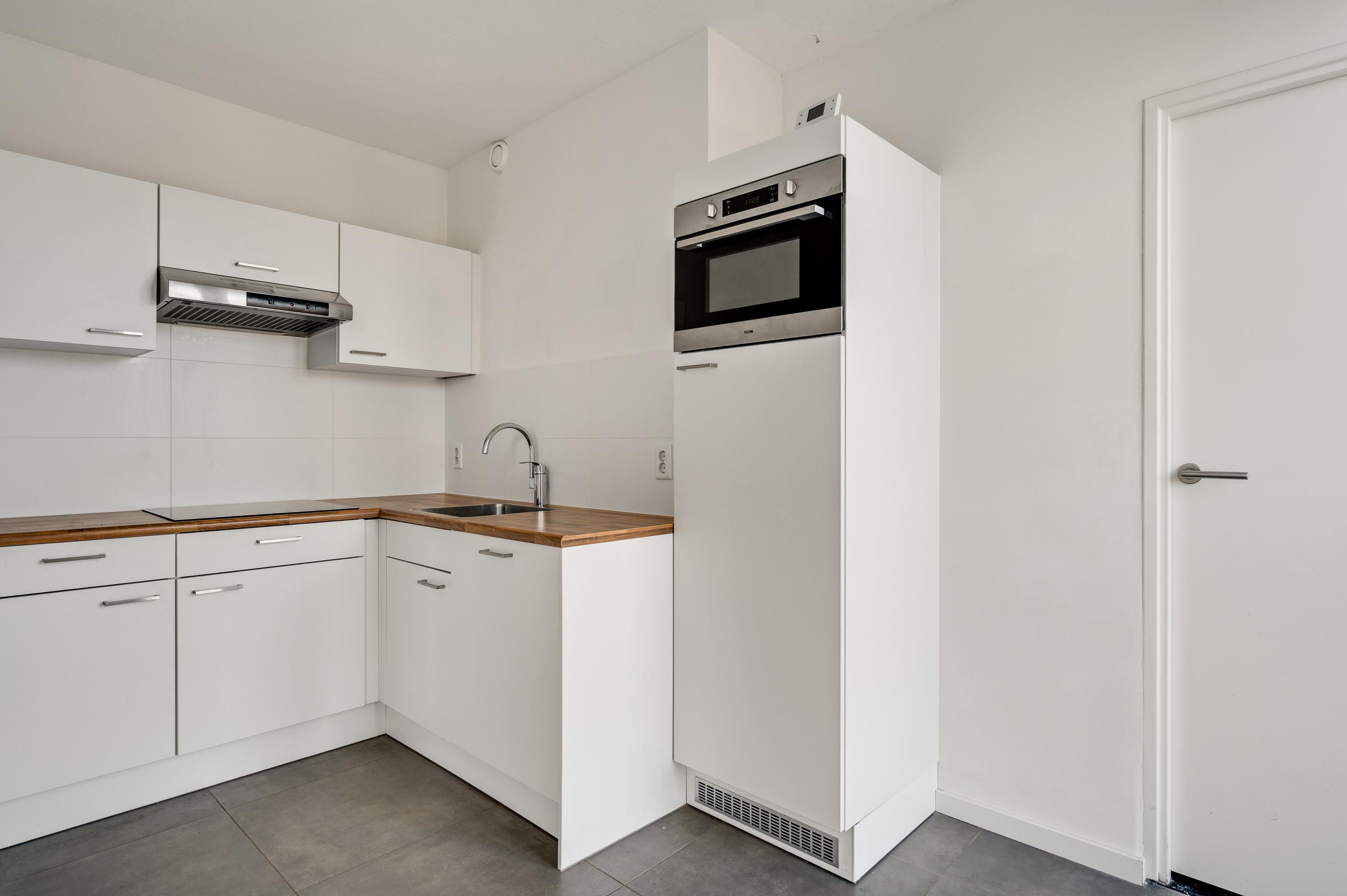 In de keuken (circa 3,71 x 2,12/1.72) staat een lichte hoekopstelling met een ingebouwde inductie kookplaat, afzuigkap, vaatwasser, koelkast en een combimagnetron. Het houtlook aanrechtblad past goed in het geheel, net als de grijze tegelvloer. Naast de keuken is een bijkeuken (circa 1,53 x 1,94/1,77). Hier staat de warmtepomp (Mitsubishi Ecodan, 2020, eigendom) en is plek voor de wasapparatuur.