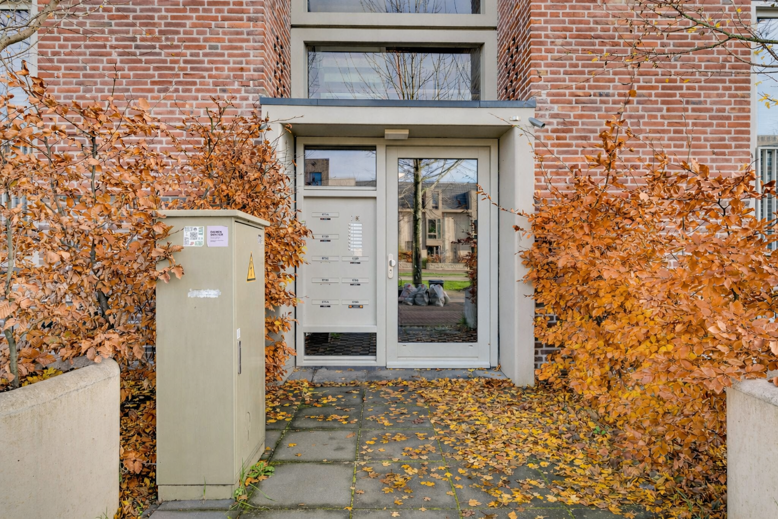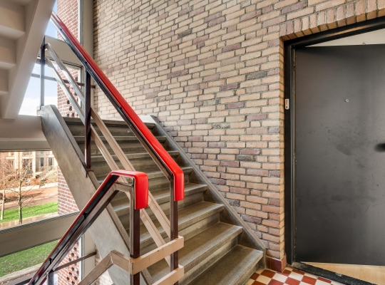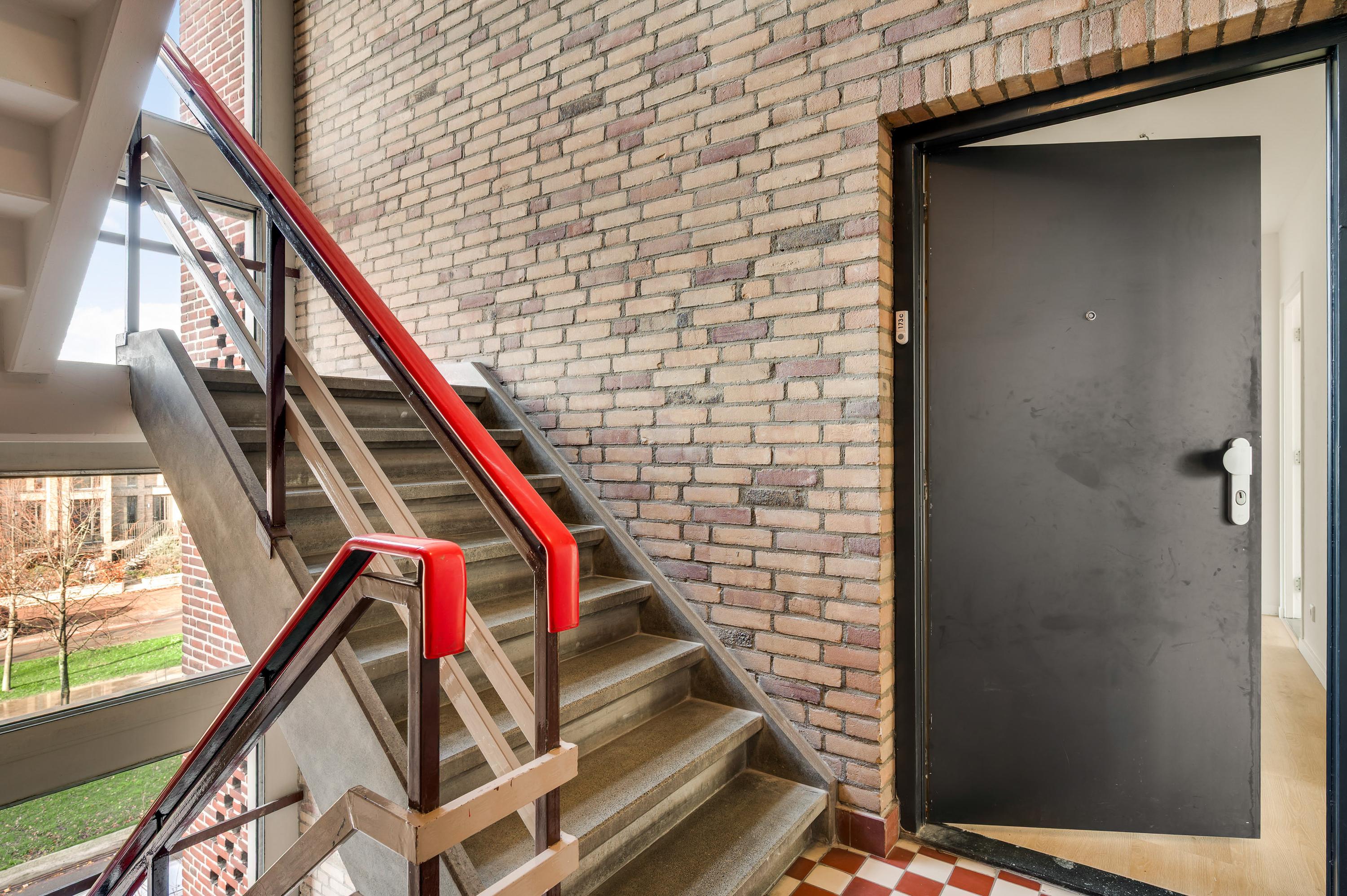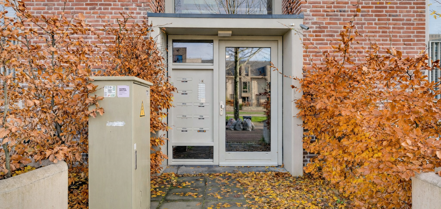 Aan de buitenzijde van de vernieuwde entree zijn de brievenbussen, het bellentableau en de intercom. In de aansluitende hal en het trappenhuis is de sfeer van de jaren ’60 tijdens de renovatie behouden.