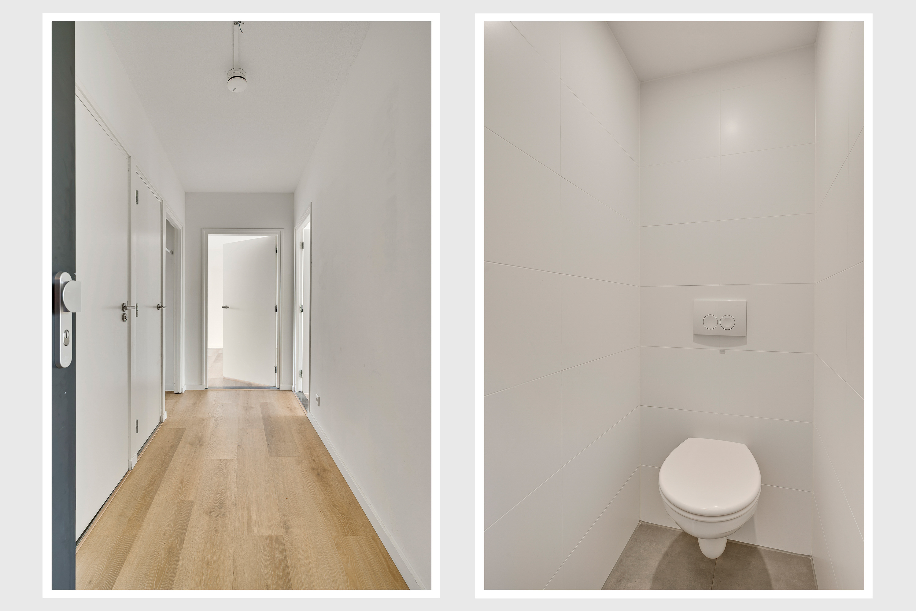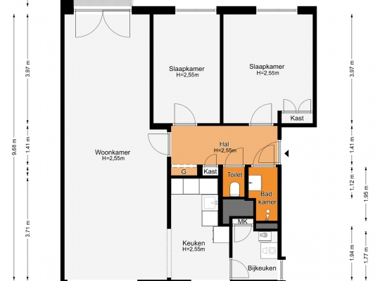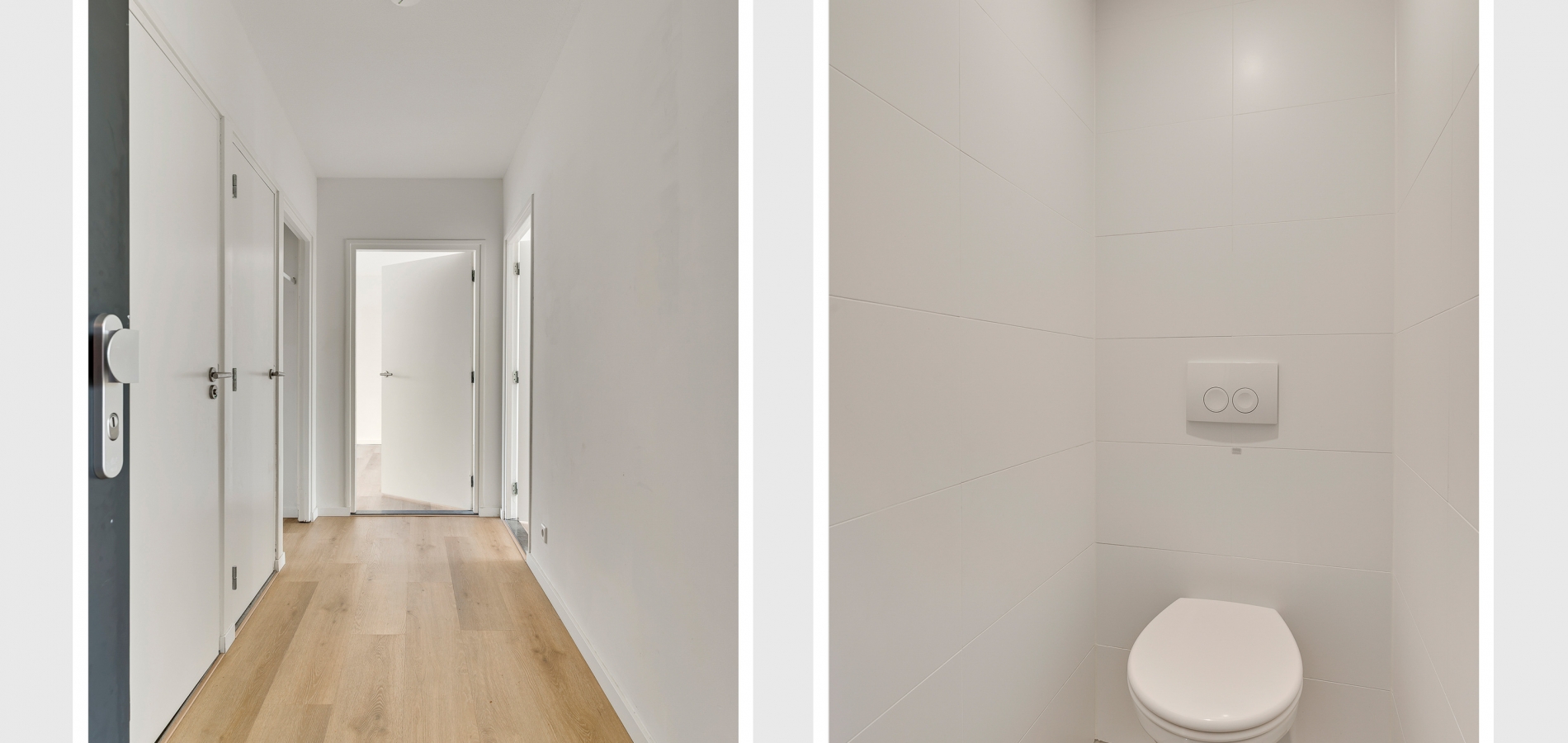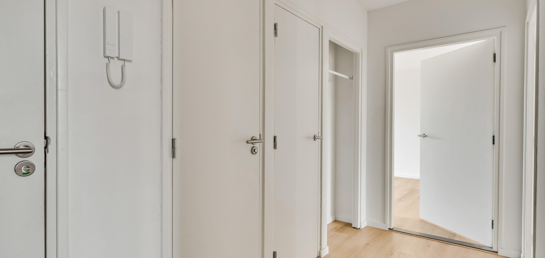Als nieuwe bewoner van dit appartement hoeft u niets te doen, behalve te verhuizen. In de hal (circa 3,88 x 1,41) ziet u een mooie vloer-, wand- en plafondafwerking in lichte kleuren. Aan de linkerzijde zijn een bergkast en een garderobenis, waardoor de hal heel ruimtelijk oogt.