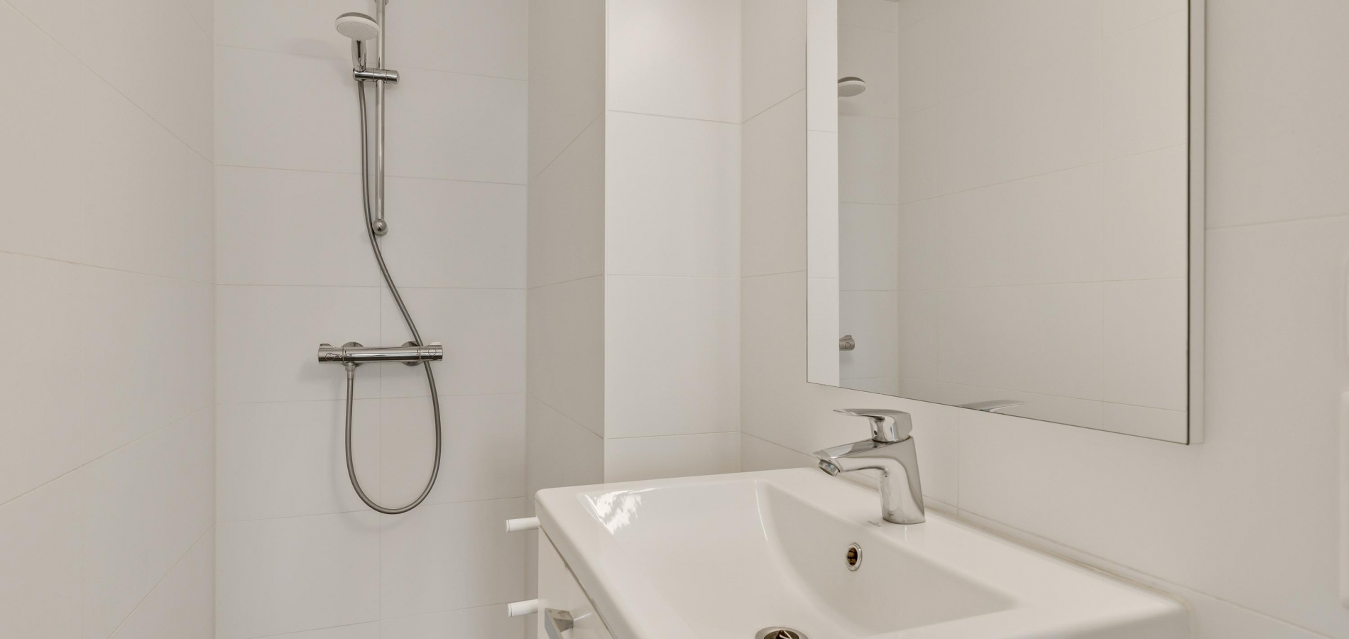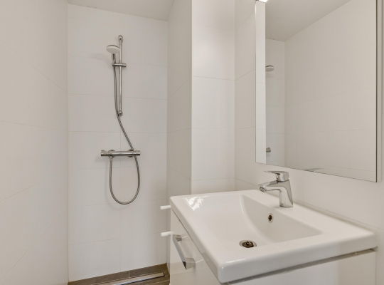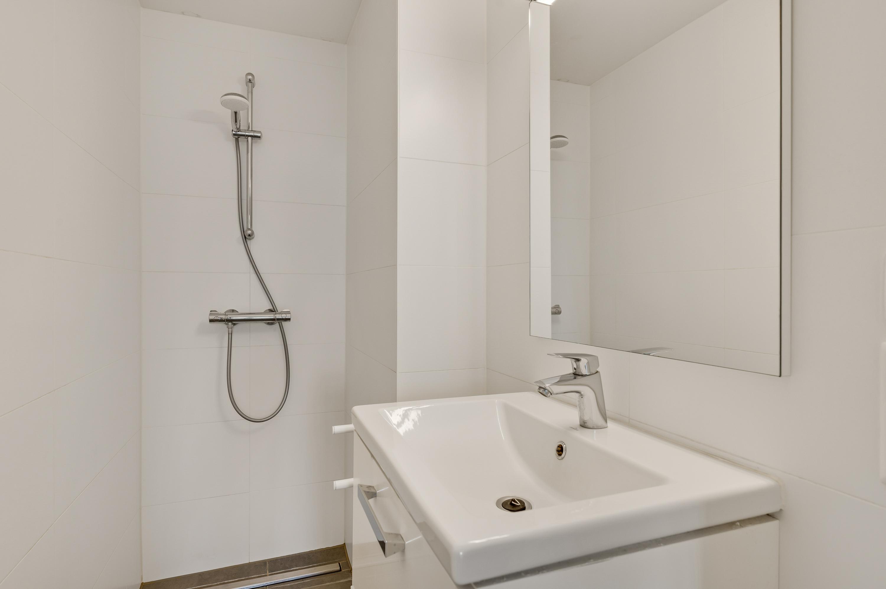 De badkamer is ingedeeld met een inloopdouche en een wastafelmeubel. Boven de wastafel hangt een grote spiegel en de douche is voorzien van een thermostaatkraan. Naast de badkamer is de toiletruimte, uitgevoerd in dezelfde stijl.