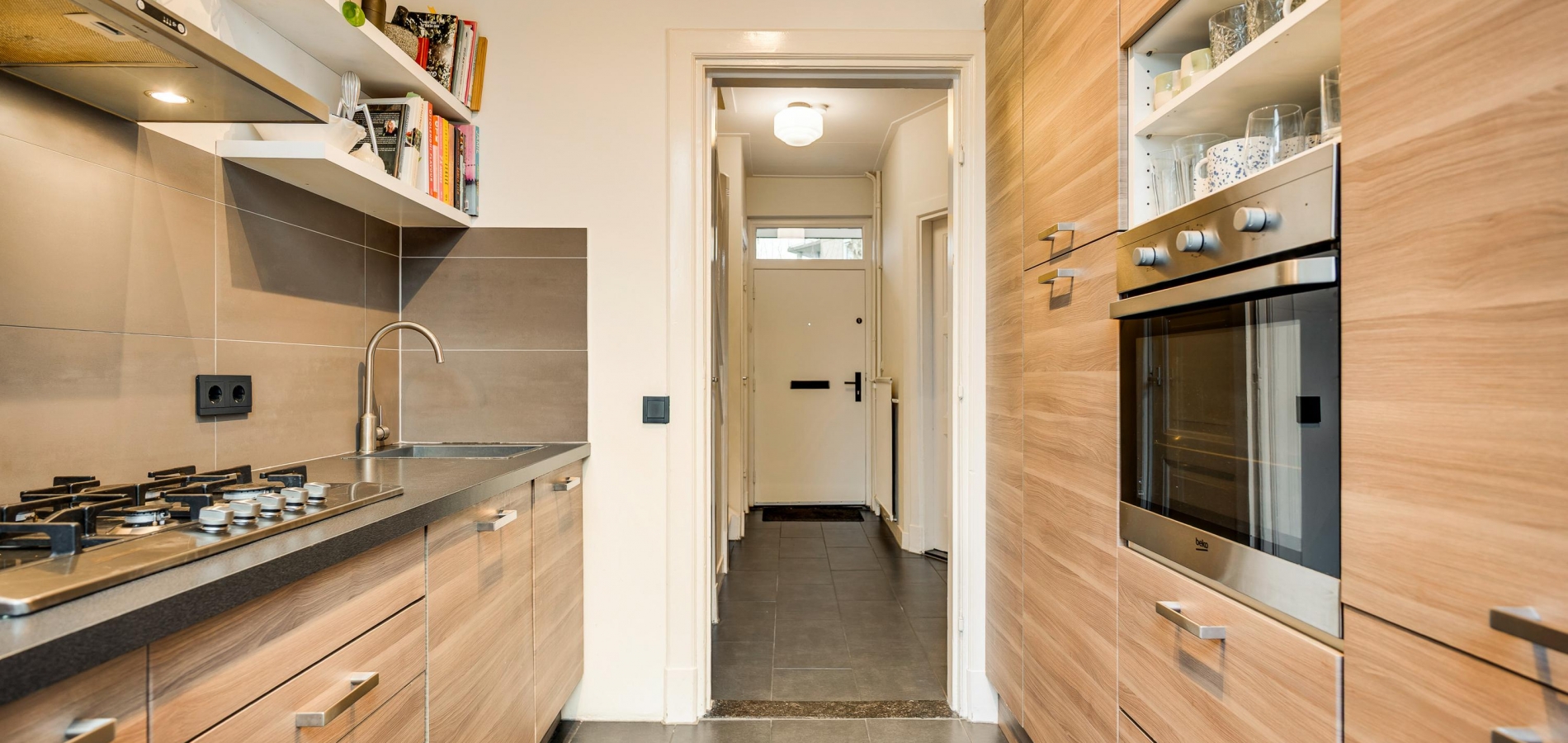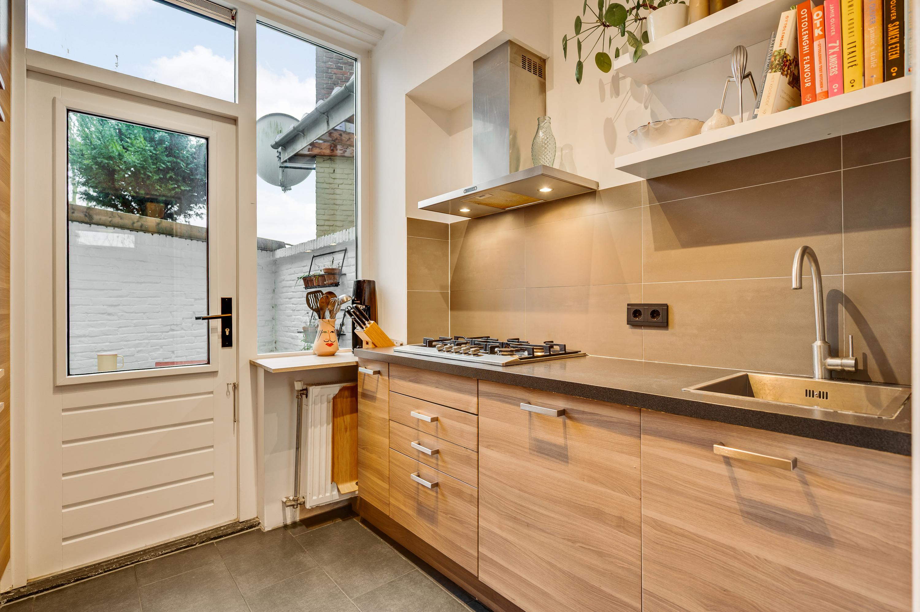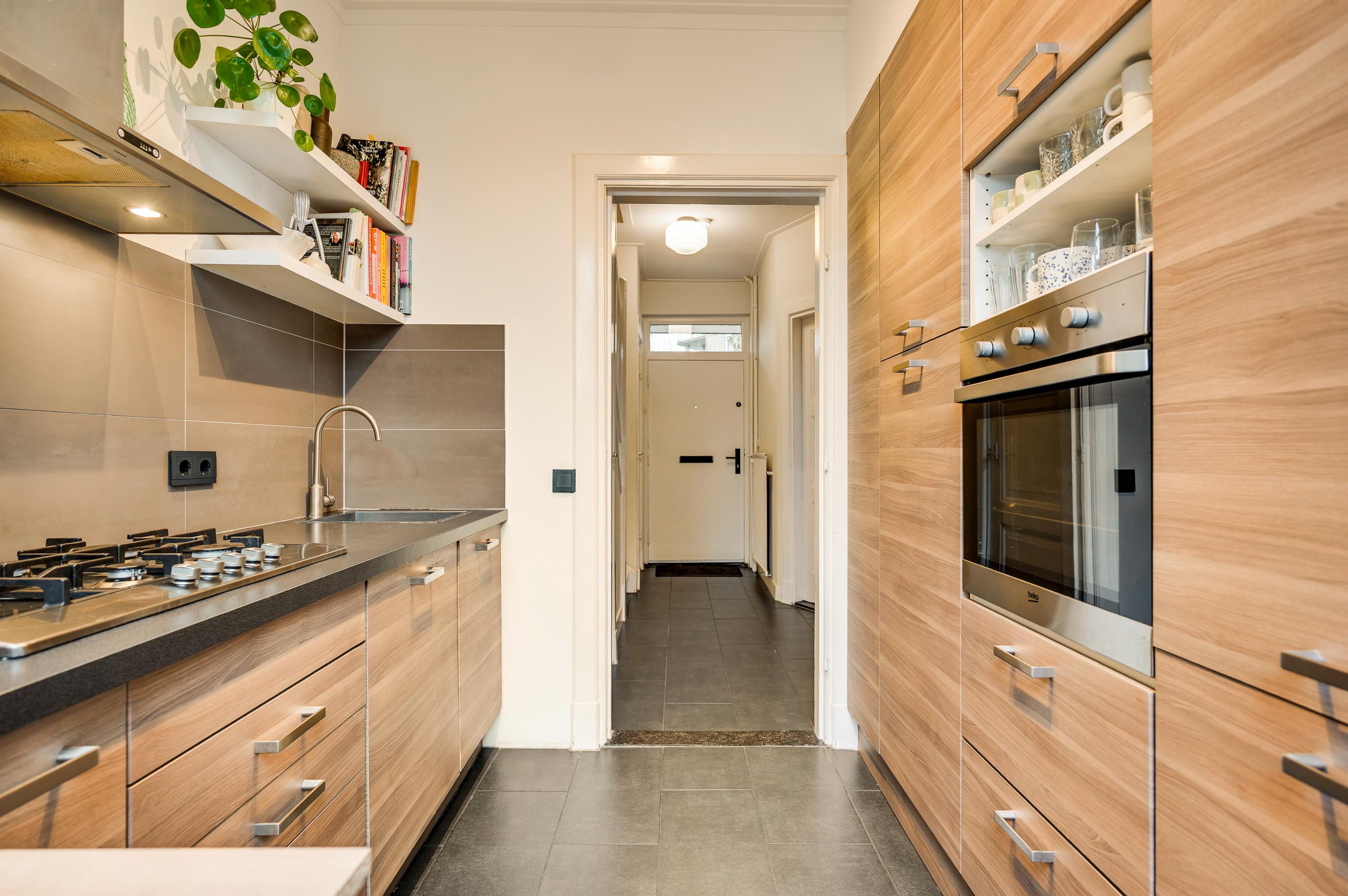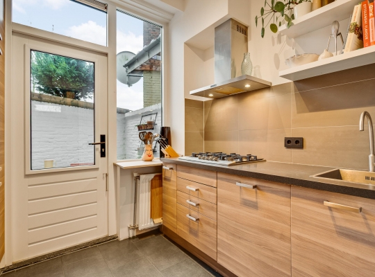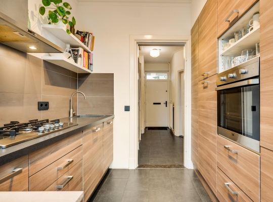 De vernieuwde keuken (circa 2,39 x 2,53) grenst aan de patio, waar u heerlijk buiten kunt zitten. In de keuken staan een wandopstelling en een grote kastenwand, met ruim voldoende bergruimte en alle benodigde inbouwapparatuur: een gasfornuis, afzuigkap, koelkast, vriezer, oven en een vaatwasser.