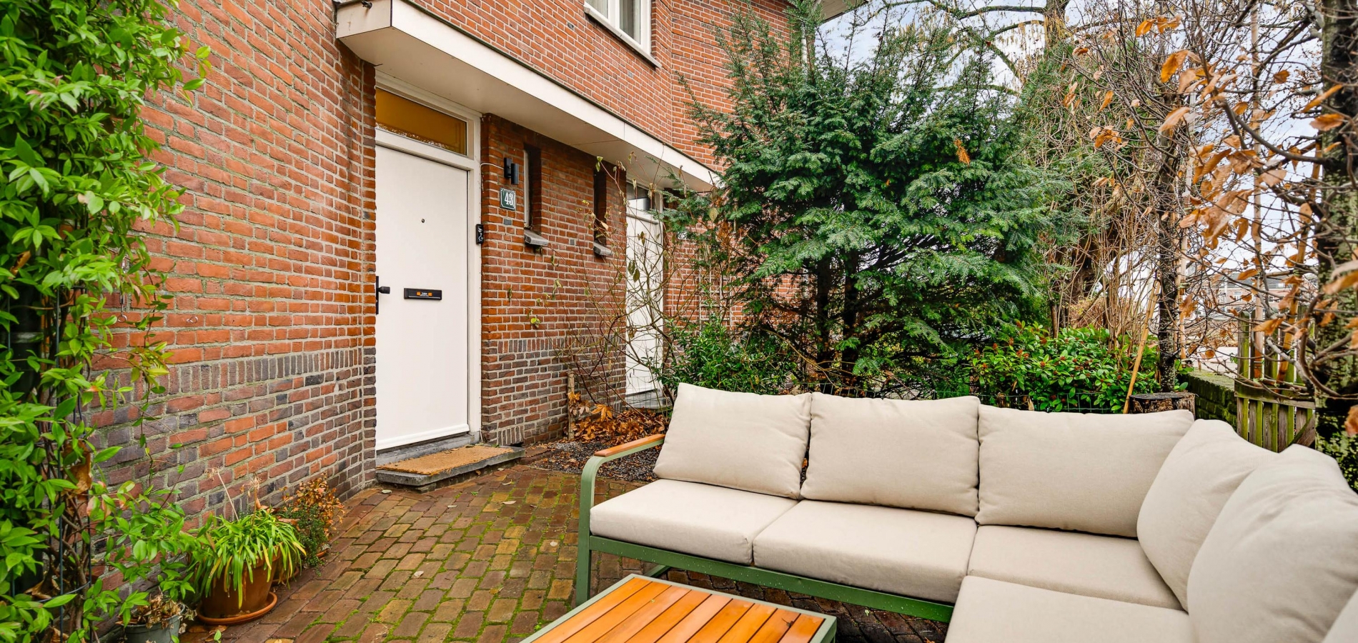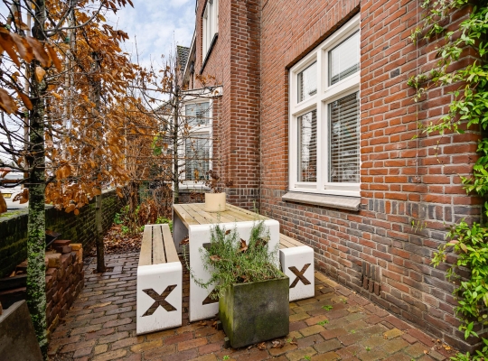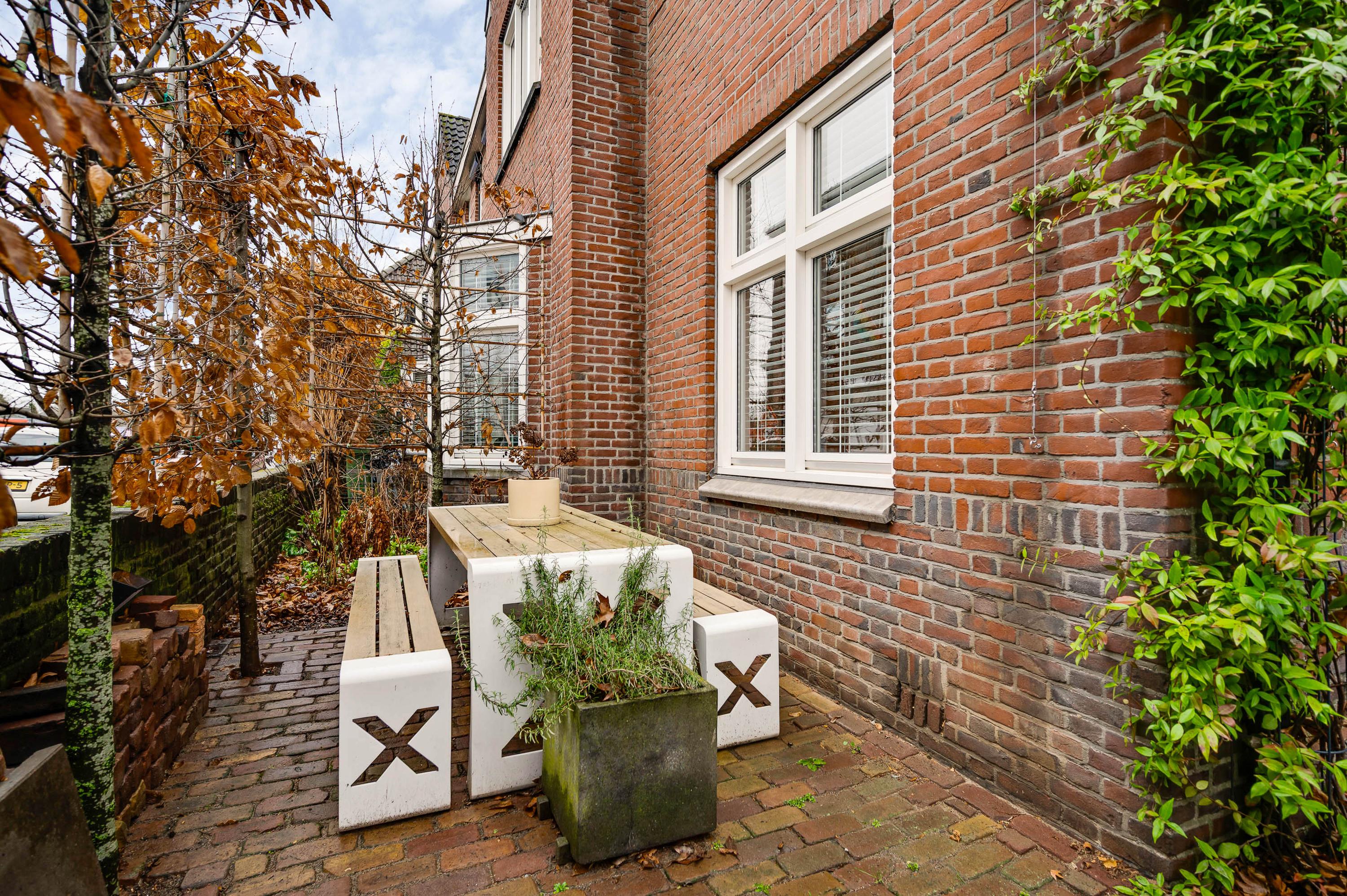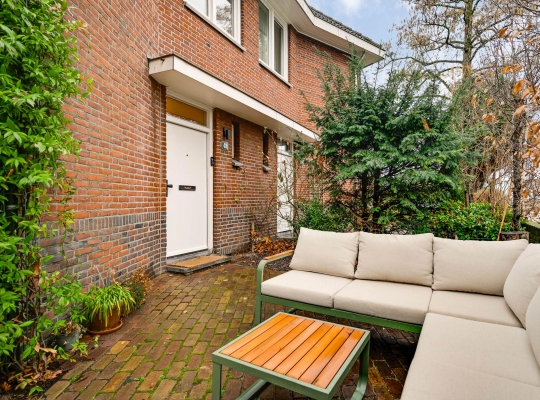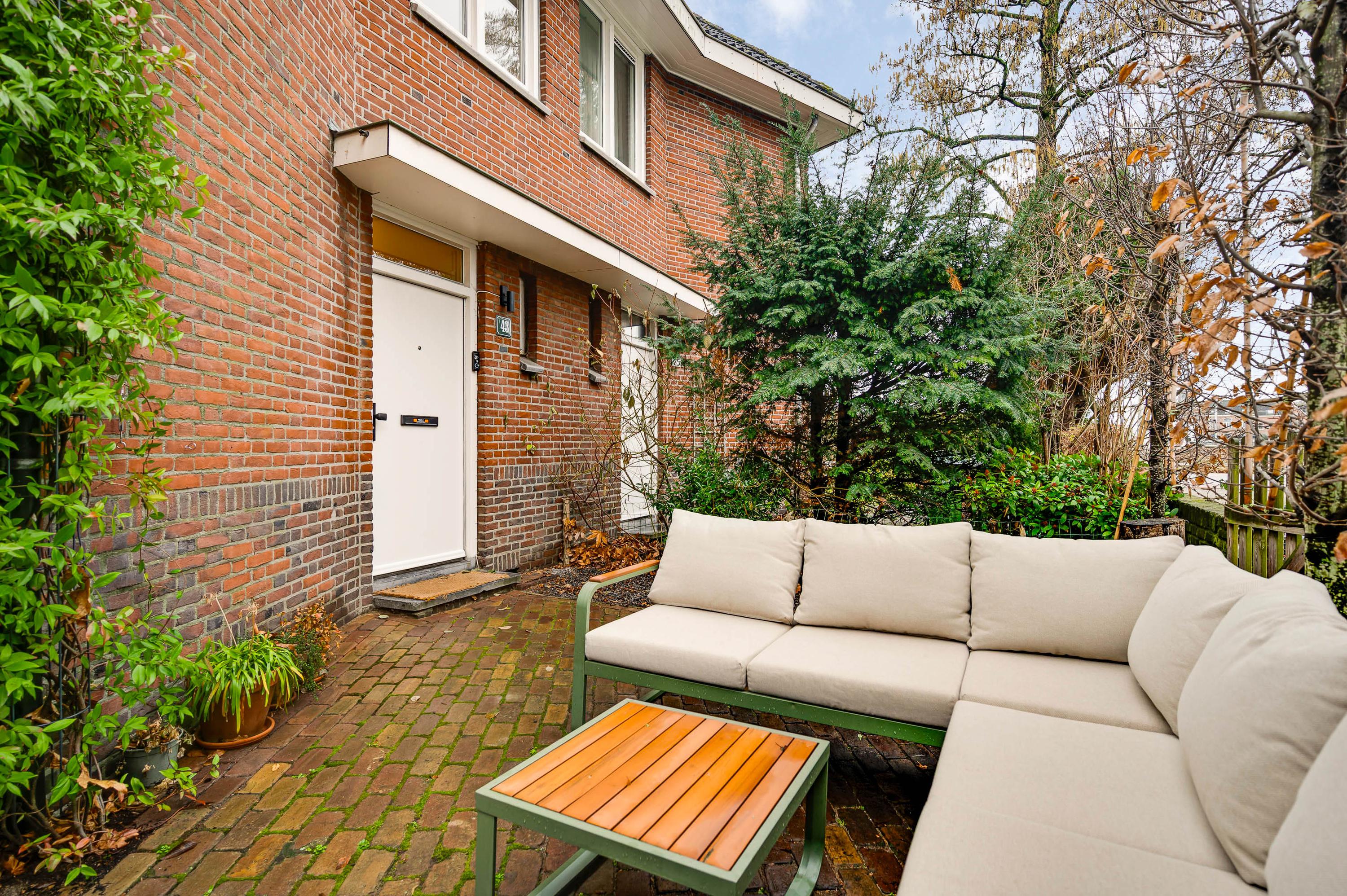 Niet alleen de patio, maar ook de tuin aan de voorzijde biedt genoeg ruimte om buiten te zitten. Een deel van de tuin is gesitueerd op het noorden en het andere deel op het westen, waardoor er zowel zon als schaduw is. Leibomen zorgen voor privacy en een tuin met een aangename sfeer.