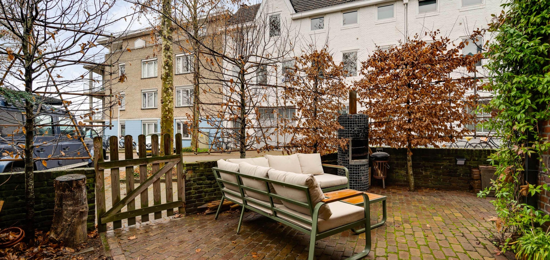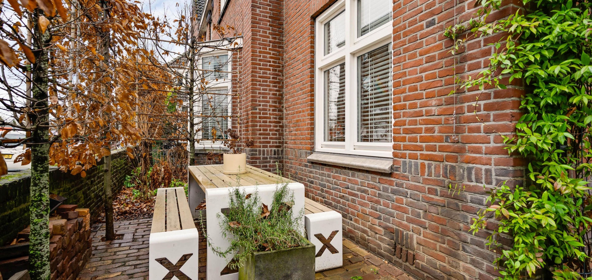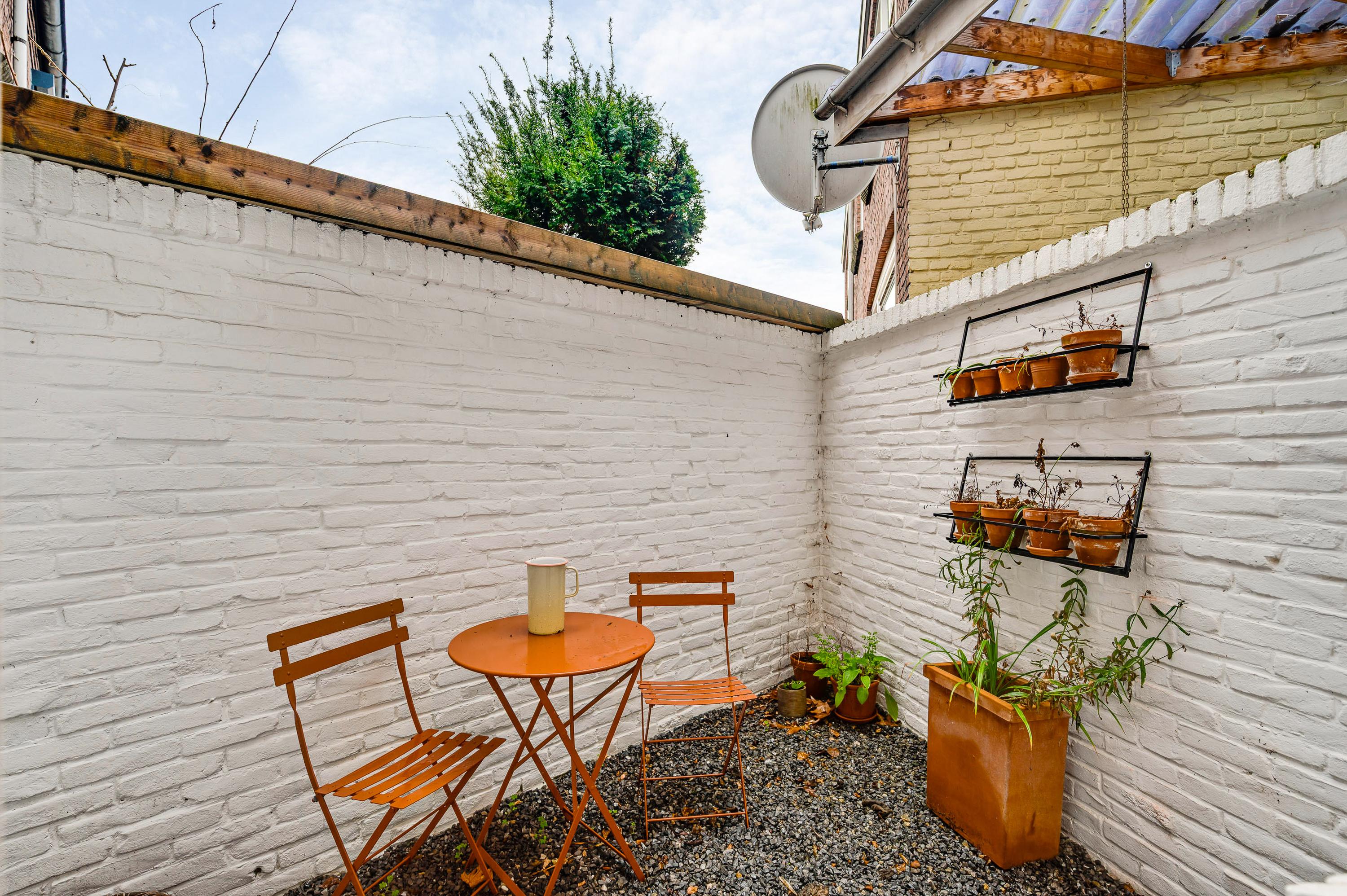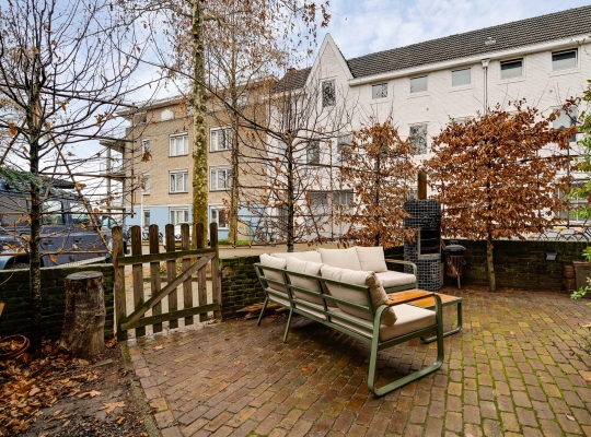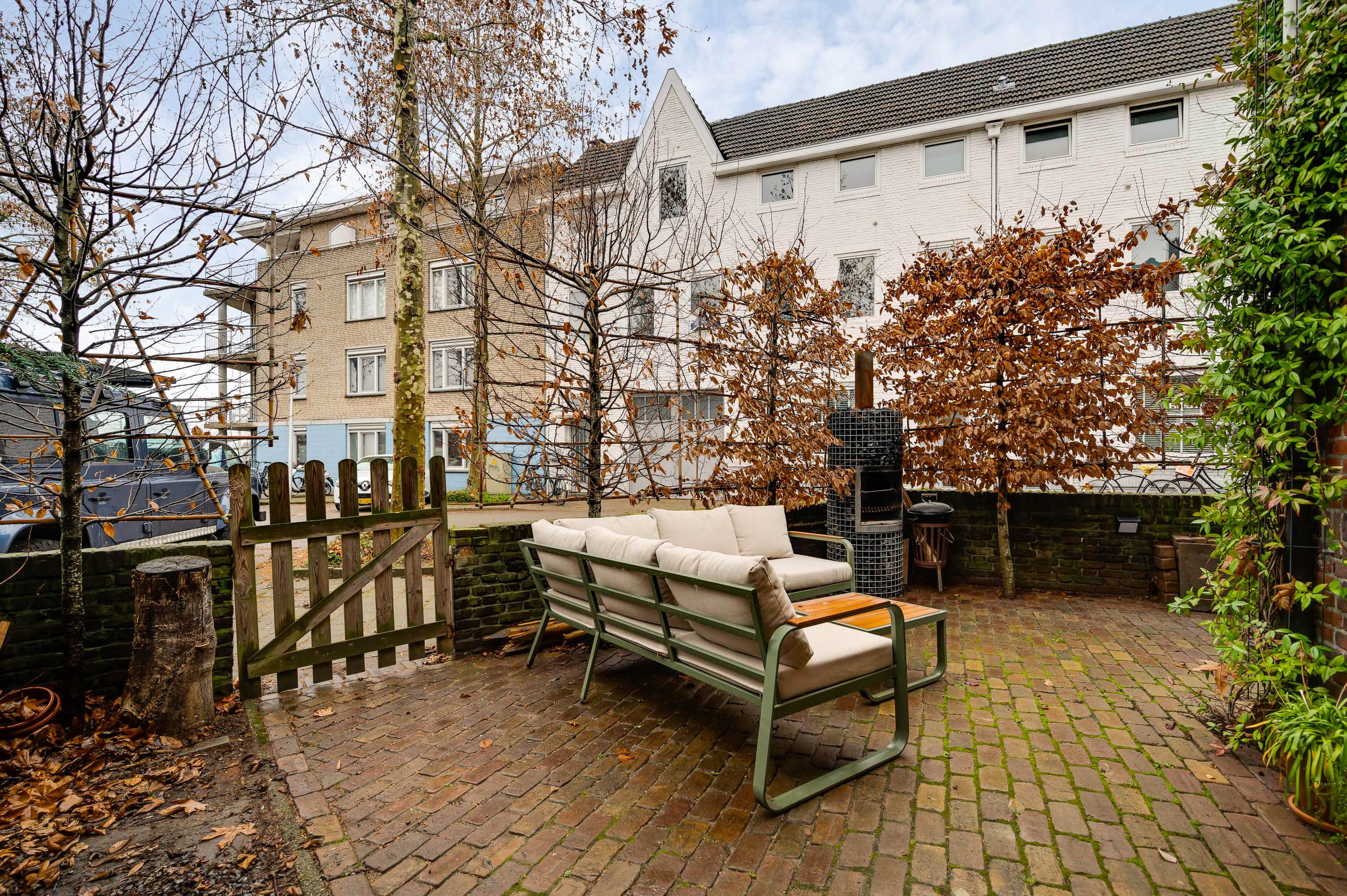 Niet alleen de patio, maar ook de tuin aan de voorzijde biedt genoeg ruimte om buiten te zitten. Een deel van de tuin is gesitueerd op het noorden en het andere deel op het westen, waardoor er zowel zon als schaduw is. Leibomen zorgen voor privacy en een tuin met een aangename sfeer.