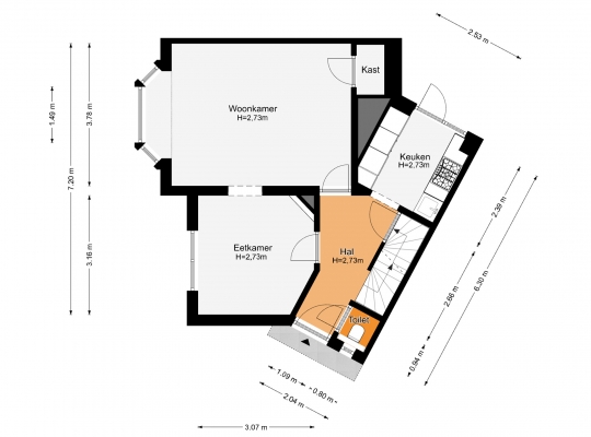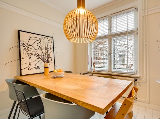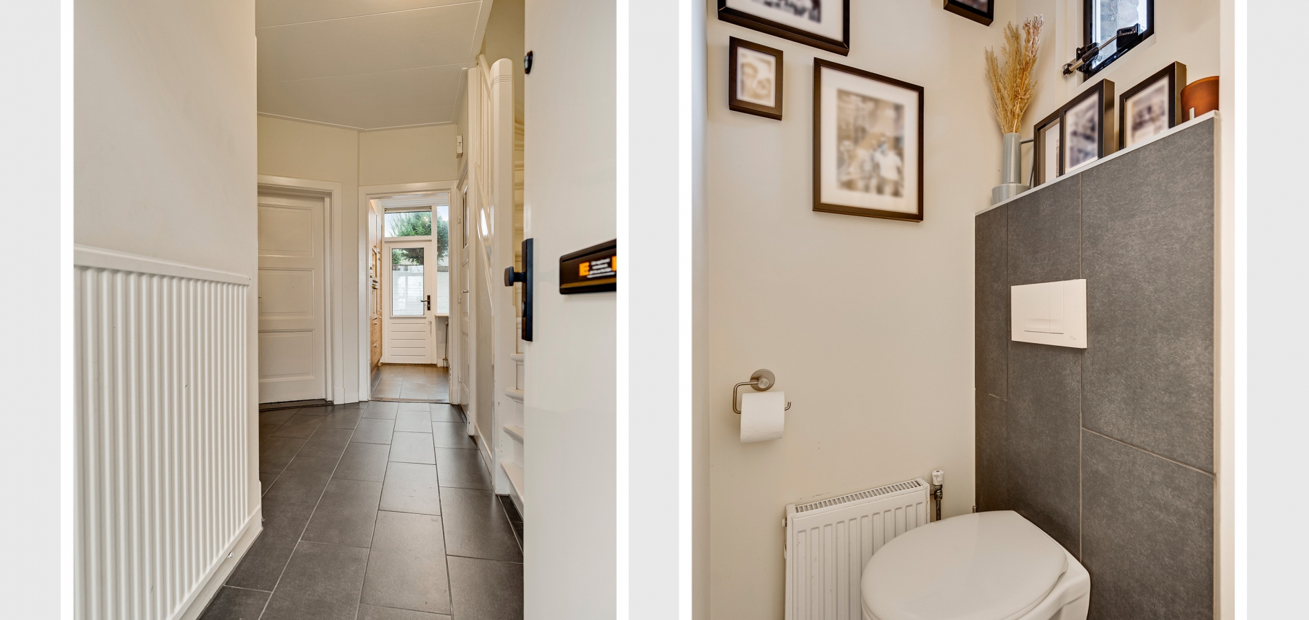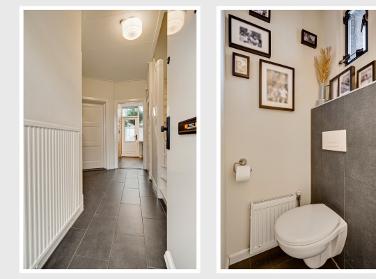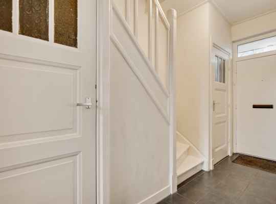 In de hal valt uw oog niet alleen op de paneeldeuren, maar ook op de fraaie trap en het meer dan 2.70 meter hoge plafond. Vanaf hier heeft u toegang tot de woonkamer, eetkamer, keuken en de toiletruimte met wandcloset.